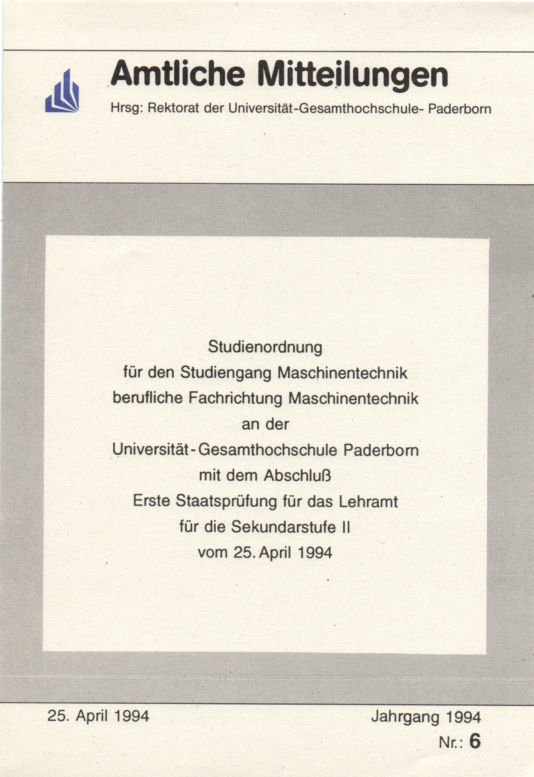Studienordnung für den Studiengang Maschinentechnik, berufliche Fachrichtung Maschinentechnik, an der Universität - Gesamthochschule Paderborn mit dem Abschluß Erste Staatsprüfung für das Lehramt für die Sekundarstufe II : vom 25. April 1994