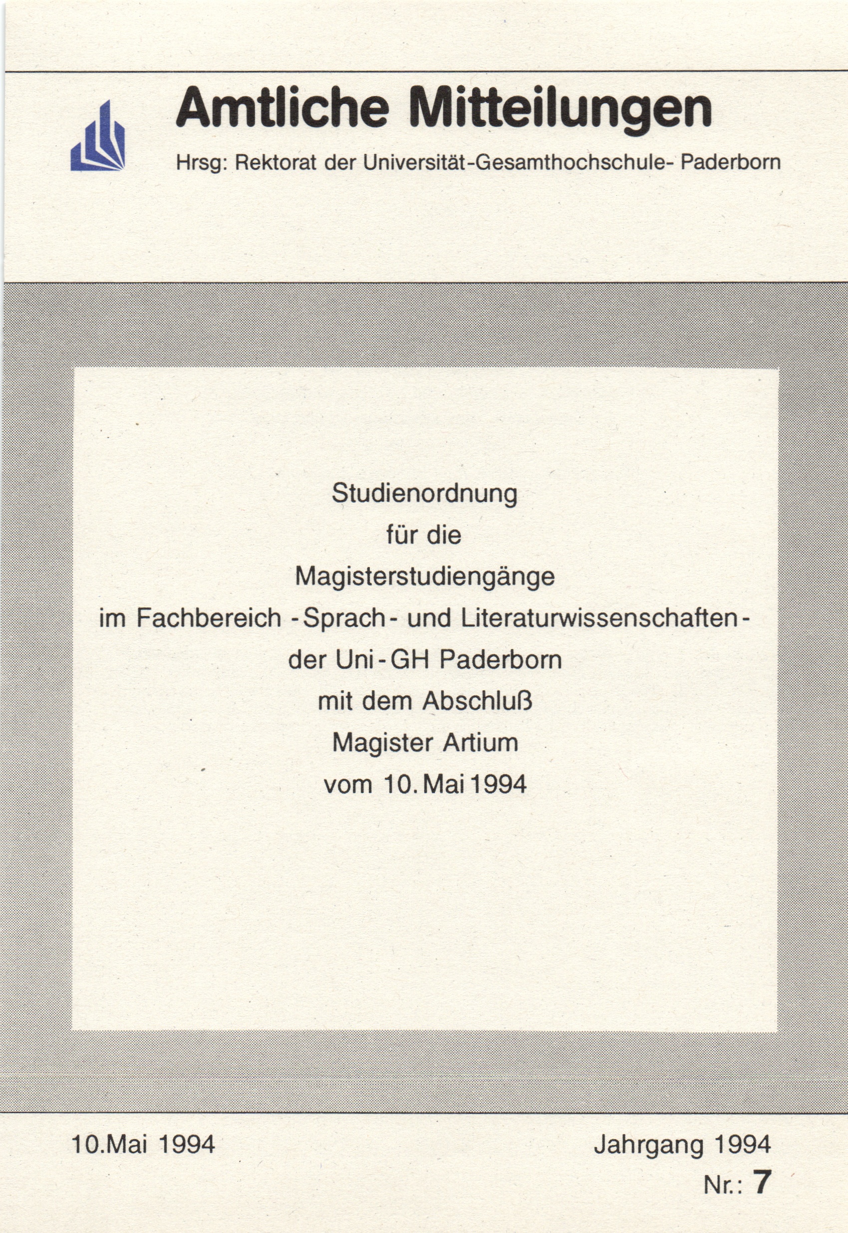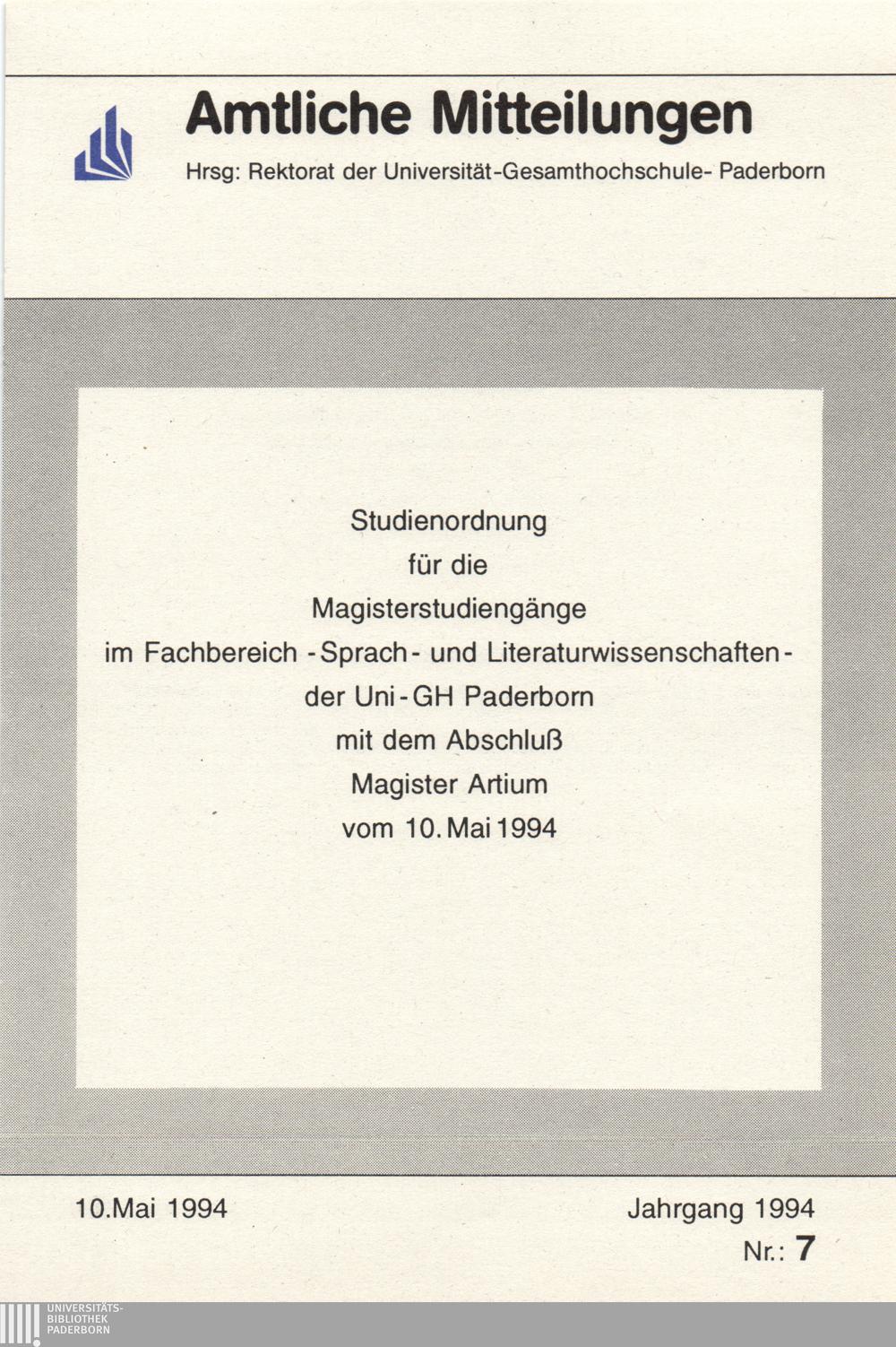 Studienordnung für die Magisterstudiengänge im Fachbereich [3]- Sprach- und Literaturwissenschaften- der Uni-GH Paderborn mit dem Abschluß Magister Artium [(M.A.), Magistra Artium (M.A.)] : vom 10. Mai 1994