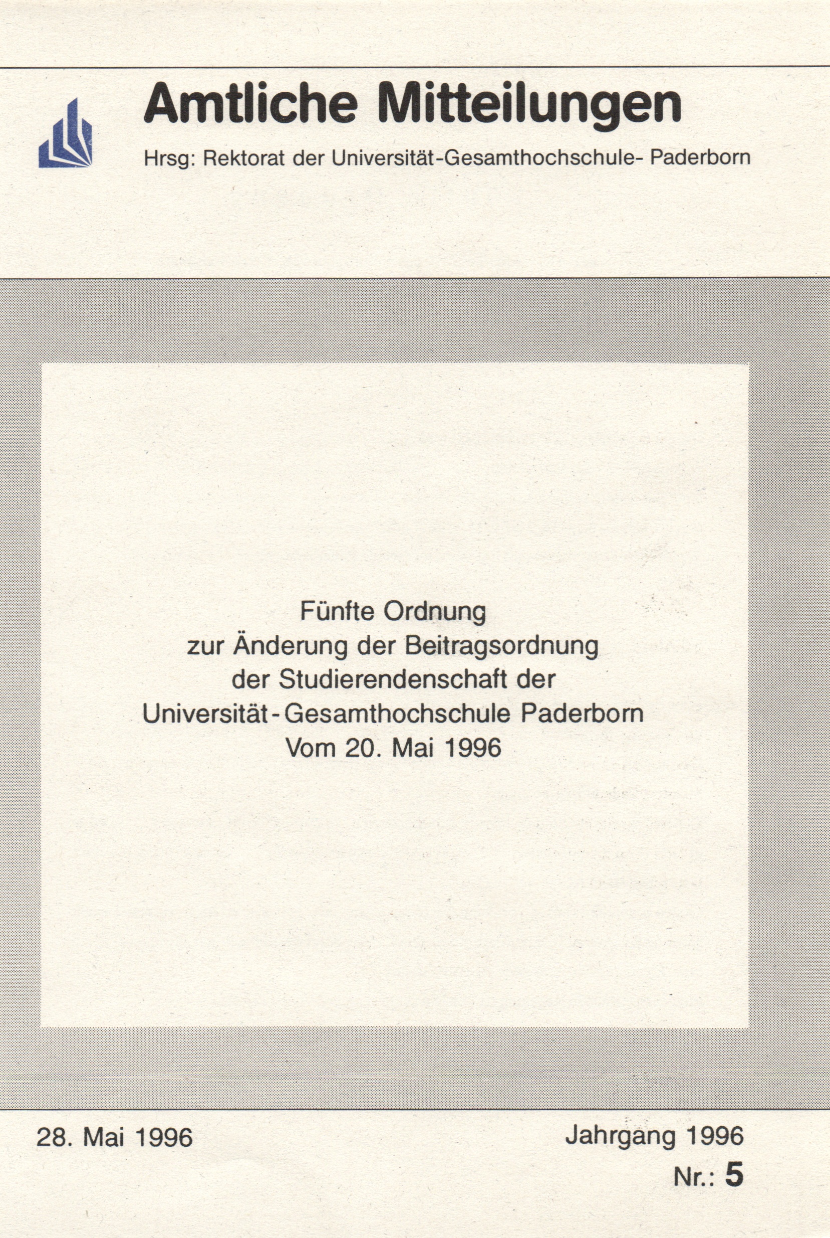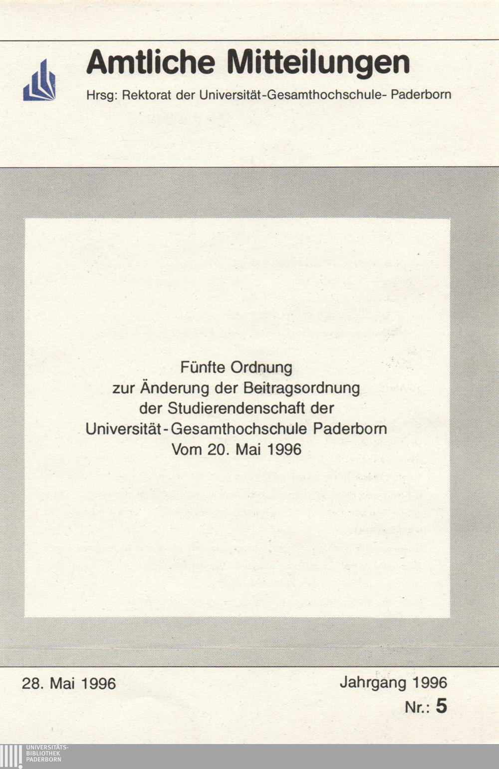Fünfte Ordnung zur Änderung der Beitragsordnung der Studierendenschaft der Universität - Gesamthochschule Paderborn : vom 20. Mai 1996