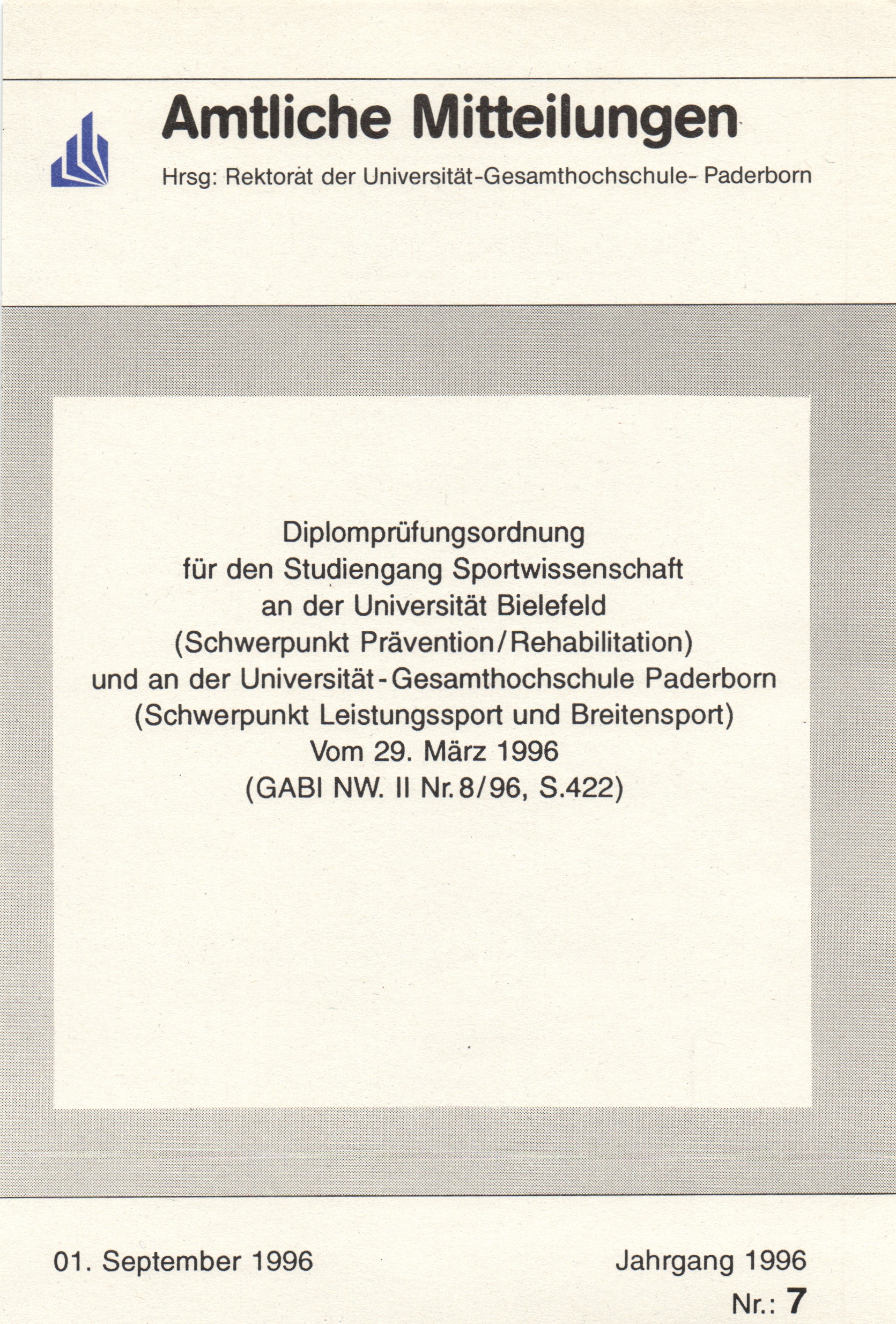 Diplomprüfungsordnung für den Studiengang Sportwissenschaft an der Universität Bielefeld (Schwerpunkt Prävention, Rehabilitation) und an der Universität-Gesamthochschule Paderborn (Schwerpunkt Leistungssport und Breitensport) : vom 29. März 1996 ; (GABl NW. II Nr. 8/96, S. 422)