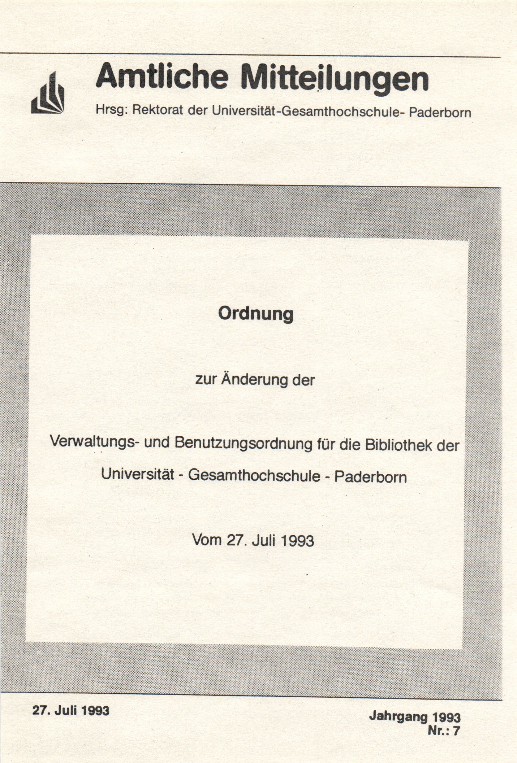 Ordnung zur Änderung der Verwaltungs- und Benutzungsordnung für die Bibliothek der Universität - Gesamthochschule - Paderborn : vom 27. Juli 1993