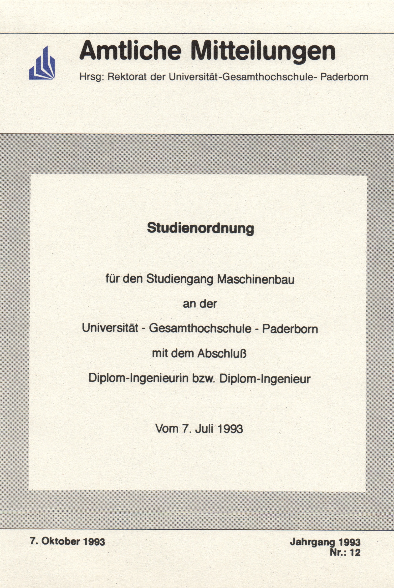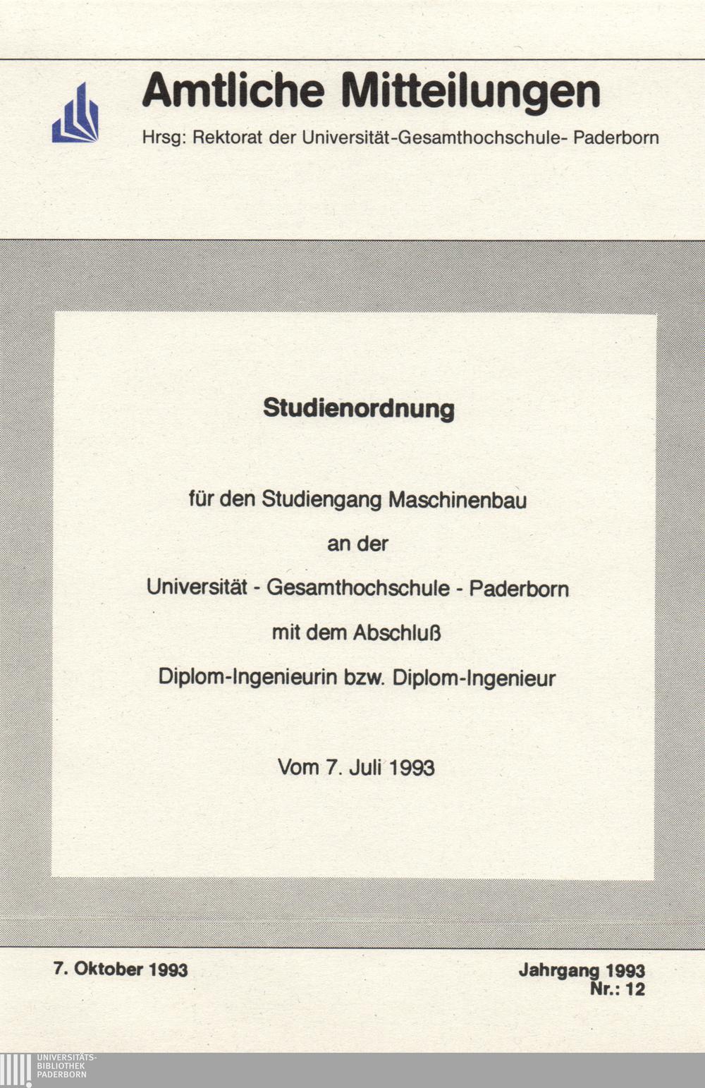 Studienordnung für den [integrierten] Studiengang Maschinenbau an der Universität - Gesamthochschule - Paderborn mit dem Abschluß Diplom-Ingenieurin bzw. Diplom-Ingenieur : vom 7. Juli 1993