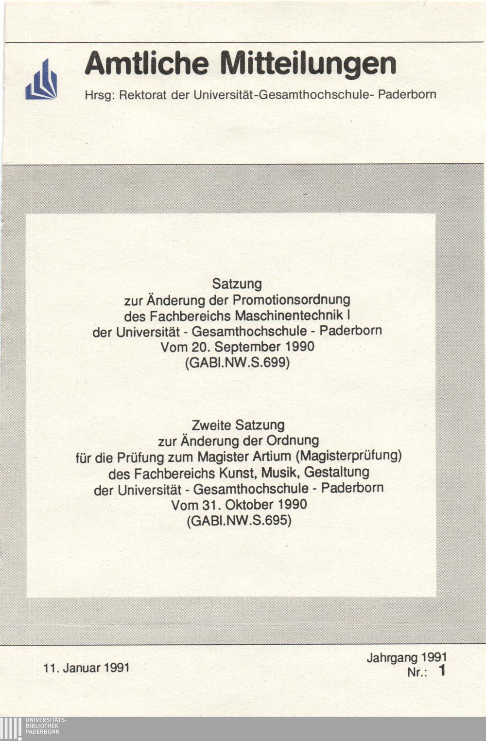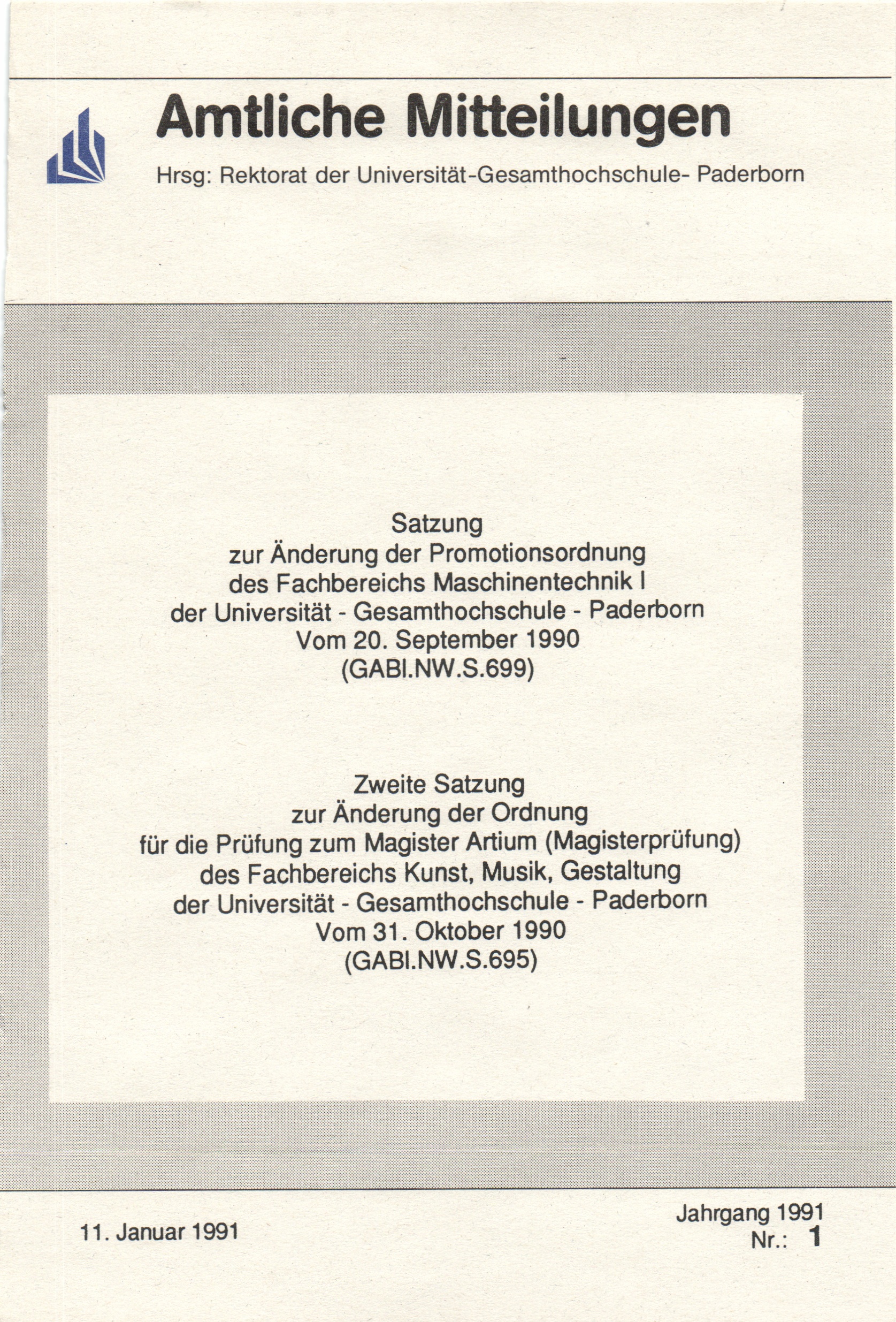 Satzung zur Änderung der Promotionsordnung des Fachbereichs Maschinentechnik I der Universität - Gesamthochschule - Paderborn : vom 20. September 1990