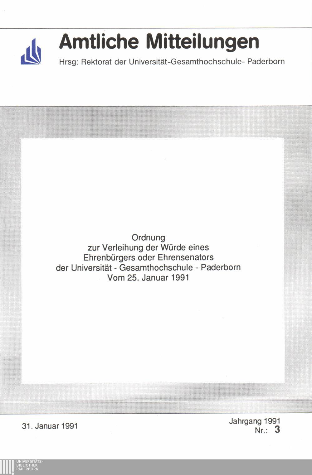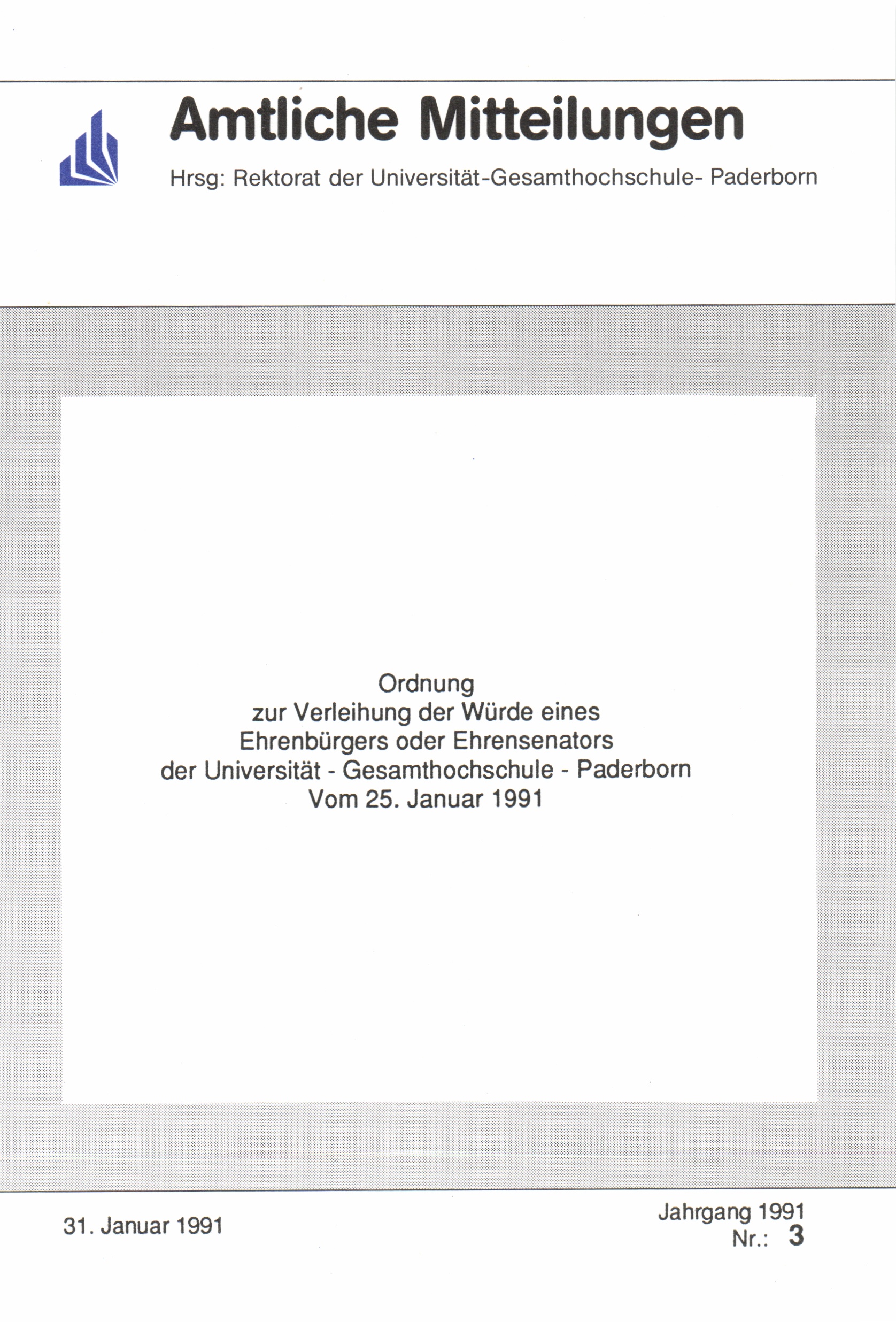Ordnung zur Verleihung der Würde eines Ehrenbürgers oder Ehrensenators an der Universität - Gesamthochschule - Paderborn vom 25. Januar 1991 : 31. Januar 1991