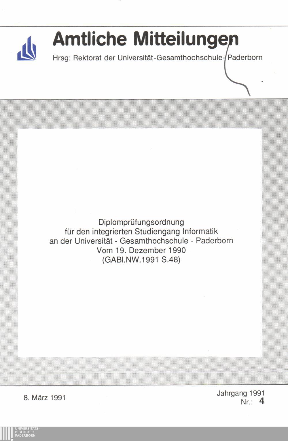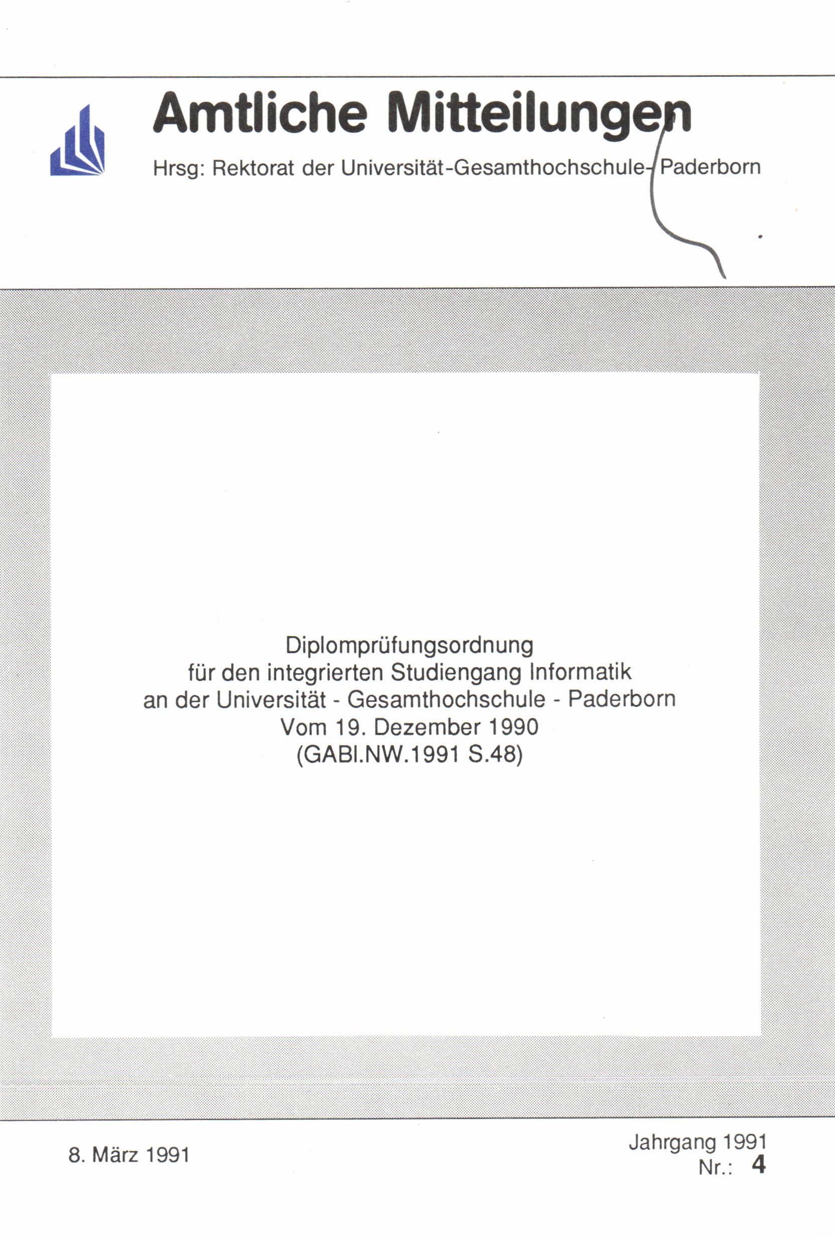 Diplomprüfungsordnung für den integrierten Studiengang Informatik an der Universität - Gesamthochschule - Paderborn vom 19. Dezember 1990 (GABL.1991 S. 48) : 8. März 1991