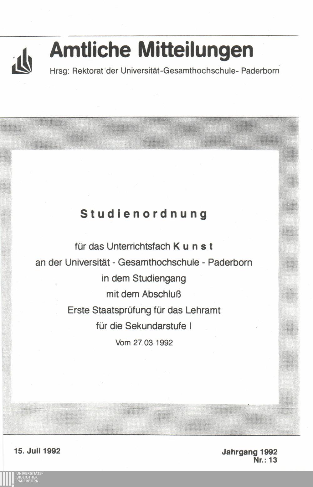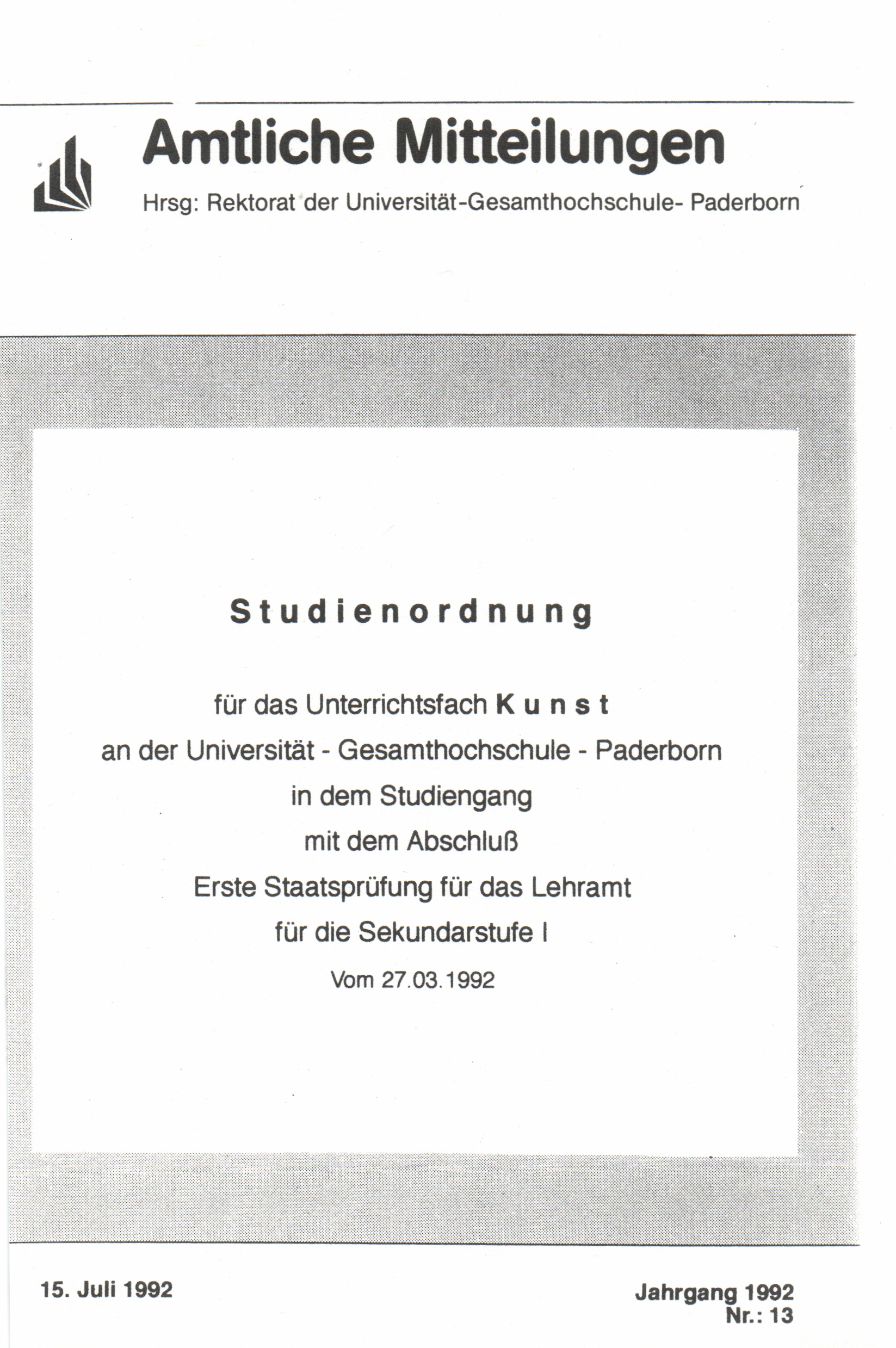 Studienordnung für das Unterrichtsfach "Kunst" an der Universität - Gesamthochschule - Paderborn in dem Studiengang mit dem Abschluß Erste Staatsprüfung für das Lehramt für die Sekundarstufe I : vom 27.03.1992