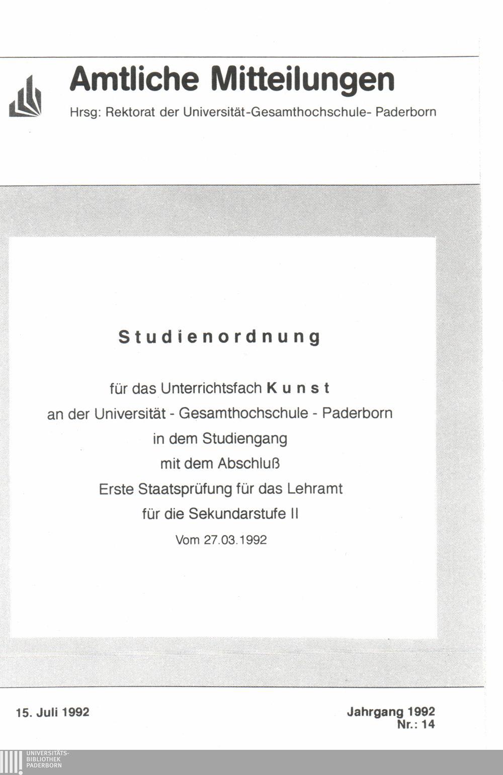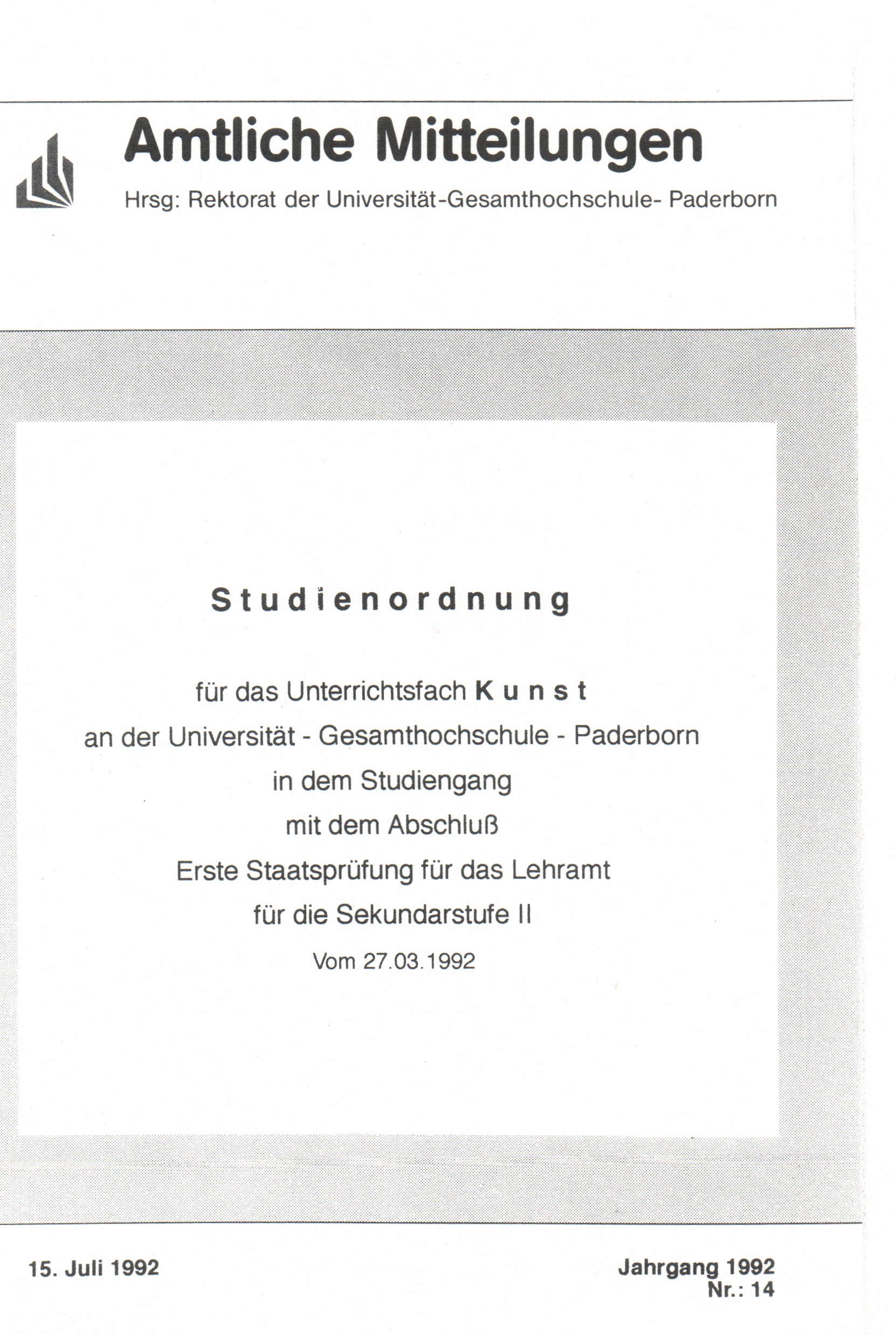 Studienordnung für das Unterrichtsfach "Kunst" an der Universität - Gesamthochschule - Paderborn in dem Studiengang mit dem Abschluß Erste Staatsprüfung für das Lehramt für die Sekundarstufe II : vom 27.03.1992