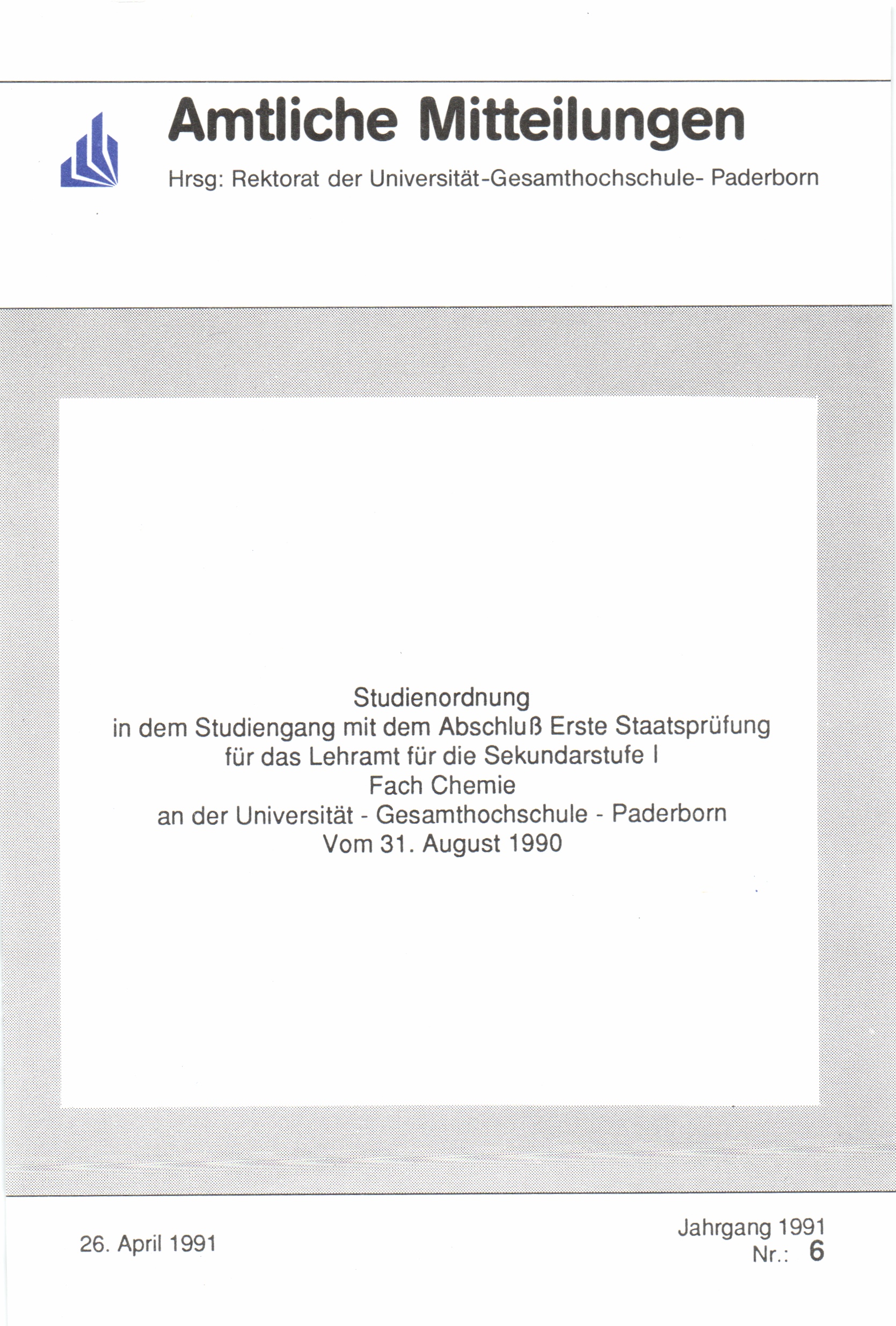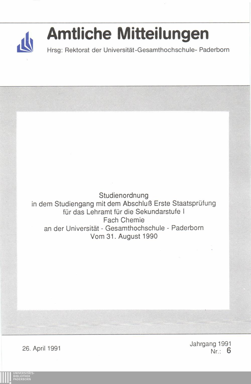 Studienordnung in dem Studiengang mit dem Abschluss Erste Staatsprüfung für das Lehramt für die Sekundarstufe I Fach Chemie an der Universität - Gesamthochschule - Paderborn : vom 31. August 1990