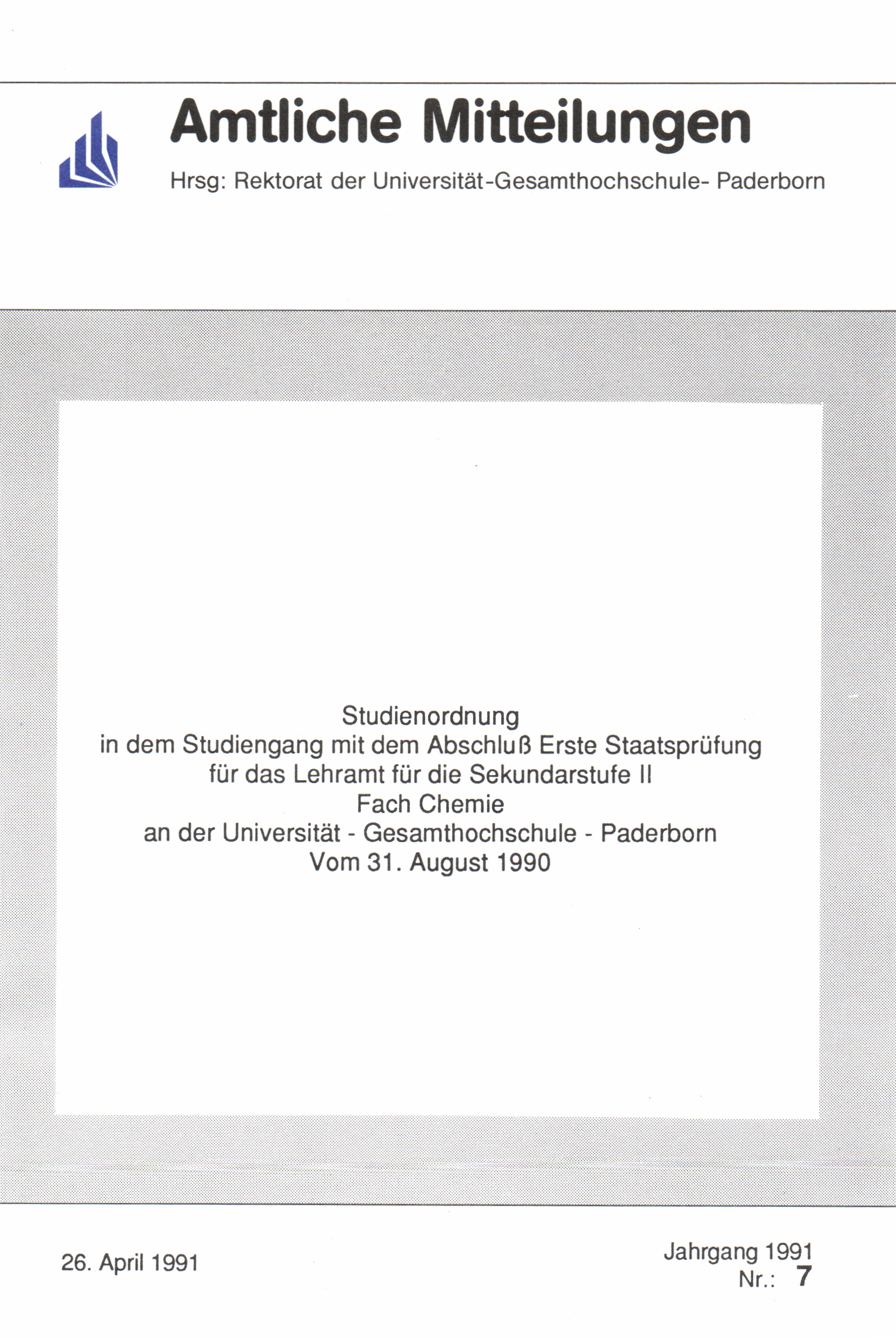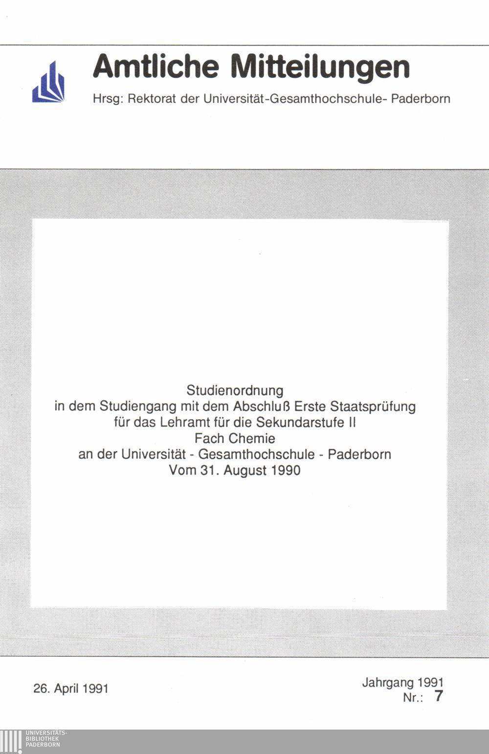 Studienordnung in dem Studiengang mit dem Abschluß Erste Staatsprüfung für das Lehramt für die Sekundarstufe II Fach Chemie an der Universität - Gesamthochschule - Paderborn : vom 31. August 1990