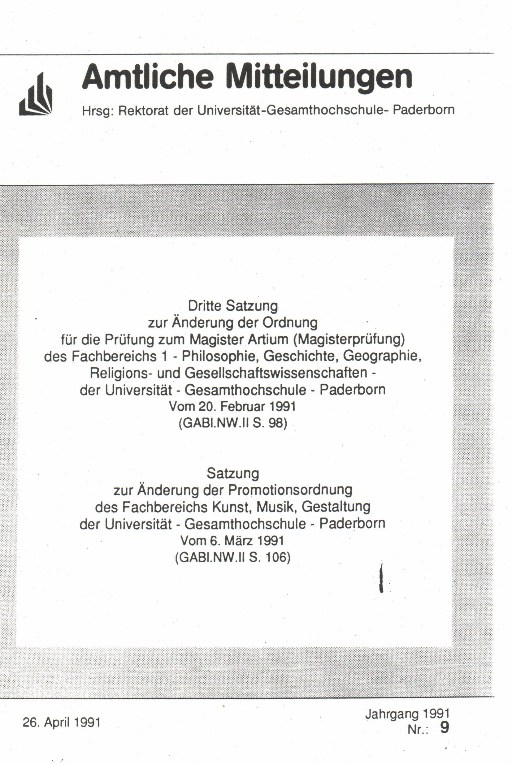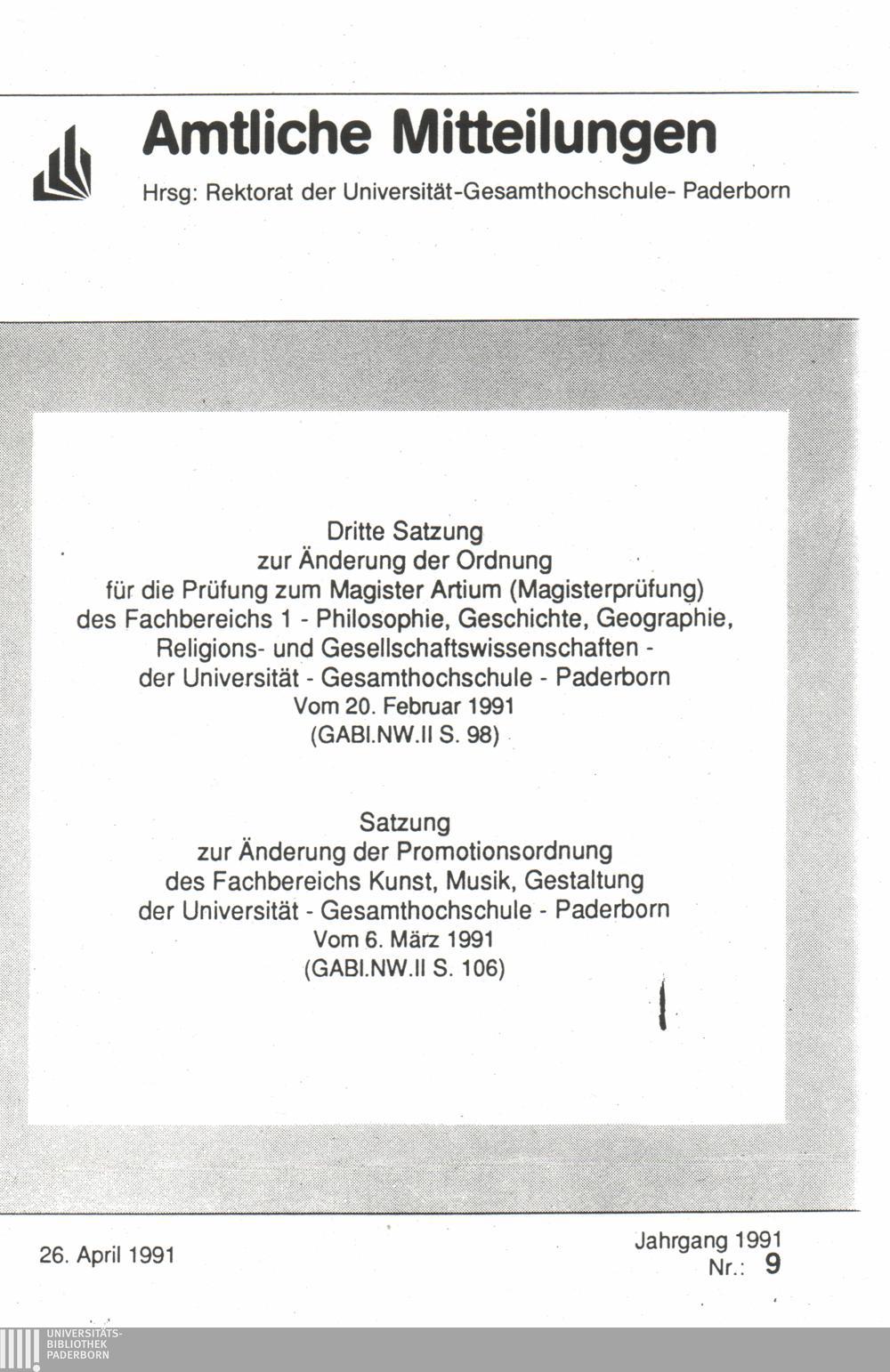 Dritte Satzung zur Änderung der Ordnung für die Prüfung zum Magister Artium (Magisterprüfung) des Fachbereichs 1 - Philosophie, Geschichte, Geographie, Religions- und Gesellschaftswissenschaften - der Universität - Gesamthochschule - Paderborn vom 20. Februar 1991 (GABL.NW.II S. 98) : 20. Februar 1991 (GABL.NW.II S. 98)