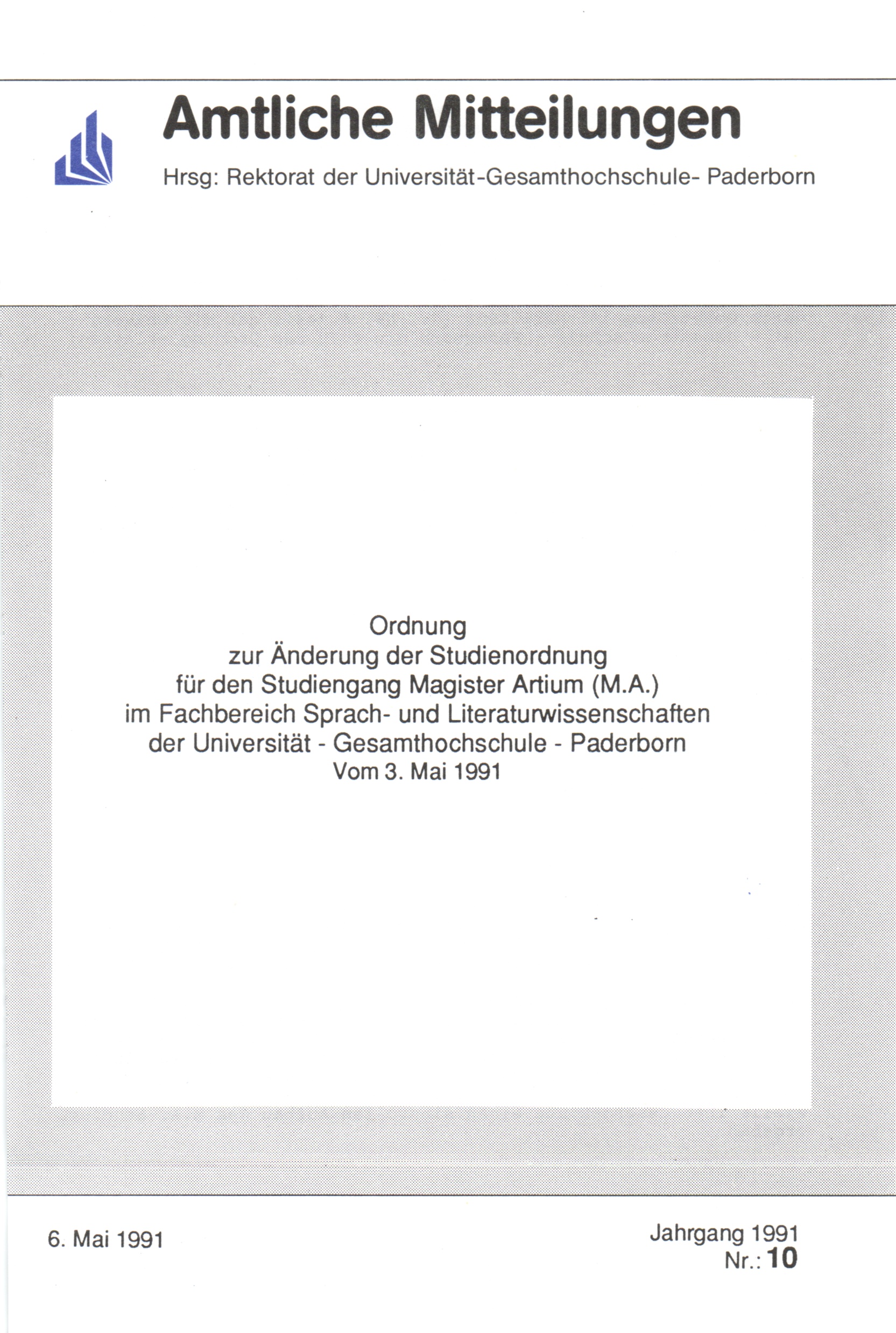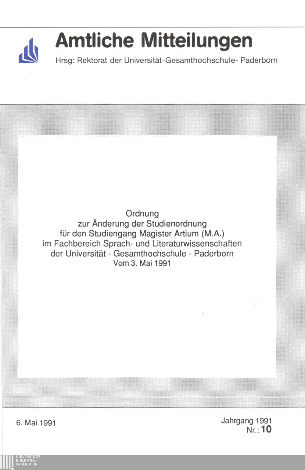Ordnung zur Änderung der Studienordnung für den Studiengang Magister Artium (M.A.) im Fachbereich Sprach- und Literaturwissenschaften der Universität - Gesamtchochschule - Paderborn : vom 3. Mai 1991