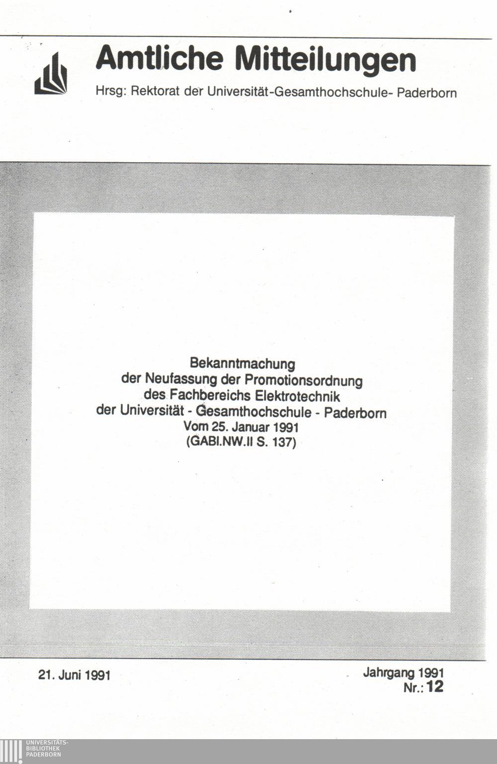 Bekanntmachung der Neufassung der Promotionsordnung des Fachbereichs Elektrotechnik an der Universität - Gesamthochschule - Paderborn vom 25. Januar 1991 (GABL.NW.II S. 137) : 21. Juni 1991