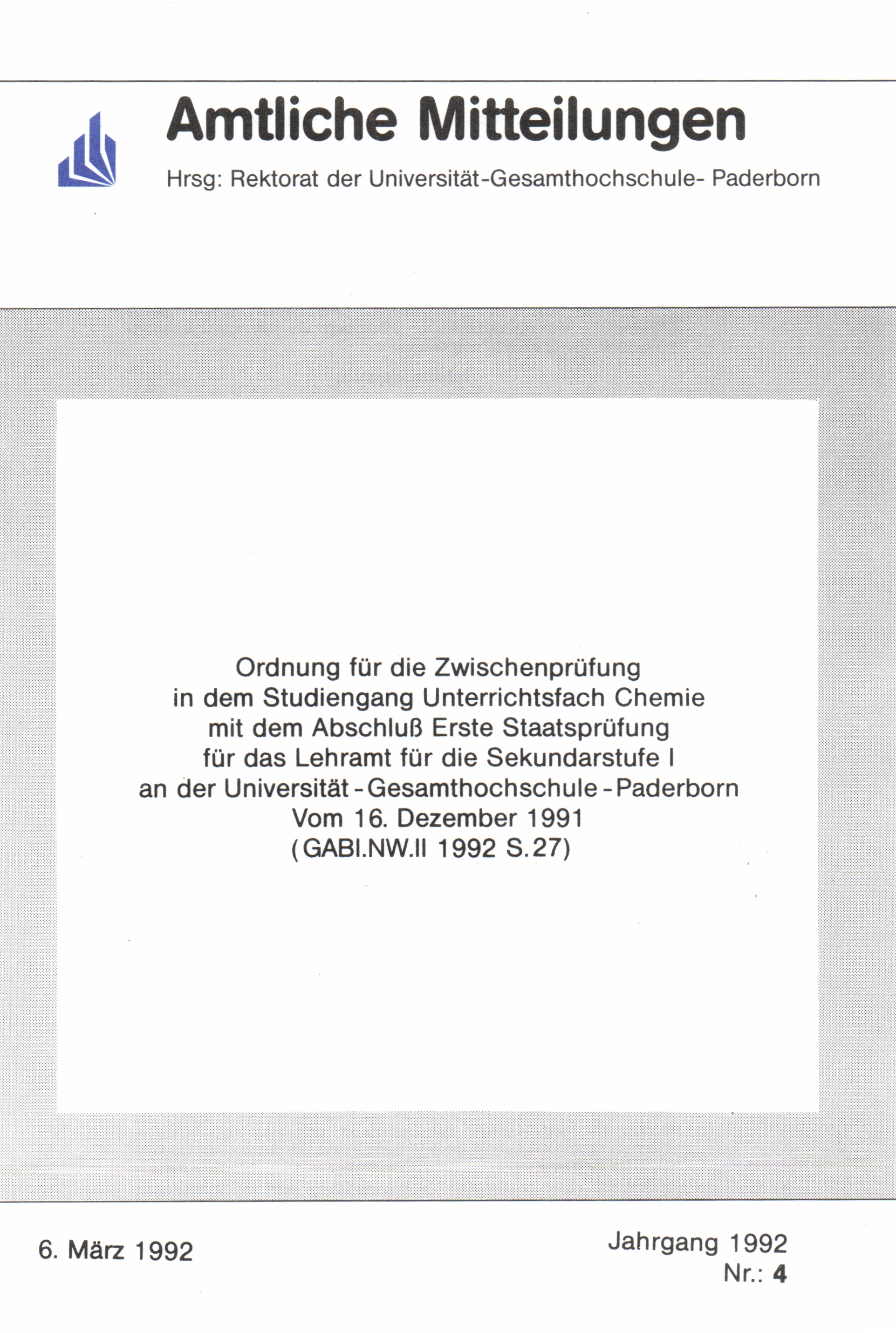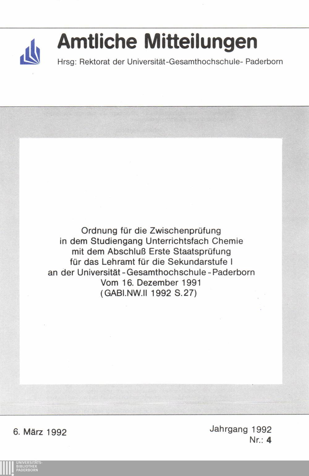 Ordnung für die Zwischenprüfung in dem Studiengang Unterrichtsfach Chemie mit dem Abschluß Erste Staatsprüfung für das Lehramt für die Sekundarstufe I an der Universität - Gesamthochschule - Paderborn : vom 16. Dezember 1991 ;