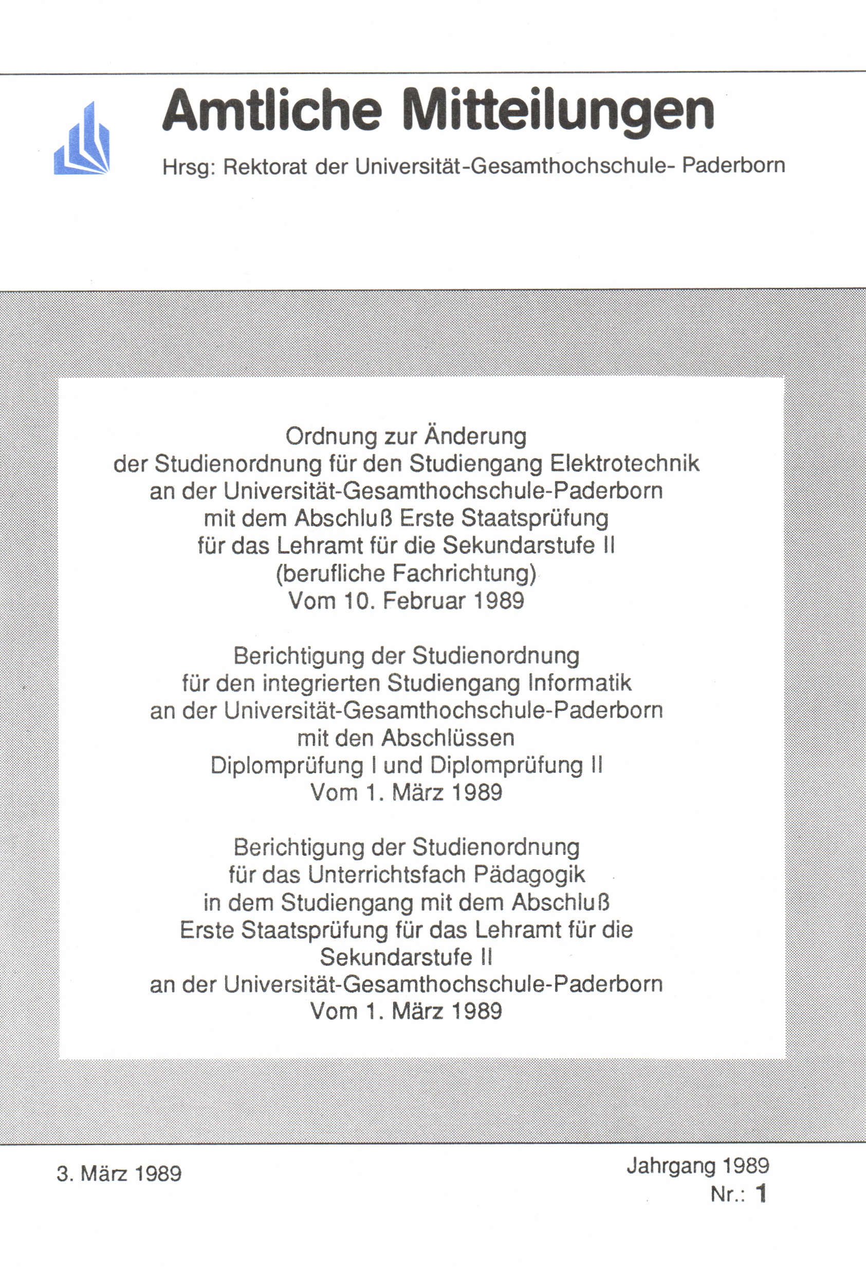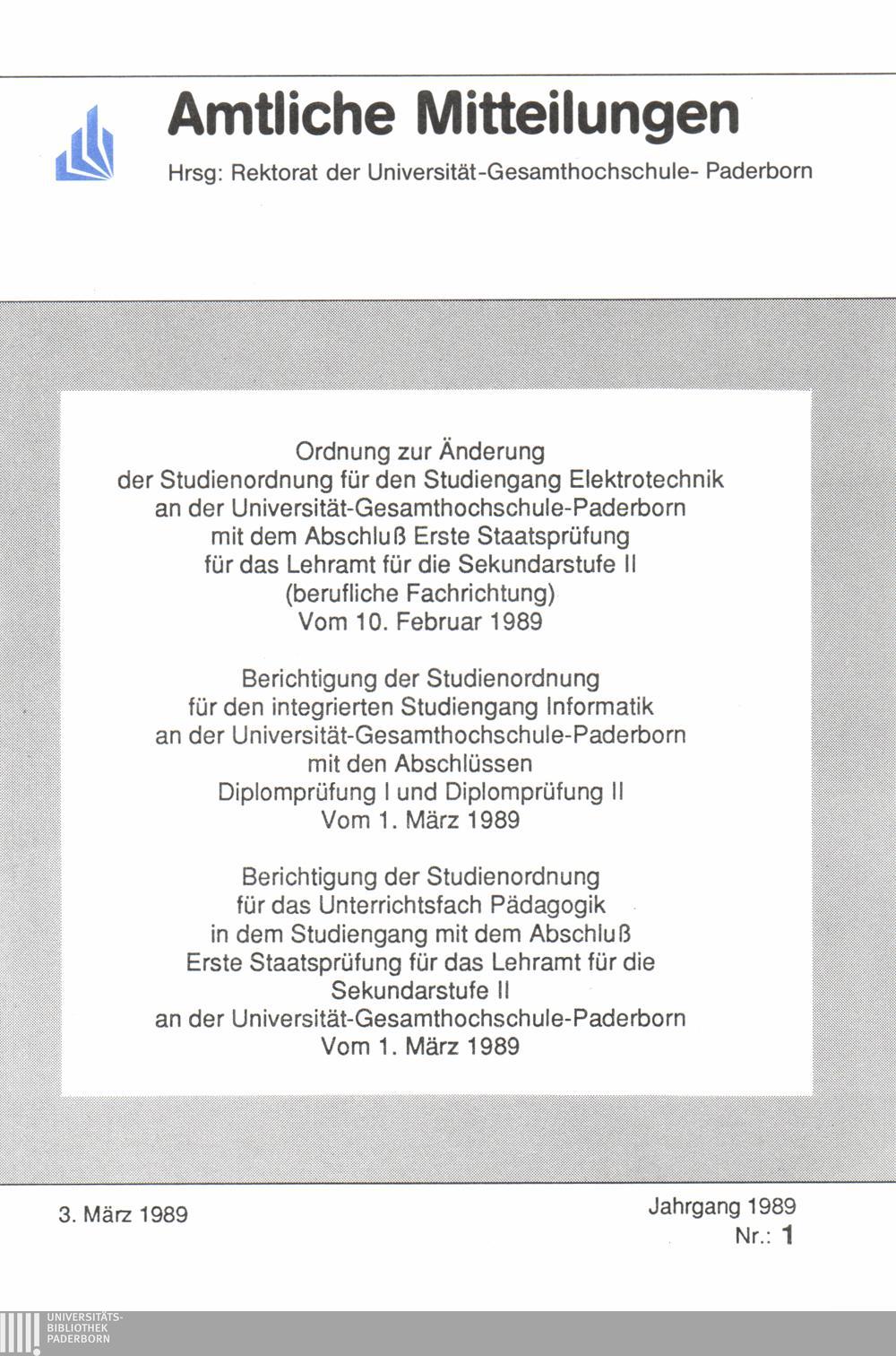 Ordnung zur Änderung der Studienordnung für den Studiengang Elektrotechnik an der Universität - Gesamthochschule - Paderborn mit dem Abschluß Erste Staatsprüfung für das Lehramt für die Sekundarstufe II (berufliche Fachrichtung) : vom 10. Februar 1989