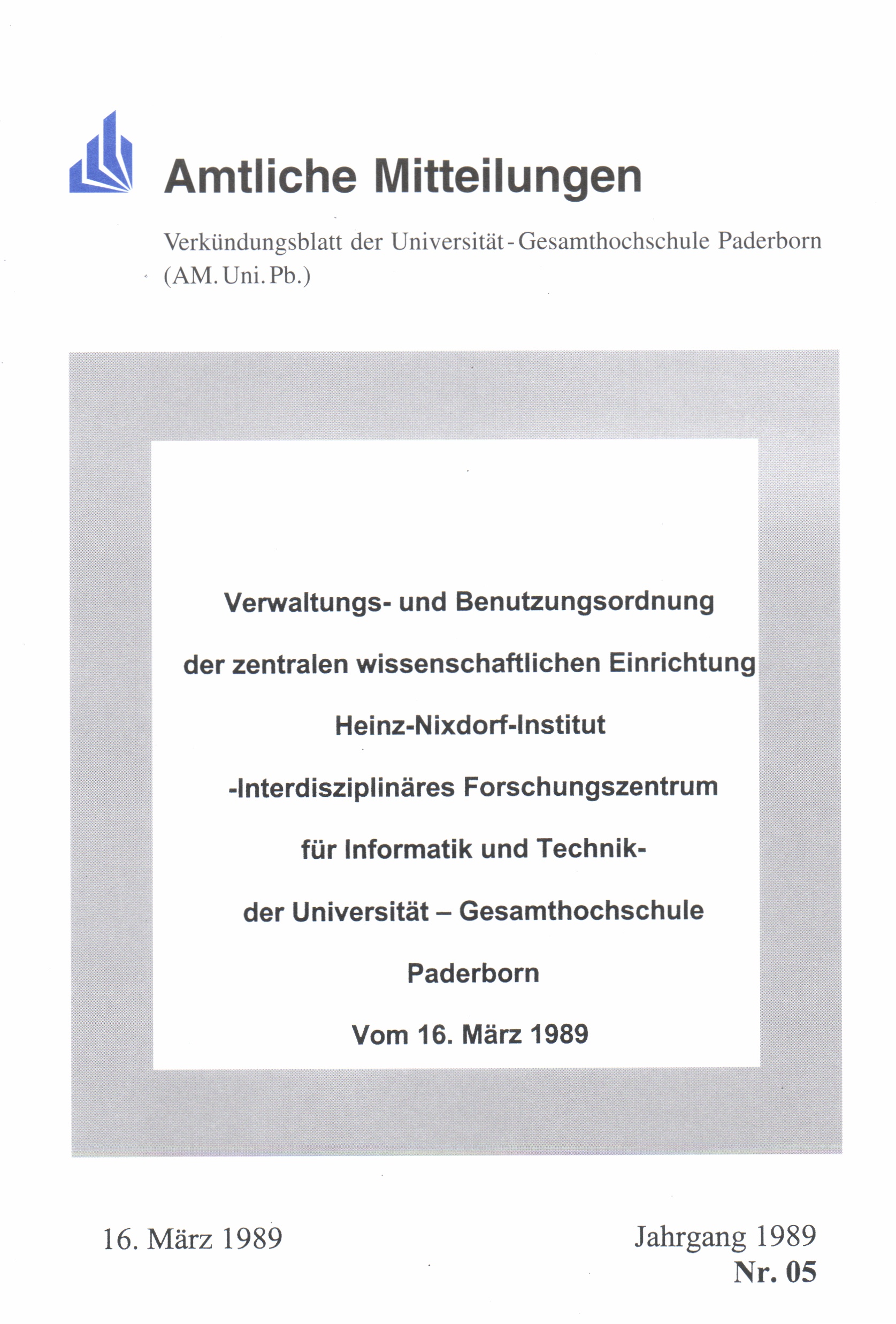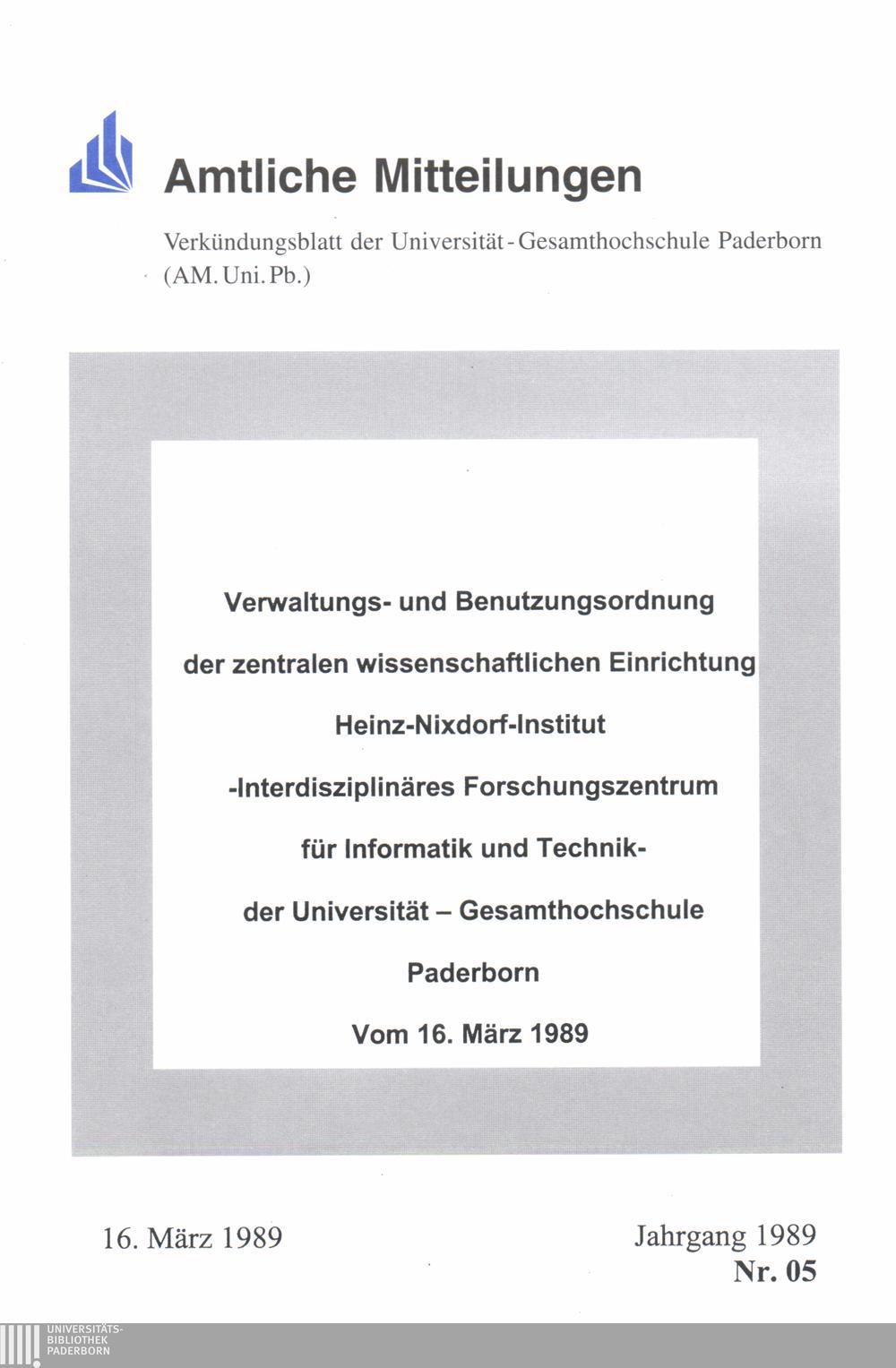 Verwaltungs- und Benutzungsordnung der Zentralen Wissenschaftlichen Einrichtung Heinz-Nixdorf-Institut - Interdisziplinäres Forschungszentrum für Informatik und Technik - der Universität - Gesamthochschule - Paderborn vom 16. März 1989 : 16. März 1989