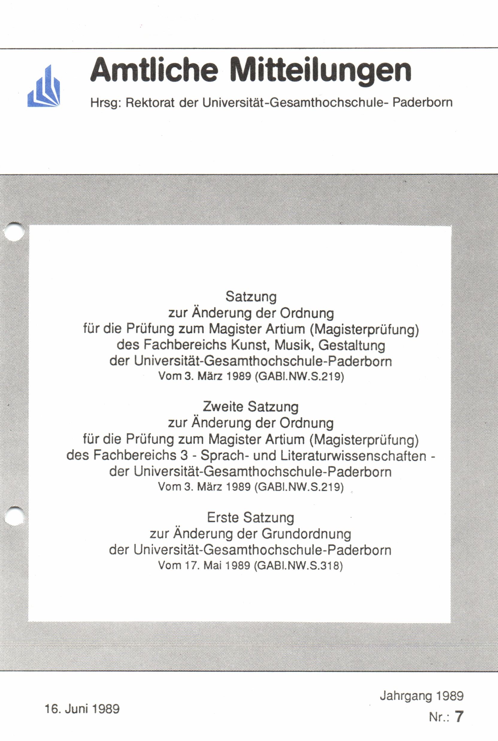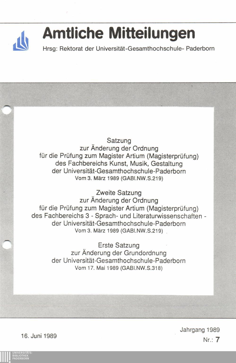 Satzung zur Änderung der Ordnung für die Prüfung zum Magister Artium (Magisterprüfung) des Fachbereichs Kunst, Musik, Gestaltung der Universität-Gesamthochschule-Paderborn : vom 3. März 1989 (GABL.NW.S.219)