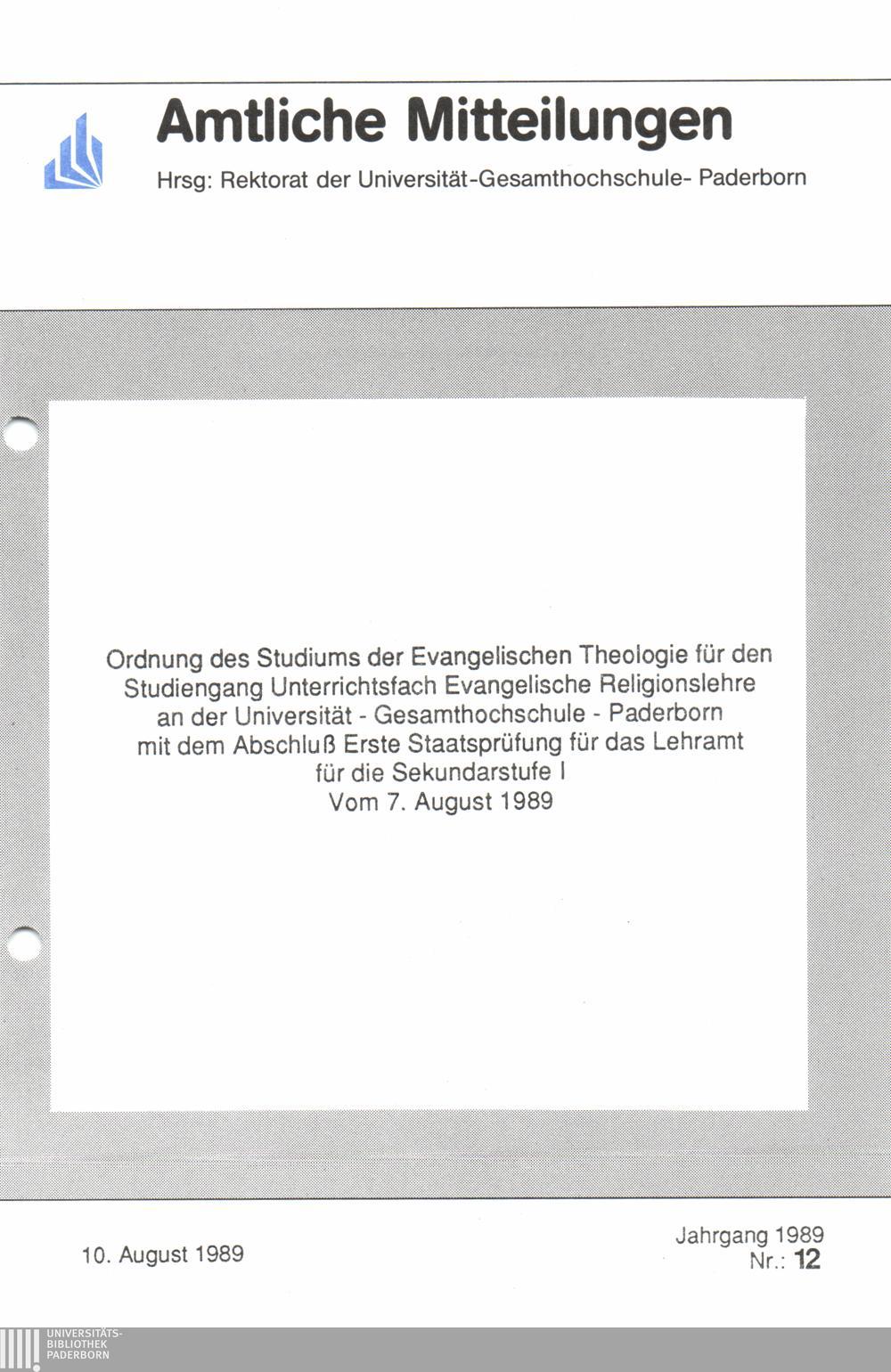 Ordnung des Studiums der Evangelischen Theologie für den Studiengang Unterrichtsfach Evangelische Religionslehre an der Universitätät - Gesamthochschule - Paderborn mit dem Abschluß Erste Staatsprüfung für das Lehramt für die Sekundarsstufe I vom 7. August 1989 : 10. August 1989
