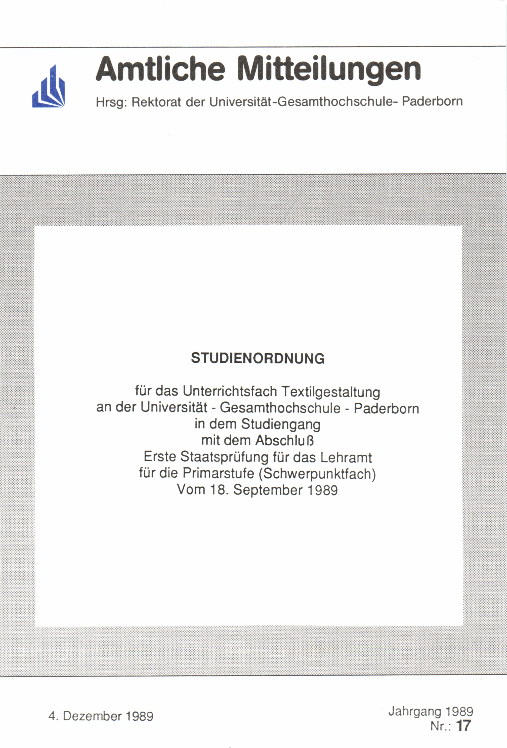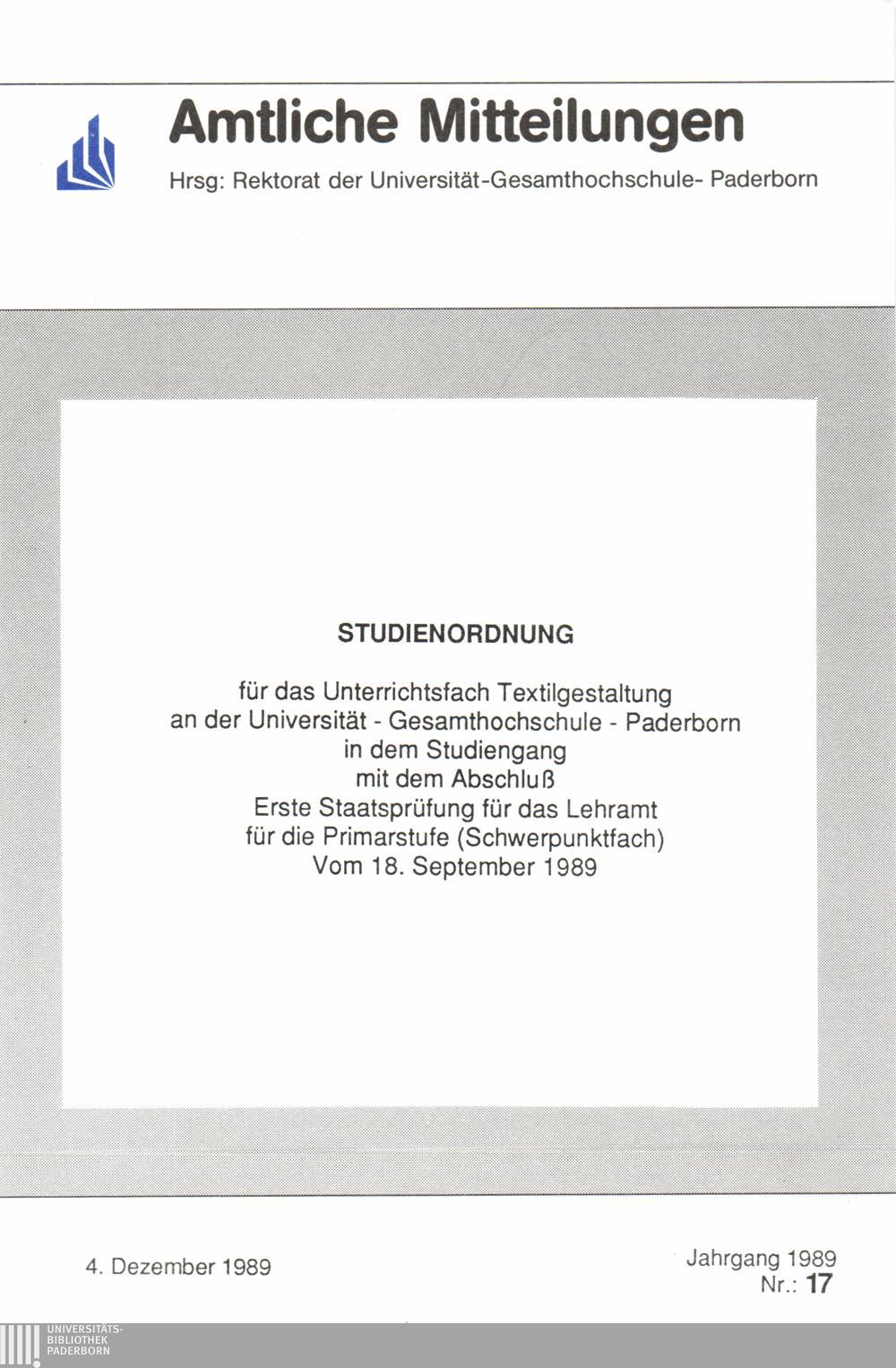 Studienordnung für das Unterrichtsfach Textilgestaltung an der Universität - Gesamthochschule - Paderborn in dem Studiengang mit dem Abschluß Erste Staatsprüfung für das Lehramt für die Primarstufe (Schwerpunktfach) vom 18. September 1989 : 4. Dezember 1989