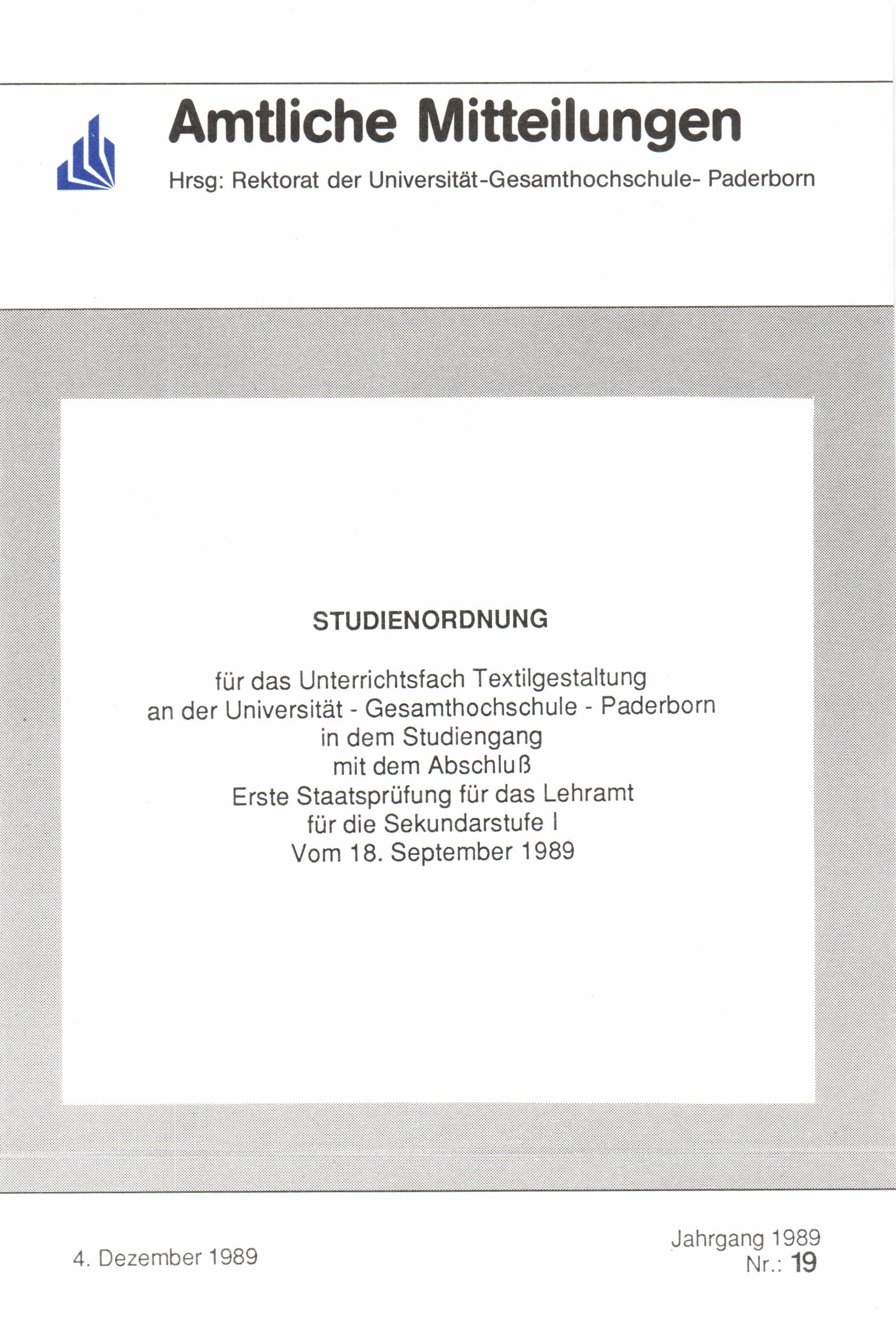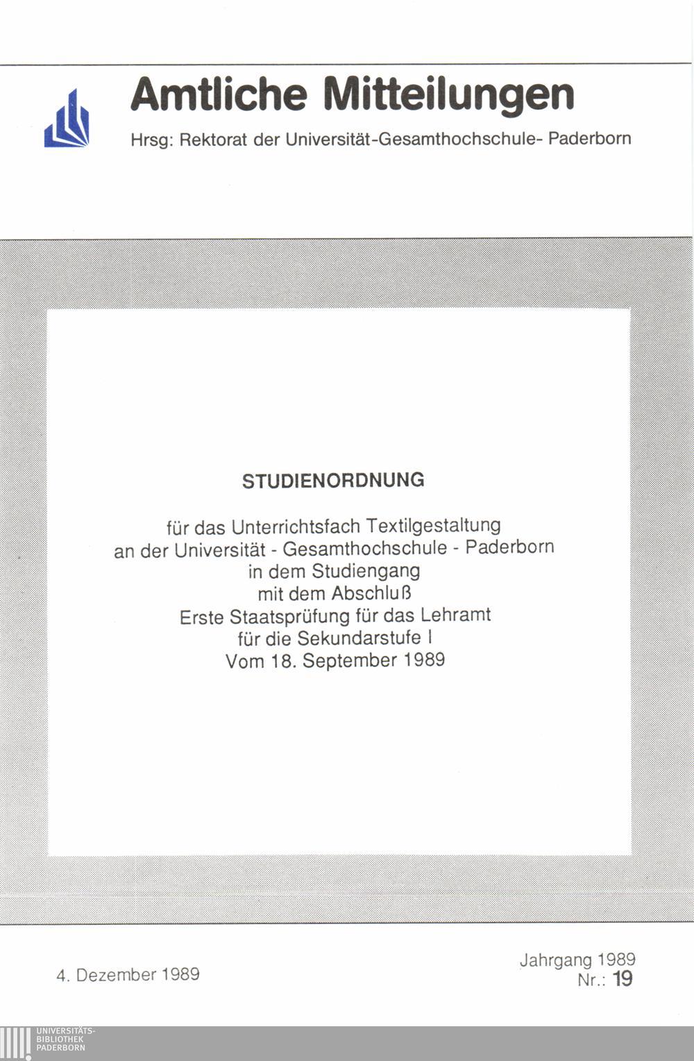 Studienordnung für das Unterrichtsfach Textilgestaltung an der Universität - Gesamthochschule - Paderborn in dem Studiengang mit dem Abschluß Erste Staatsprüfung für das Lehramt für die Sekundarstufe I vom 18. September 1989 : 4. Dezember 1989