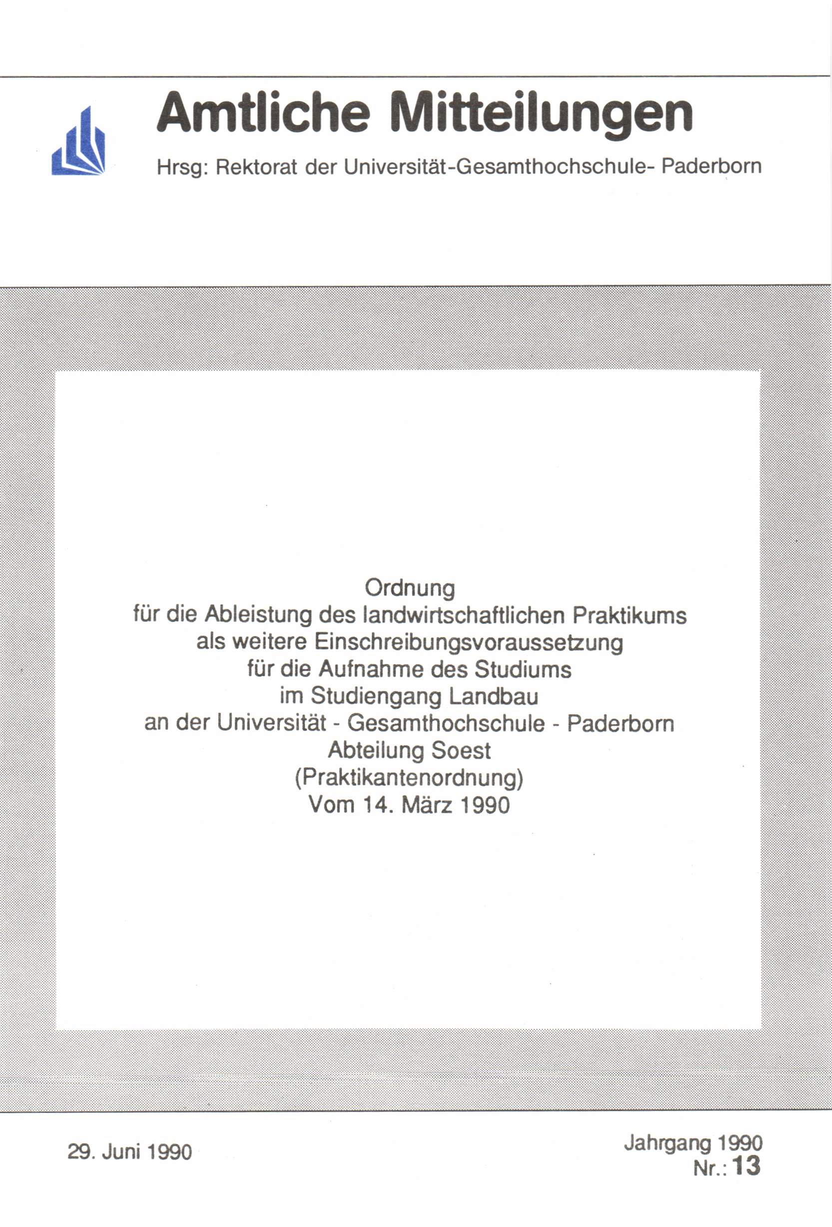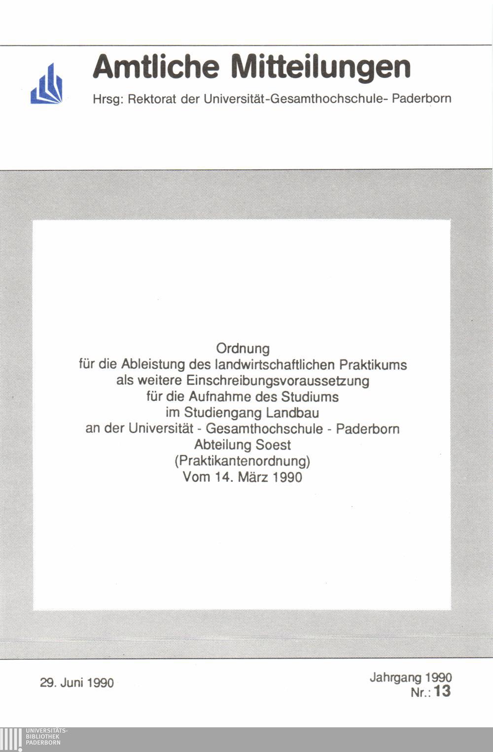 Ordnung für die Ableistung des landwirtschaftlichen Praktikums als weitere Einschreibungsvoraussetzung für die Aufnahme des Studiums im Studiengang Lanbau an der Universität - Gesamthochschule - Paderborn Abteilung Soest (Praktikantenordnung) vom 14. März 1990 : 29. Juni 1990