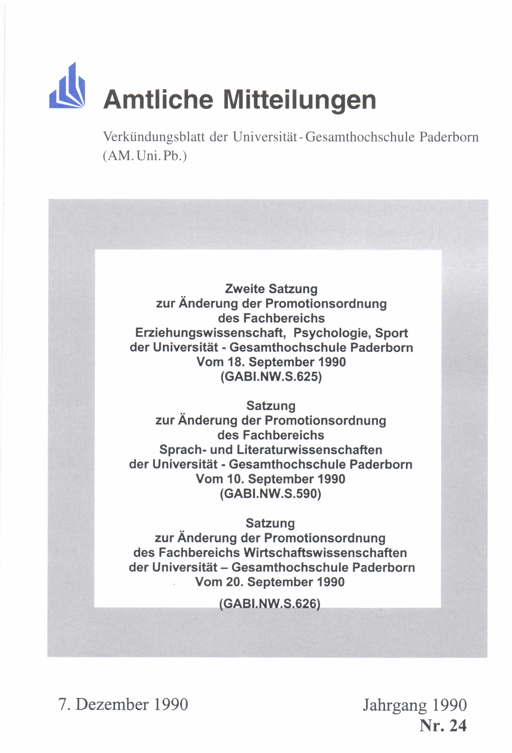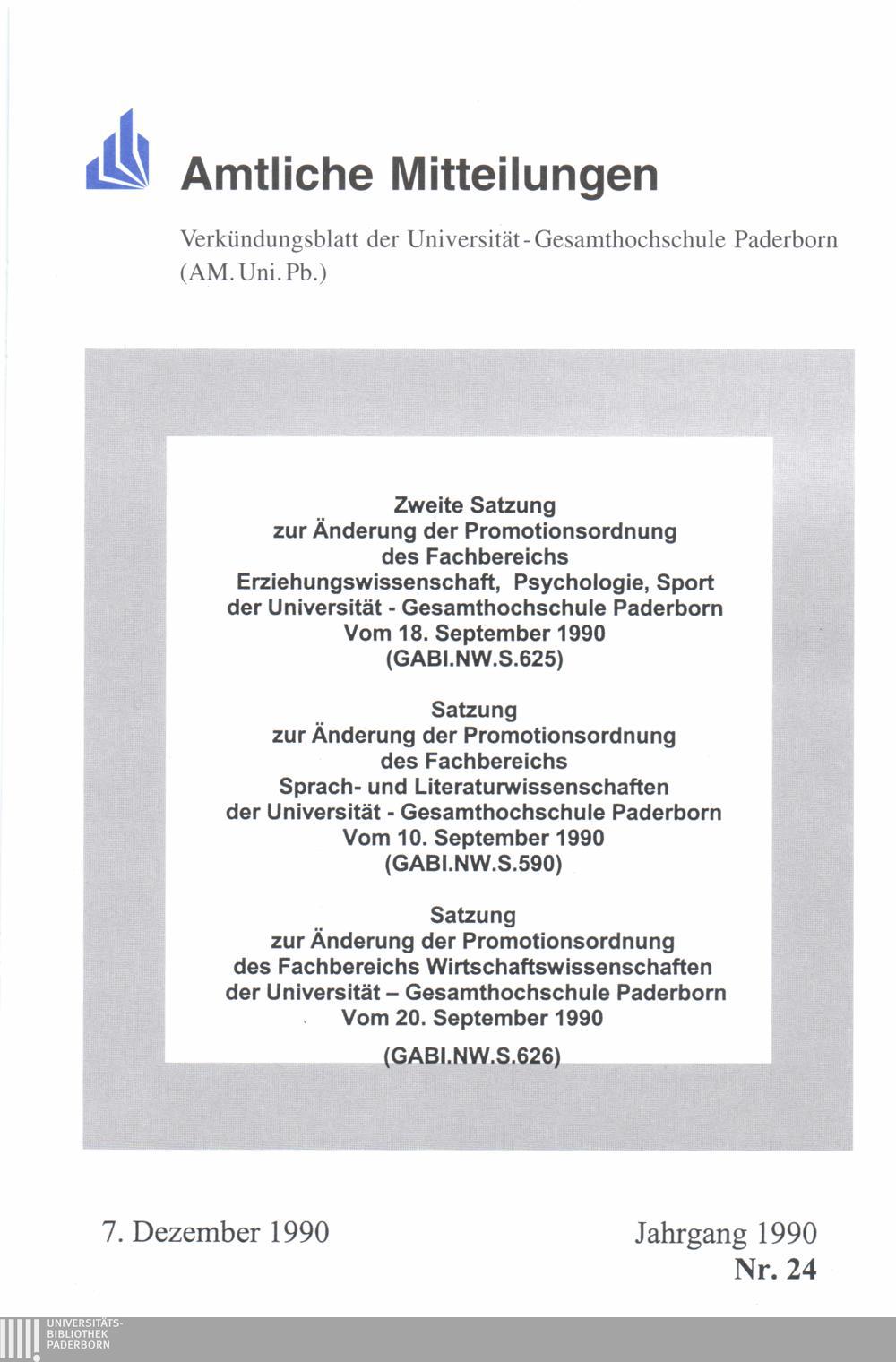 Zweite Satzung zur Änderung der Promotionsordnug des Fachbereichs Erziehungswissenschaft, Psychologie, Sport der Universität - Gesamthochschule - Paderborn : vom 18. September 1990