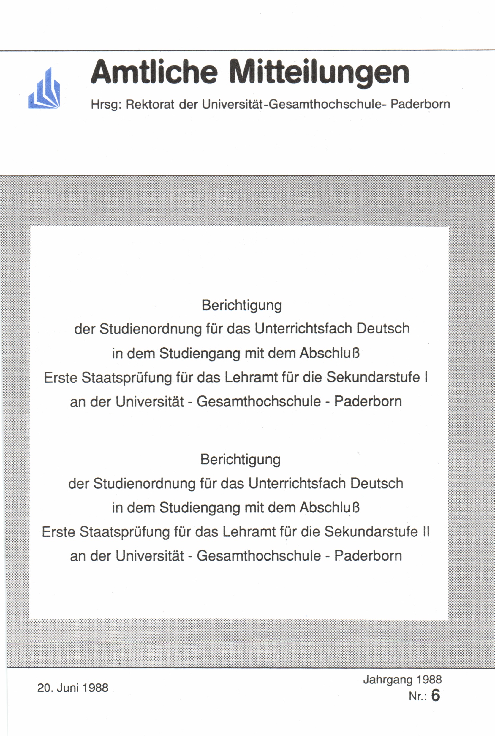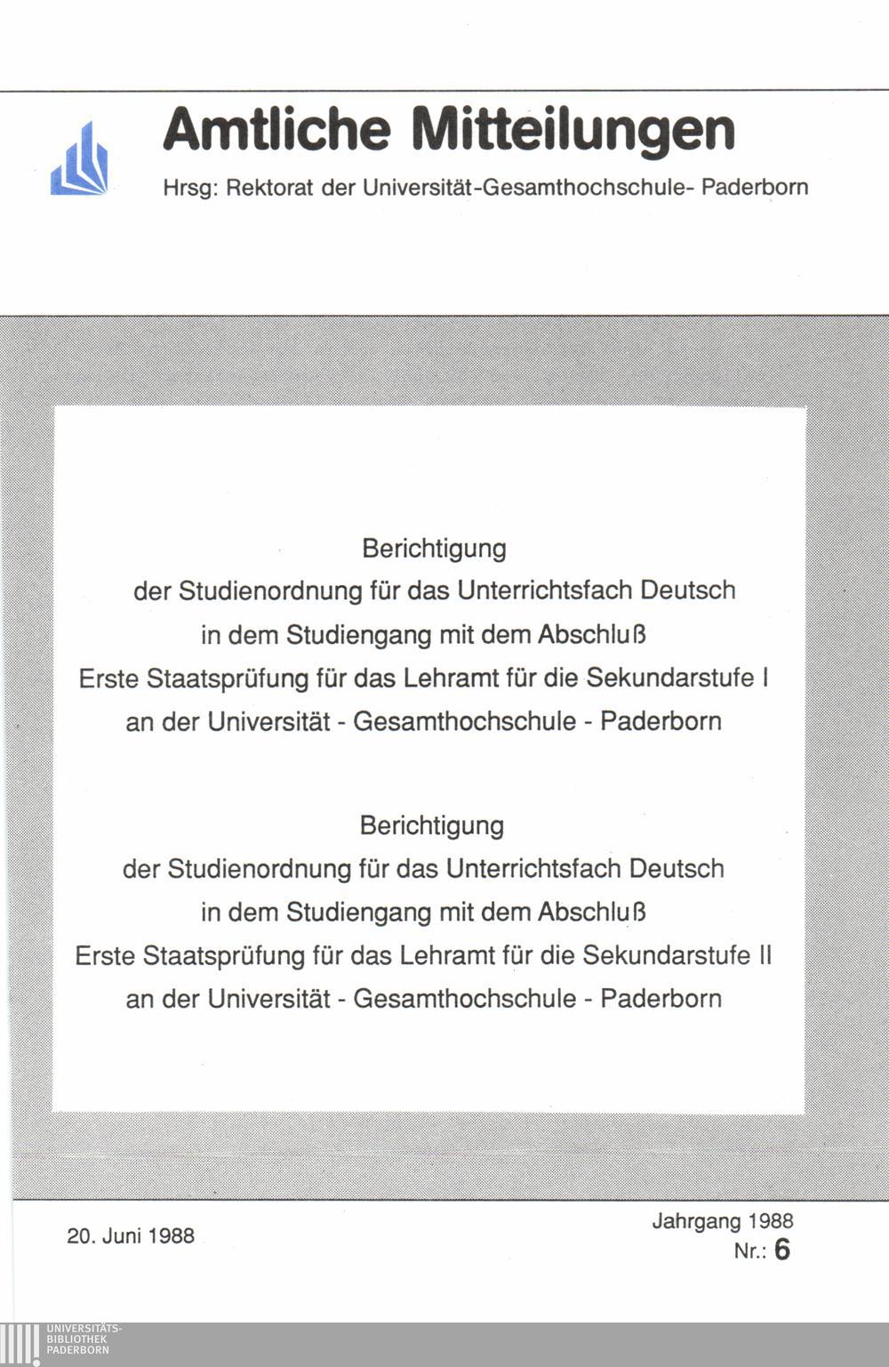 Berichtigung der Studienordnung für das Unterrichtsfach Deutsch in dem Studiengang mit dem Abschluß Erste Staatsprüfung für das Lehramt für die Sekundarstufe I an der Universität-Gesamthochschule-Paderborn