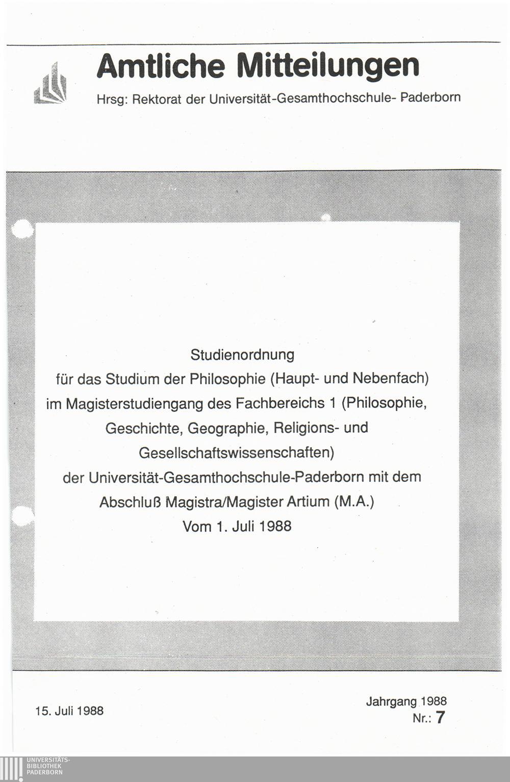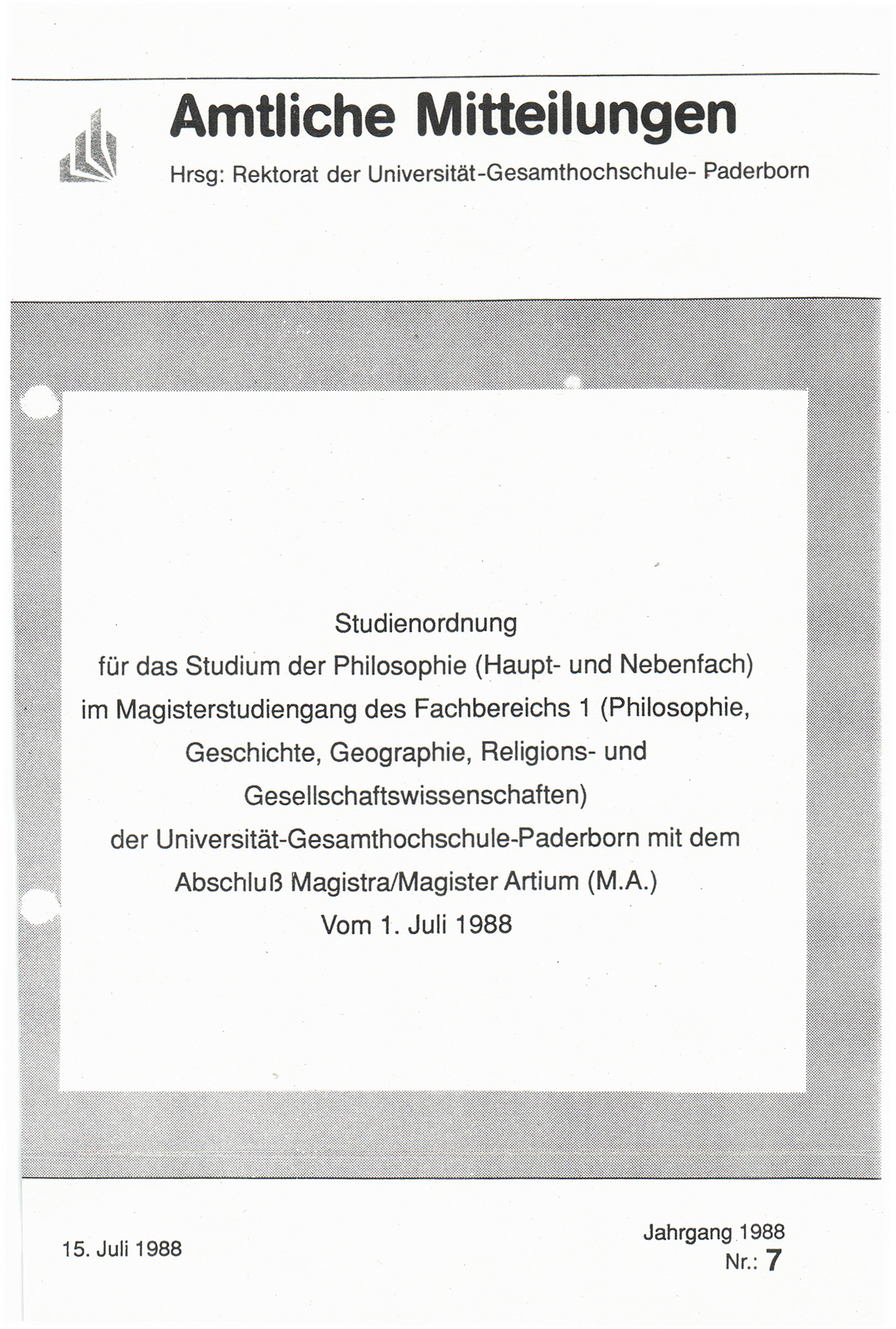 Studienordnung für das Studium der Philosophie (Haupt-und Nebenfach) im Magisterstudiengang des Fachbereichs 1 (Philosophie, Geschichte, Geographie, Religions- und Gesellschaftswissenschaften) der Universität-Gesamthochschule-Paderborn mit dem Abschluß Magistra/Magister Artium (M.A.) : vom 1. Juli 1988