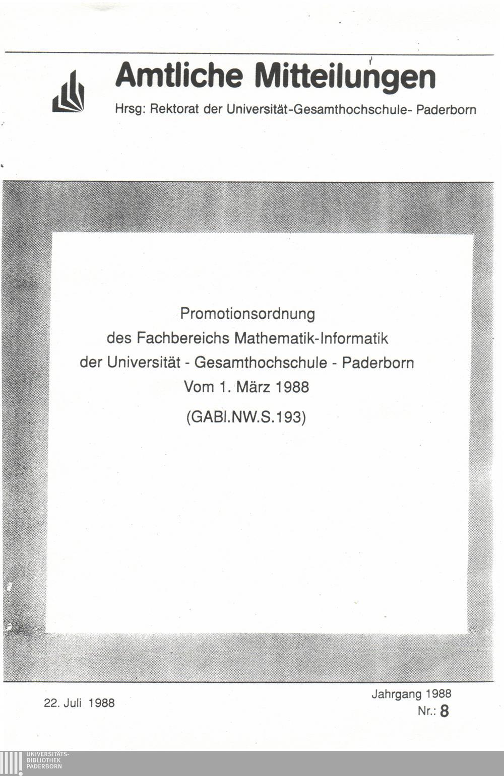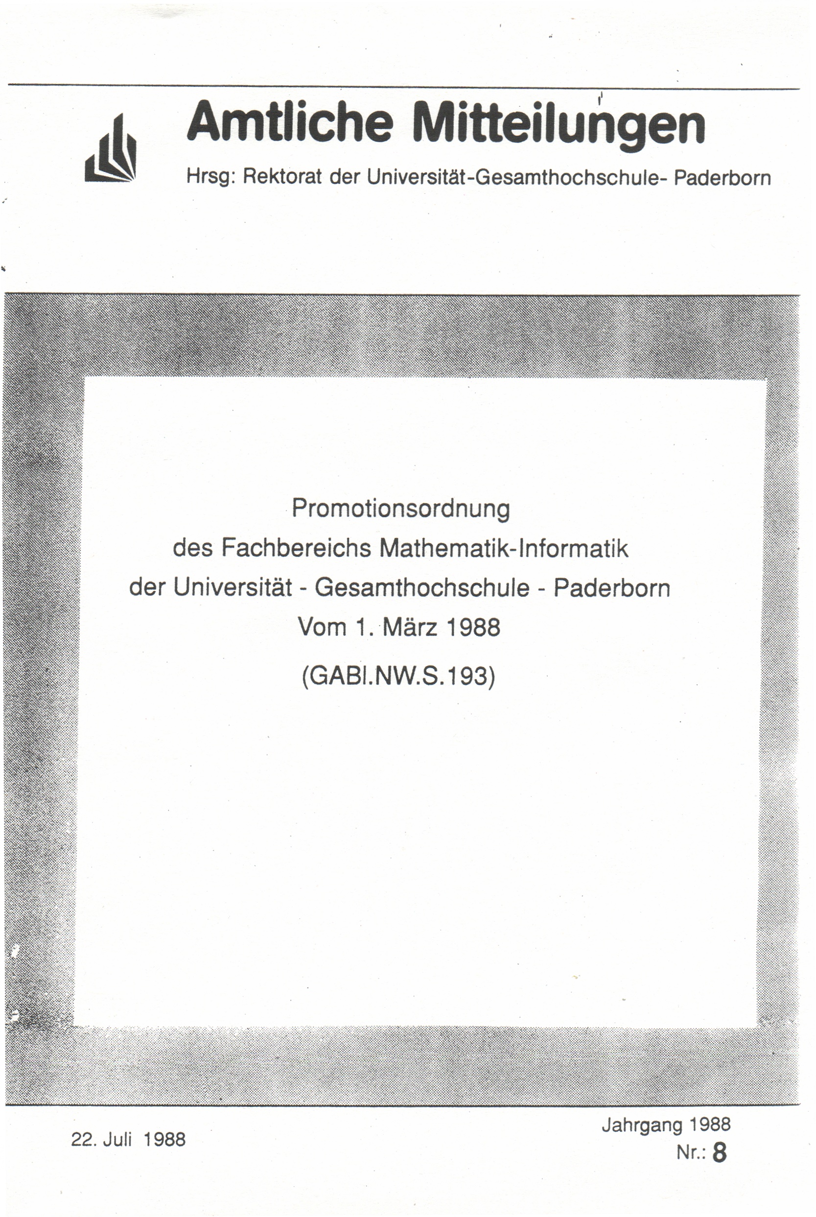 Promotionsordnung des Fachbereichs Mathematik-Informatik der Universität-Gesamthochschule-Paderborn : vom 1. März 1988