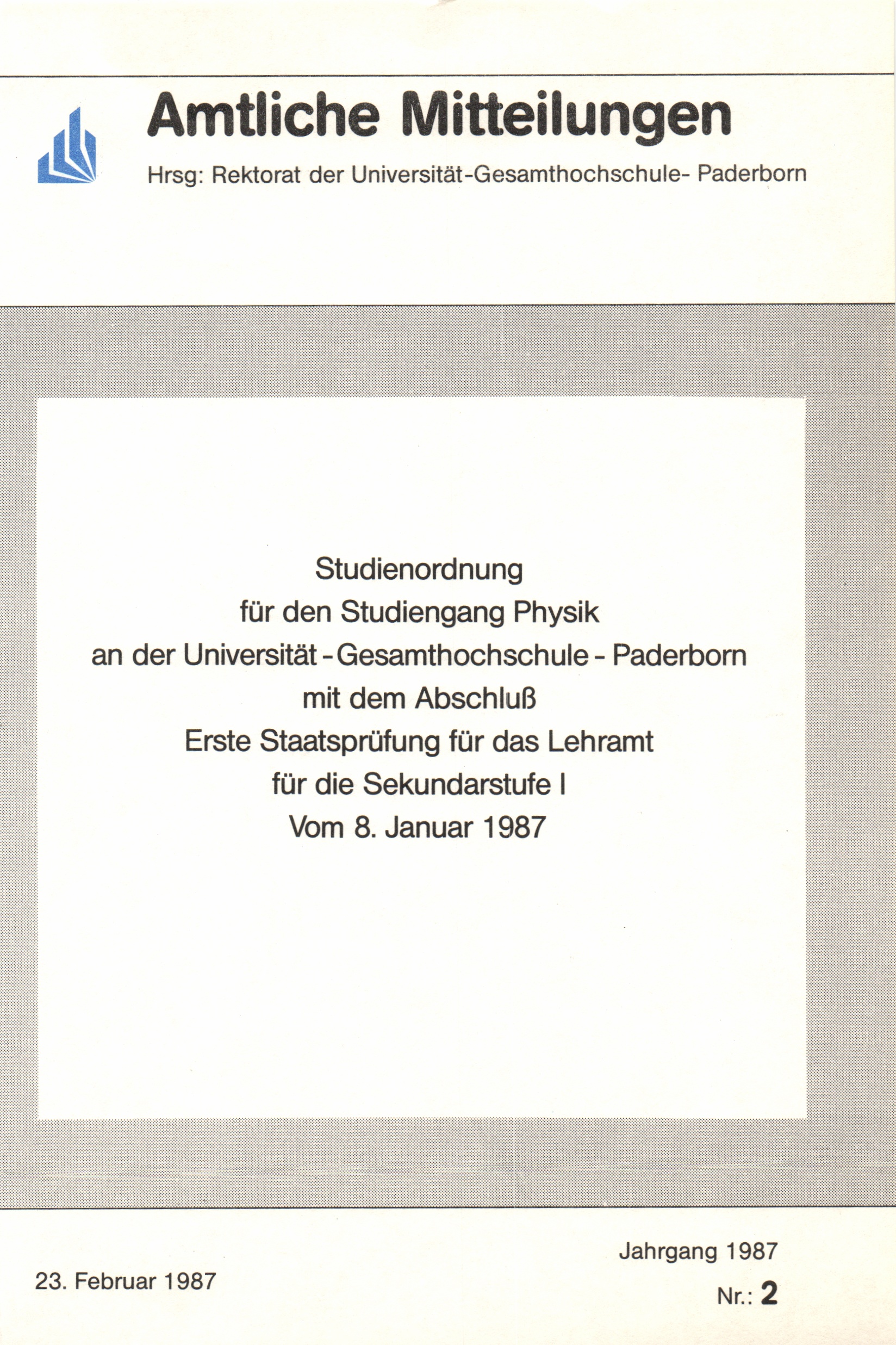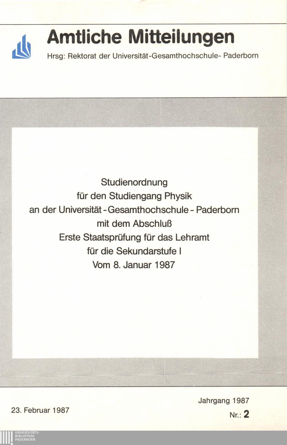 Studienordnung für den Studiengang Physik an der Universität - Gesamthochschule - Paderborn mit dem Abschluß Erste Staatsprüfung für das Lehramt für die Sekundarstufe I : vom 8. Januar 1987