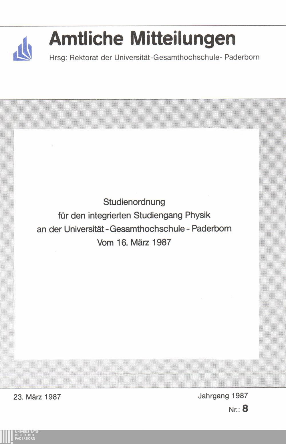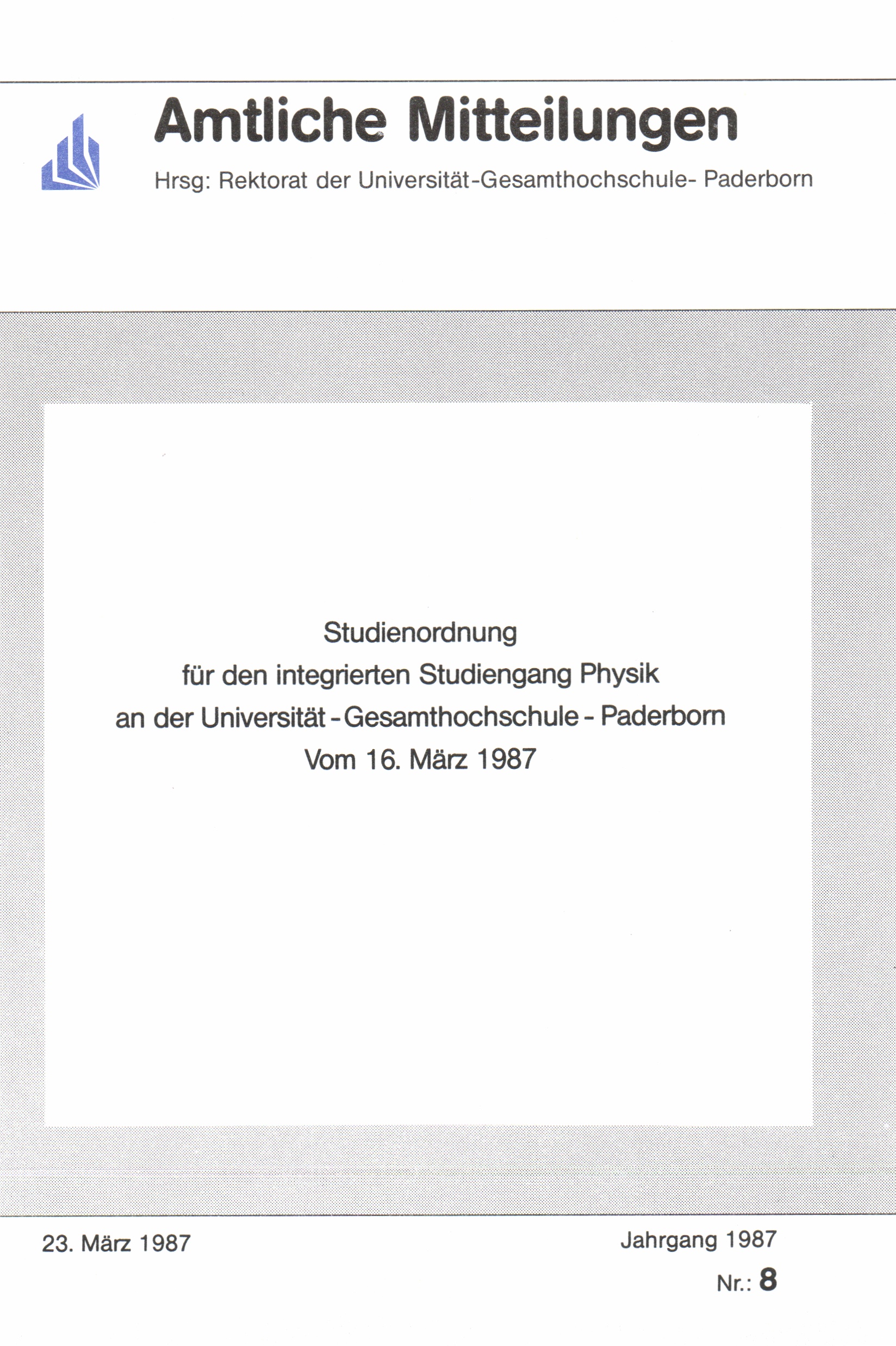 Studienordnung für den integrierten Studiengang Physik an der Universität - Gesamthochschule - Paderborn : vom 16. März 1987