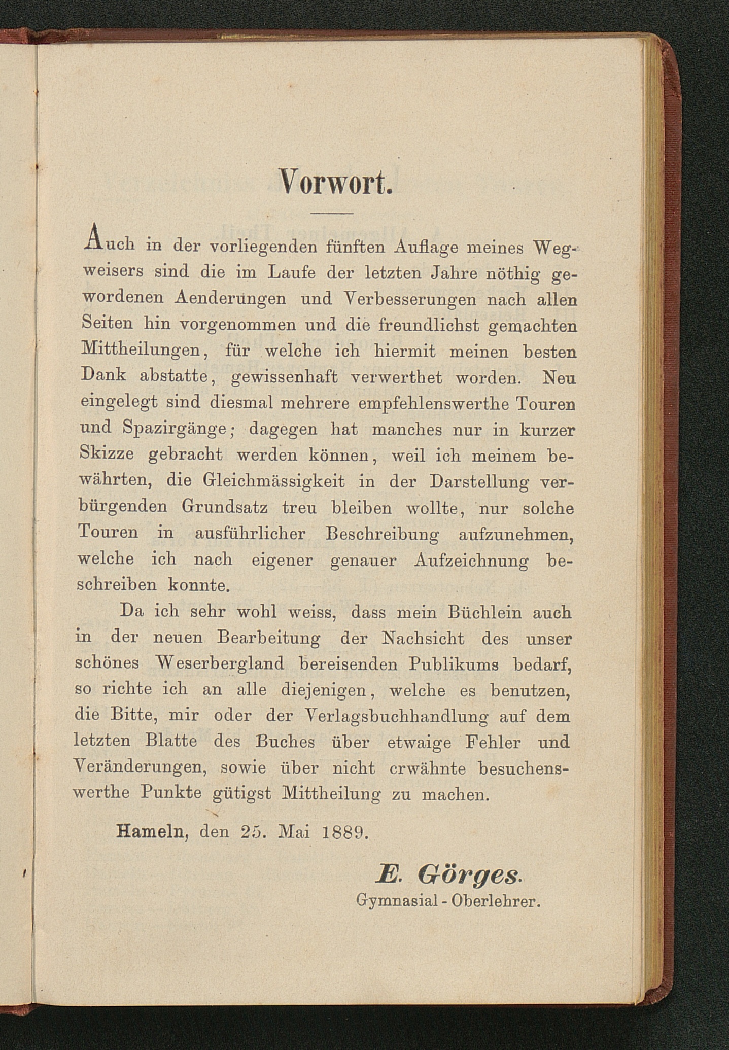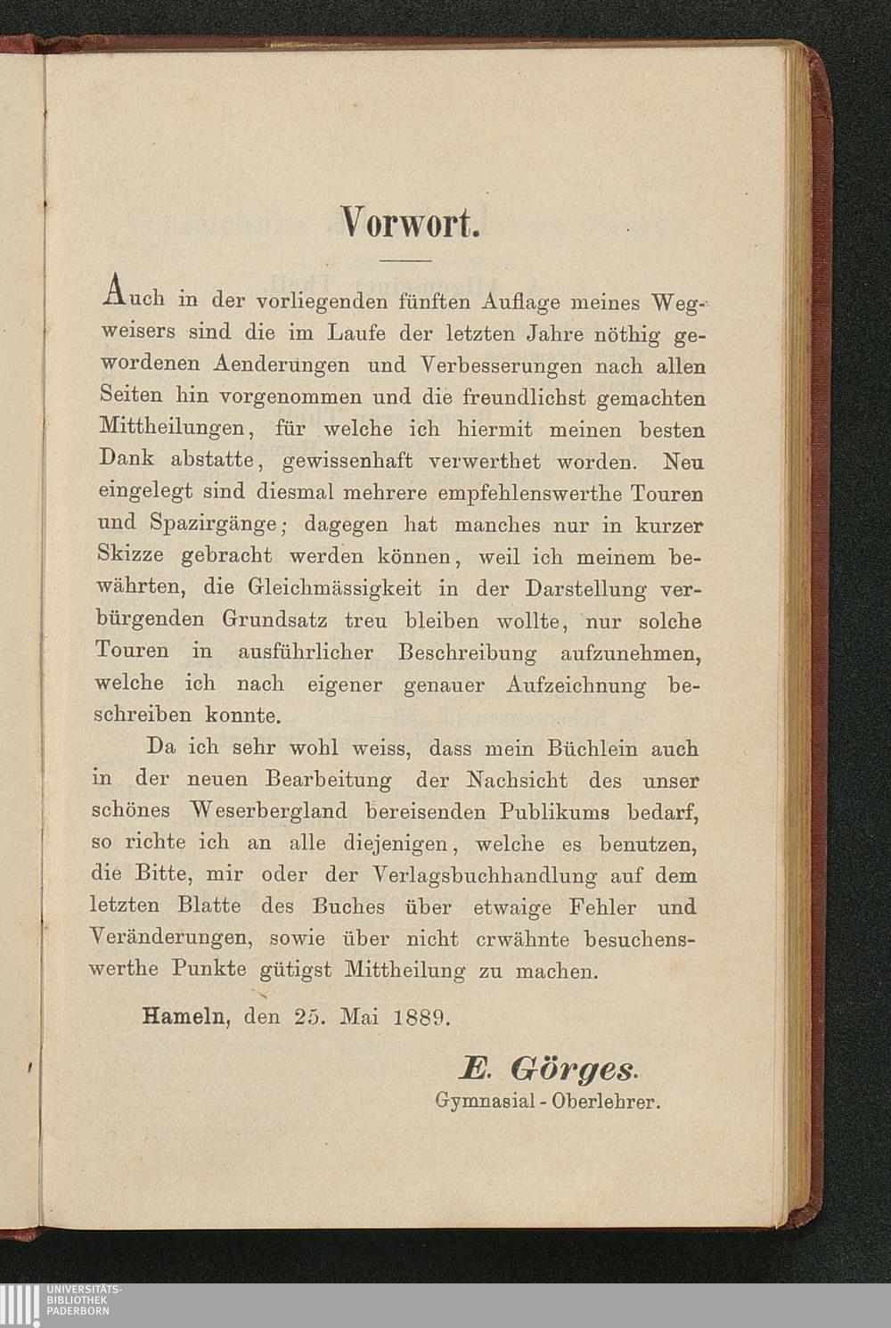 Wegweiser durch das Wesergebiet von Münden bis Minden : nebst Teutoburger Wald, Deister, Ith, Hils, Solling, Reinhardswald, mit besonderer Berücksichtigung der Bäder Pyrmont, Oeynhausen, Eilsen, Nenndorf, Driburg, Meinberg und anderer ; mit Excursionskarte / von E. Görges