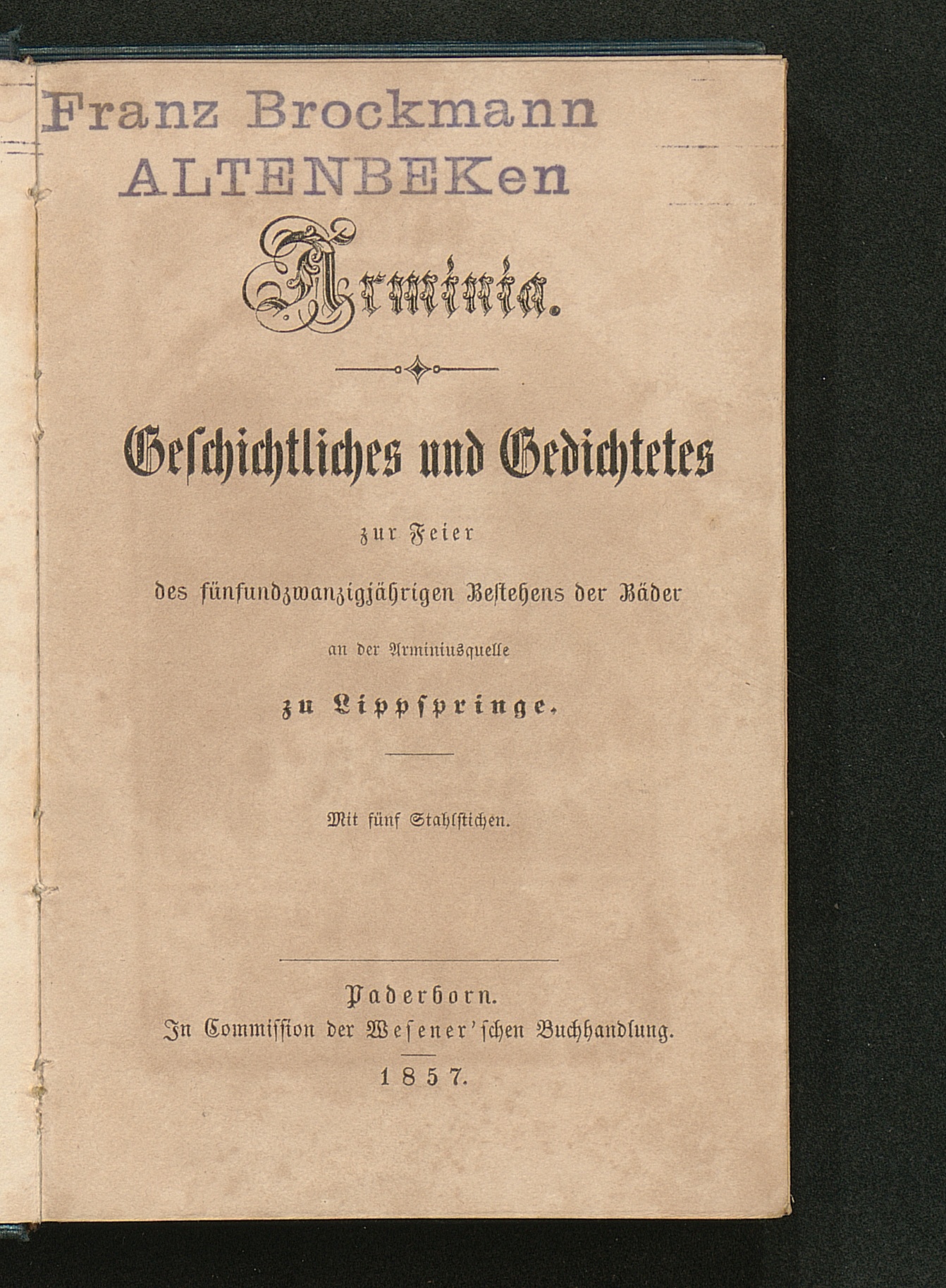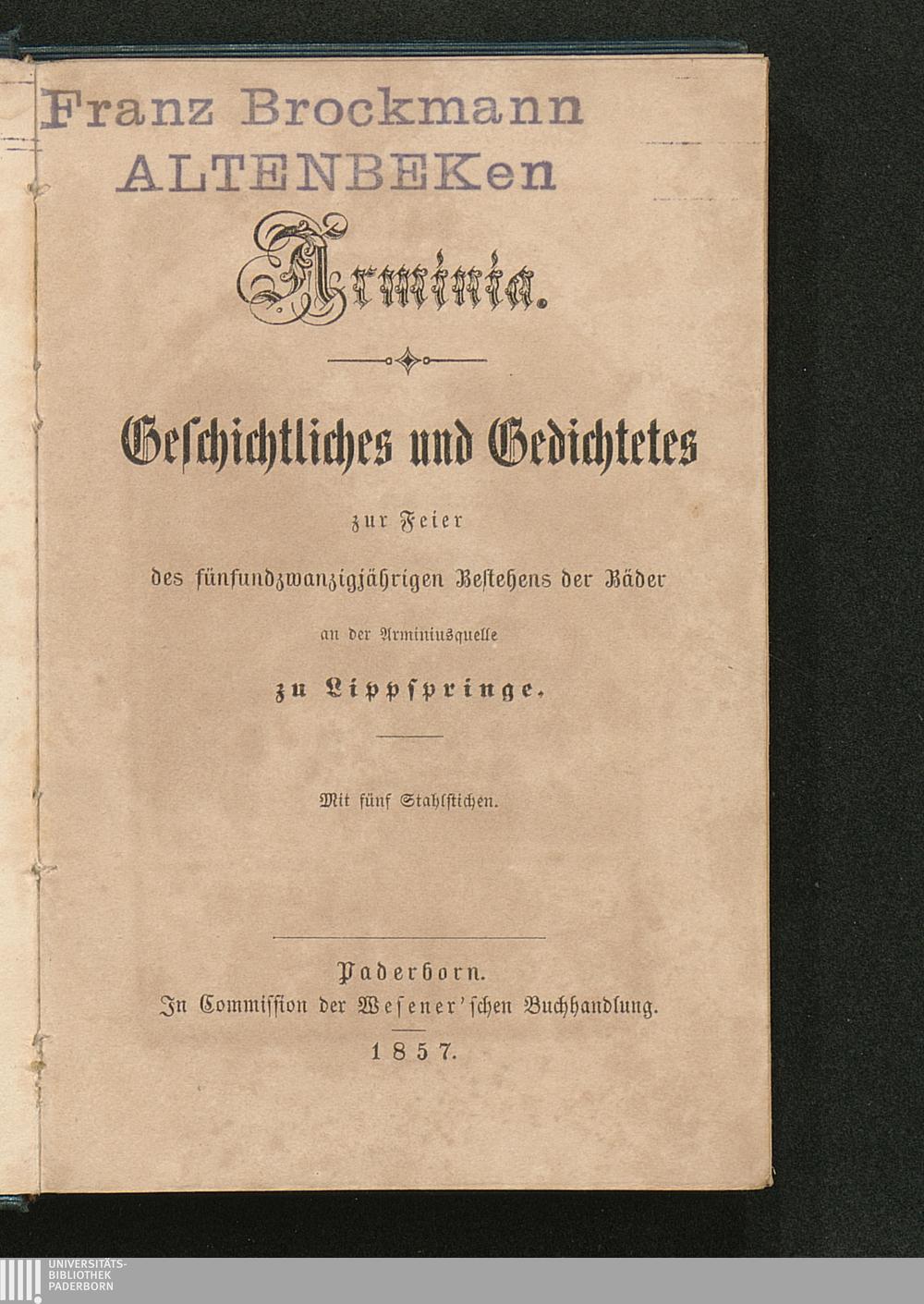 Arminia : Geschichtliches und Gedichtetes zur Feier des fünfundzwanzigjährigen Bestehens der Bäder an der Arminiusquelle zu Lippspringe