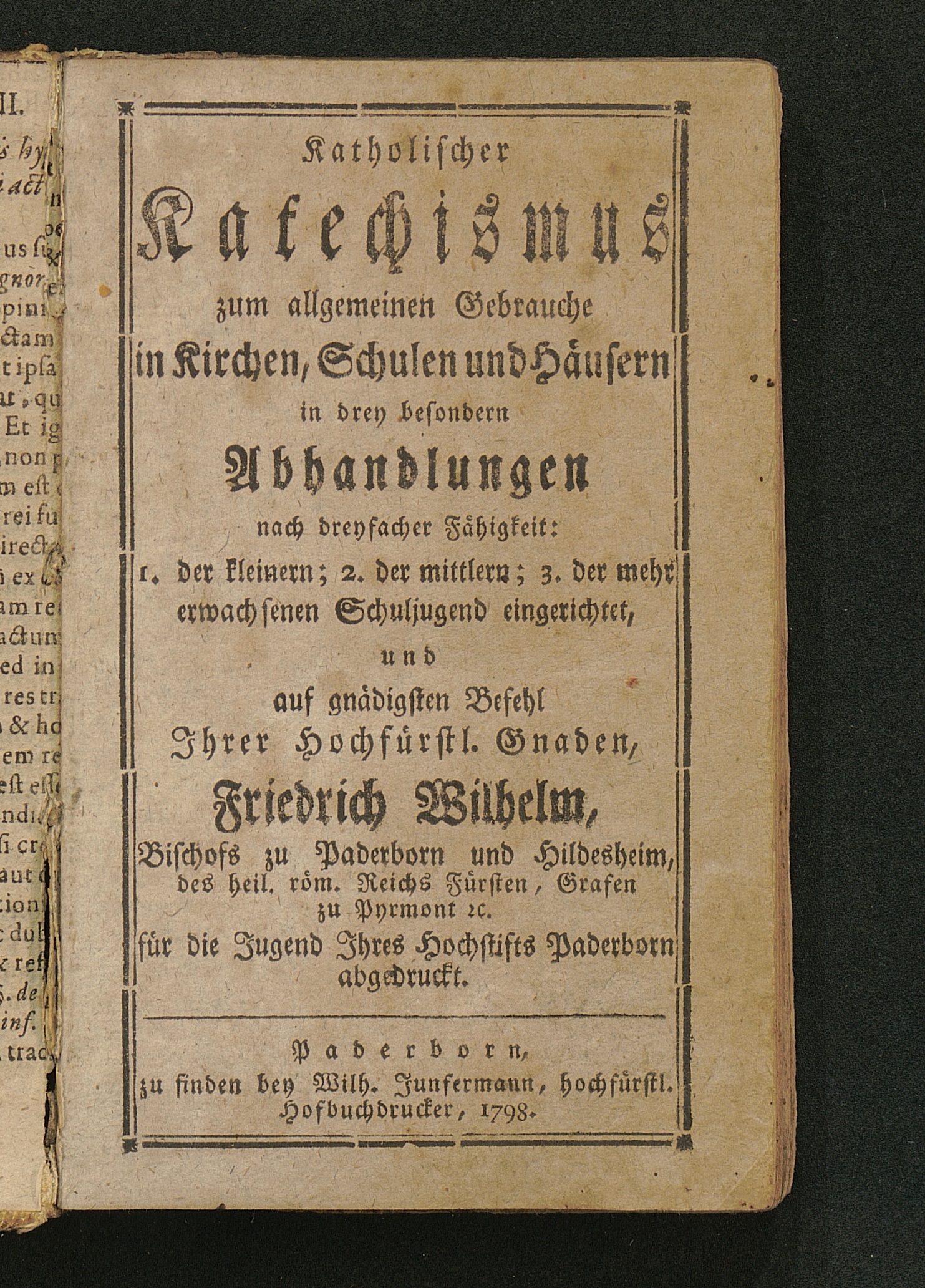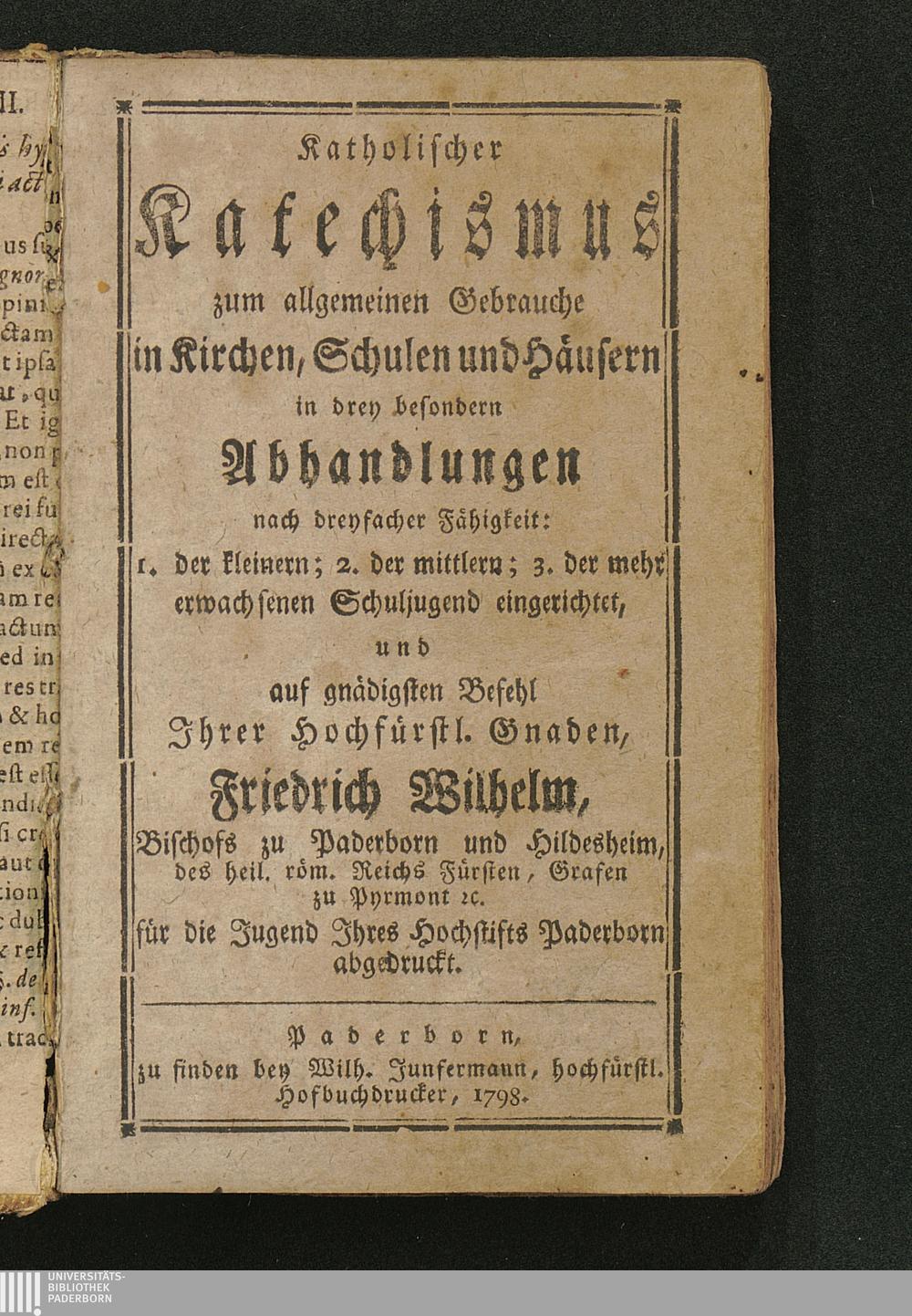 Katholischer Katechismus zum allgemeinen Gebrauche in Kirchen, Schulen und Häusern : in drey besondern Abhandlungen nach dreyfacher Fähigkeit: 1. der kleinern; 2. der mittlern; 3. der mehr erwachsenen Schuljugend eingerichtet, und auf gnädigsten Befehl Jhrer Hochfürstl. Gnaden, Friderich Wilhelm, Bischofs zu Paderborn und Hildesheim ... für die Jugend Jhres Hochstifts Paderborn abgedruckt