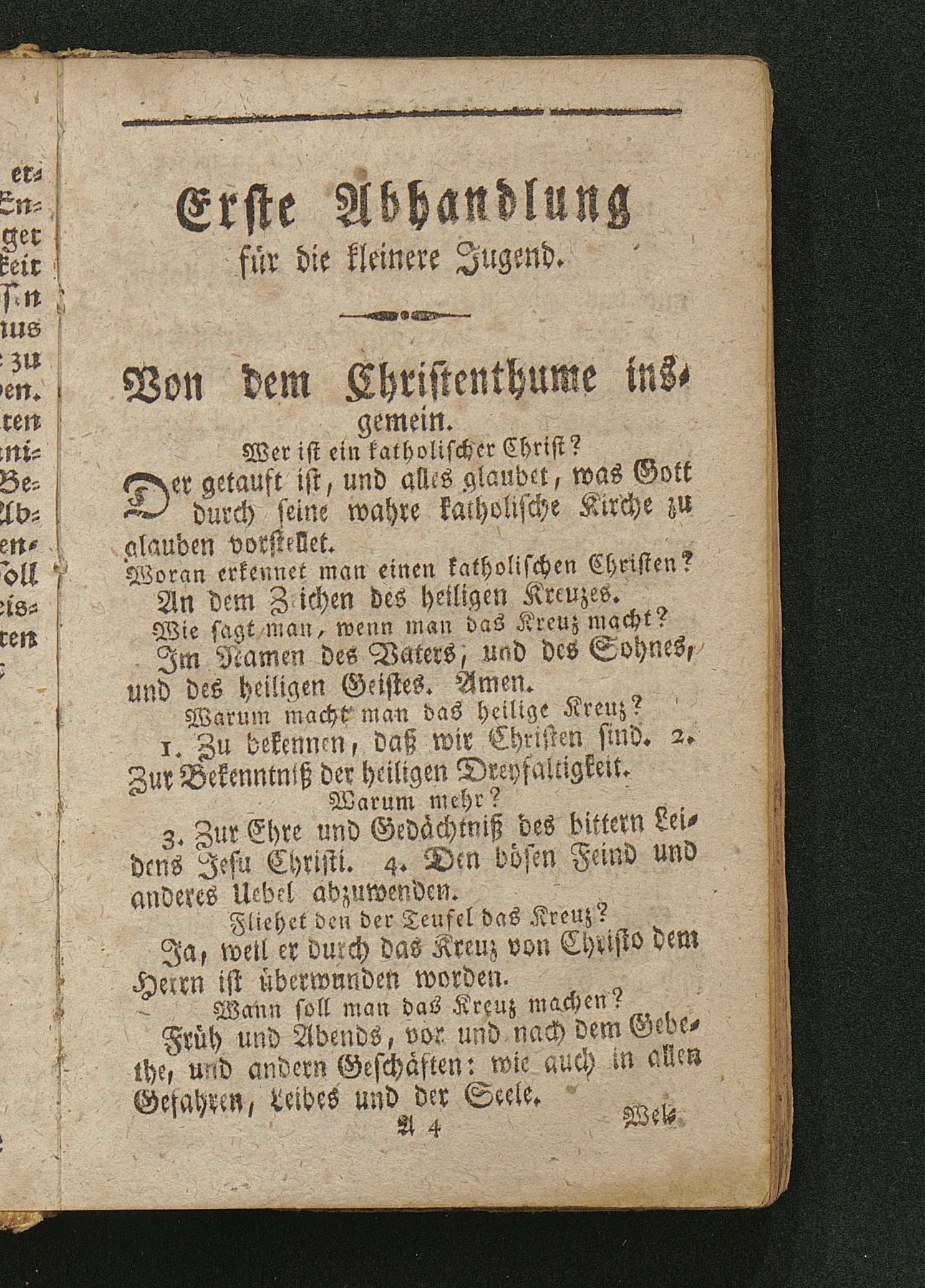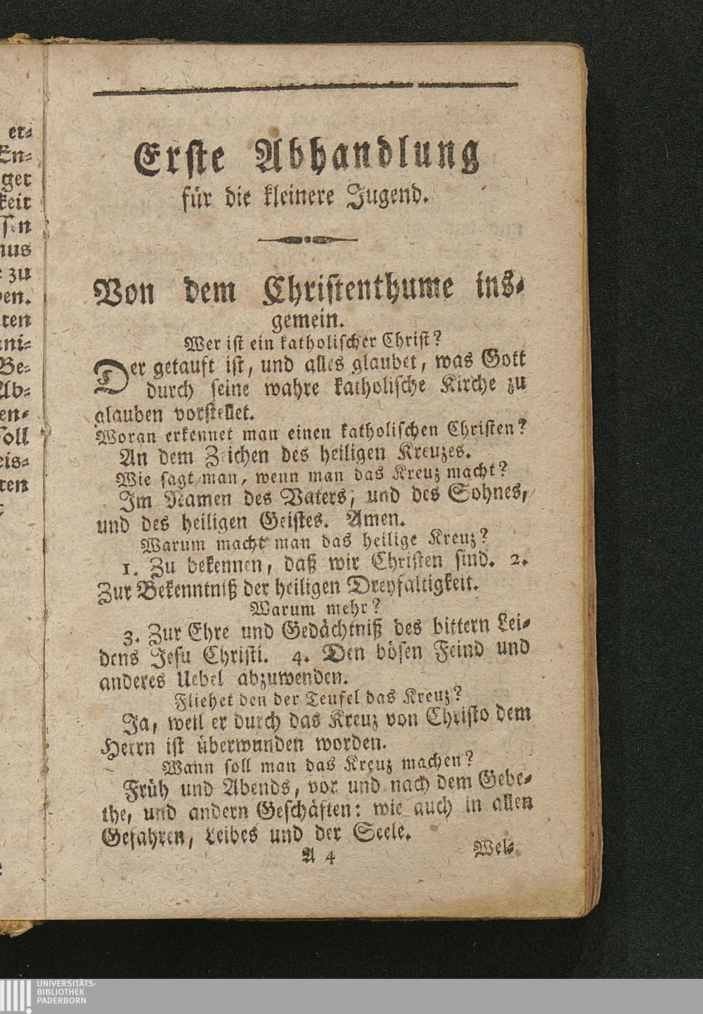 Katholischer Katechismus zum allgemeinen Gebrauche in Kirchen, Schulen und Häusern : in drey besondern Abhandlungen nach dreyfacher Fähigkeit: 1. der kleinern; 2. der mittlern; 3. der mehr erwachsenen Schuljugend eingerichtet, und auf gnädigsten Befehl Jhrer Hochfürstl. Gnaden, Friderich Wilhelm, Bischofs zu Paderborn und Hildesheim ... für die Jugend Jhres Hochstifts Paderborn abgedruckt