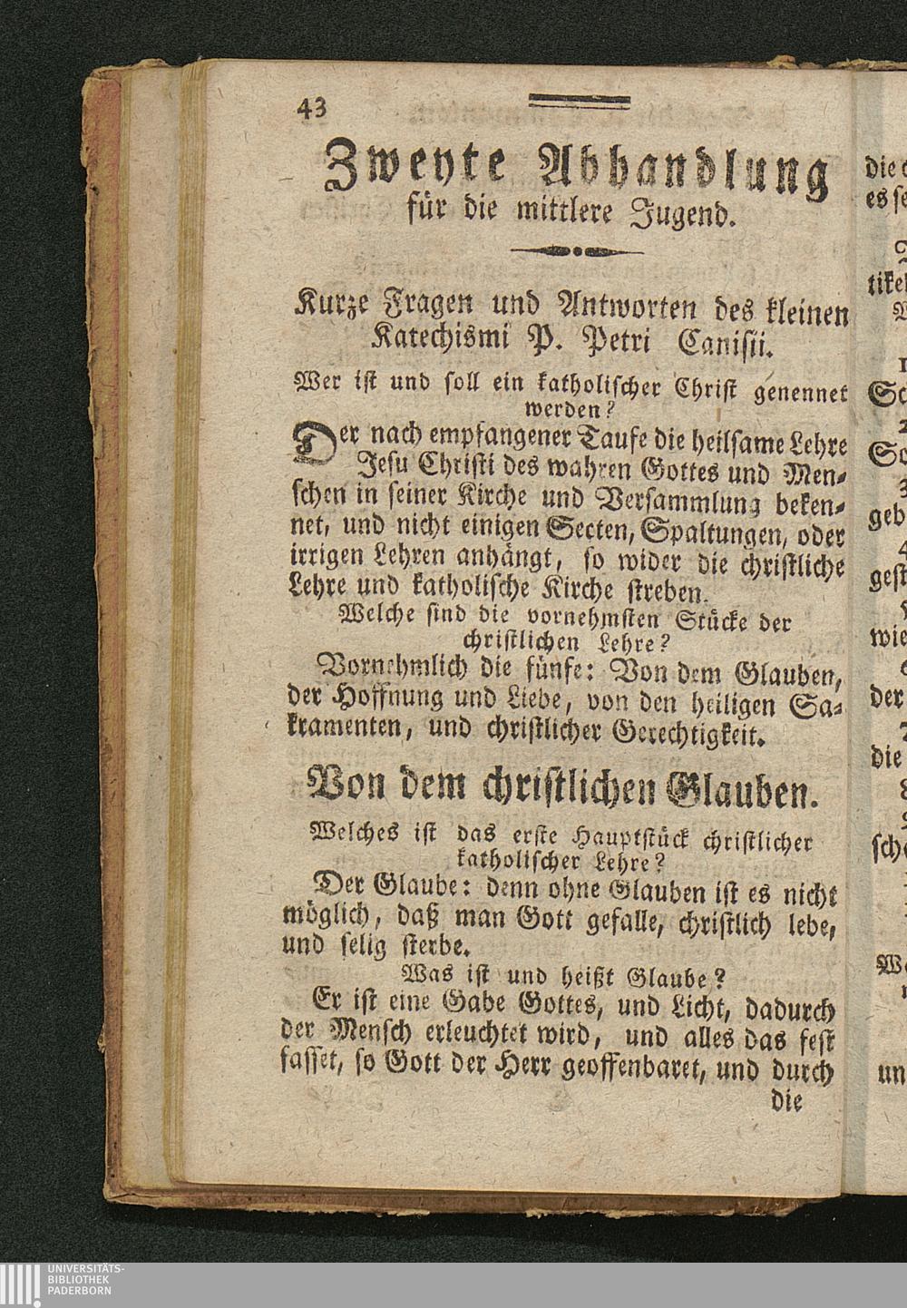 Katholischer Katechismus zum allgemeinen Gebrauche in Kirchen, Schulen und Häusern : in drey besondern Abhandlungen nach dreyfacher Fähigkeit: 1. der kleinern; 2. der mittlern; 3. der mehr erwachsenen Schuljugend eingerichtet, und auf gnädigsten Befehl Jhrer Hochfürstl. Gnaden, Friderich Wilhelm, Bischofs zu Paderborn und Hildesheim ... für die Jugend Jhres Hochstifts Paderborn abgedruckt