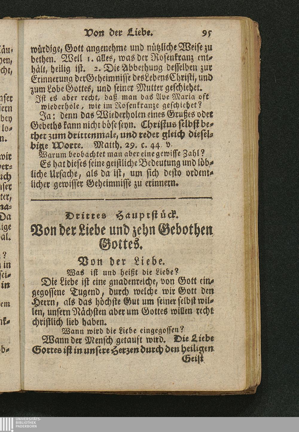 Katholischer Katechismus zum allgemeinen Gebrauche in Kirchen, Schulen und Häusern : in drey besondern Abhandlungen nach dreyfacher Fähigkeit: 1. der kleinern; 2. der mittlern; 3. der mehr erwachsenen Schuljugend eingerichtet, und auf gnädigsten Befehl Jhrer Hochfürstl. Gnaden, Friderich Wilhelm, Bischofs zu Paderborn und Hildesheim ... für die Jugend Jhres Hochstifts Paderborn abgedruckt