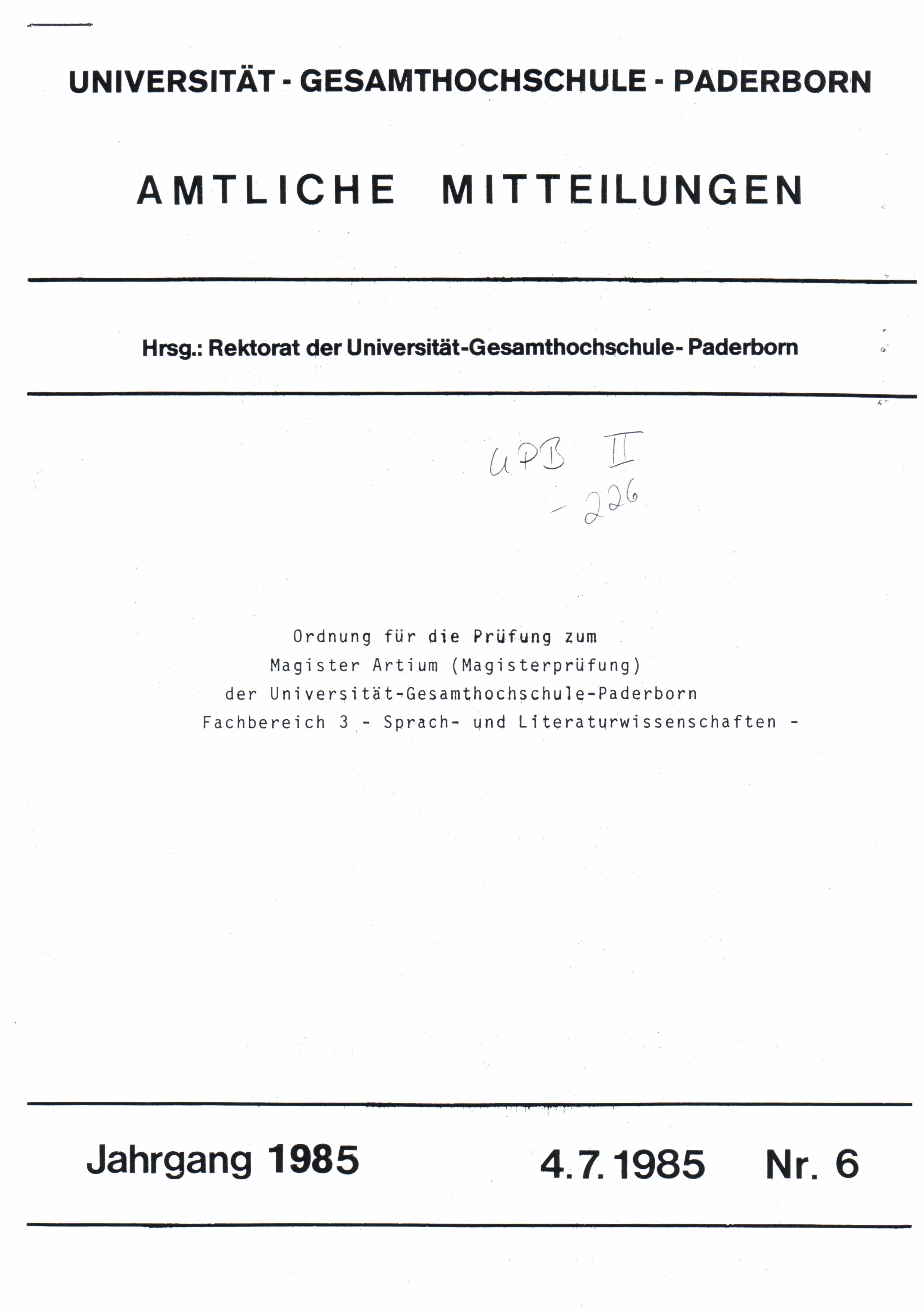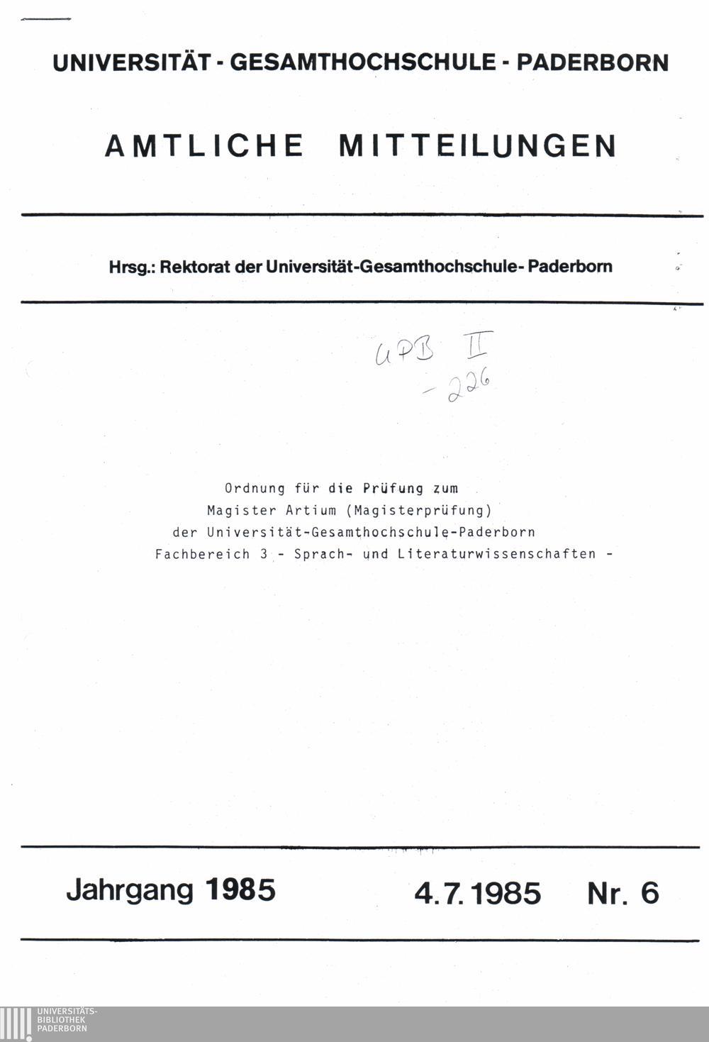 Ordnung für die Prüfung zum Magister Artium (Magisterprüfung) der Universität-Gesamthochschule-Paderborn Fachbereich 3 - Sprach- und Literaturwissenschaften : 4.7.1985