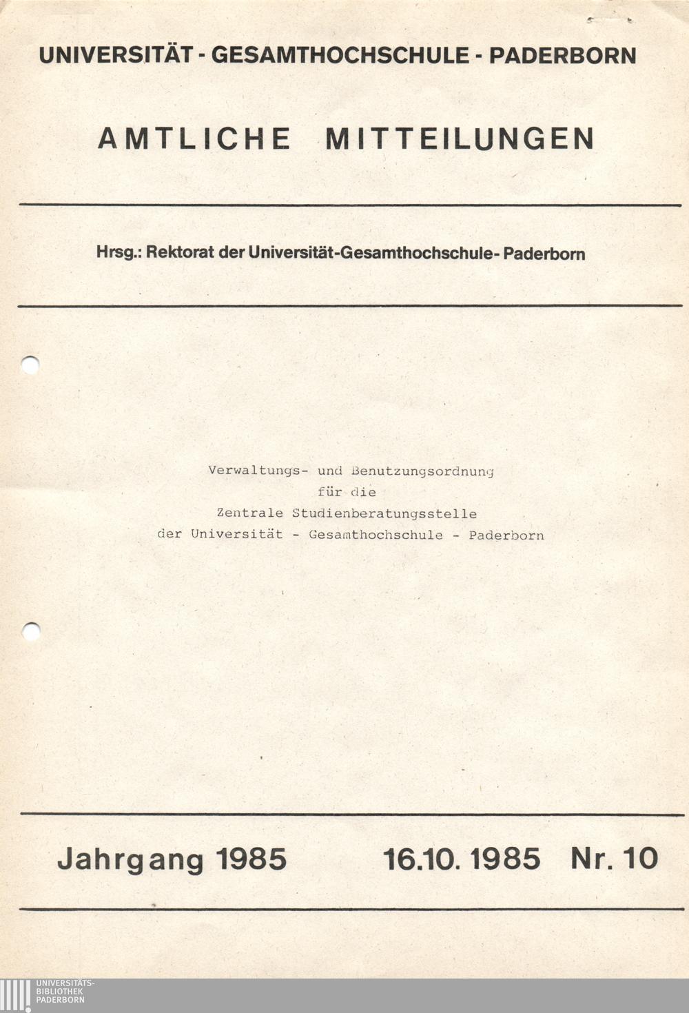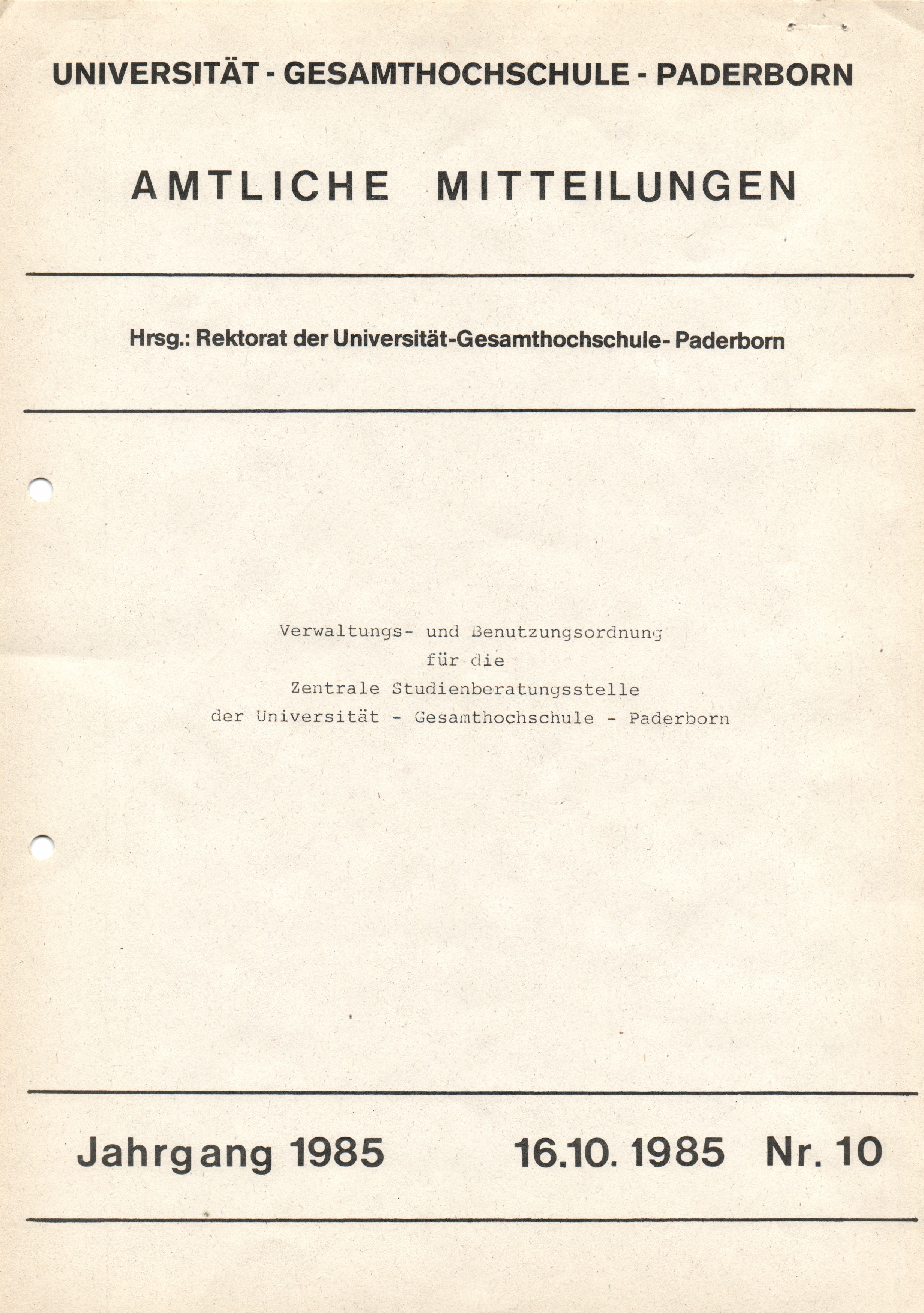 Verwaltungs- und Benutzungsordnung für die Zentrale Studienberatungsstelle der Universität - Gesamthochschule - Paderborn : 16.10.1985
