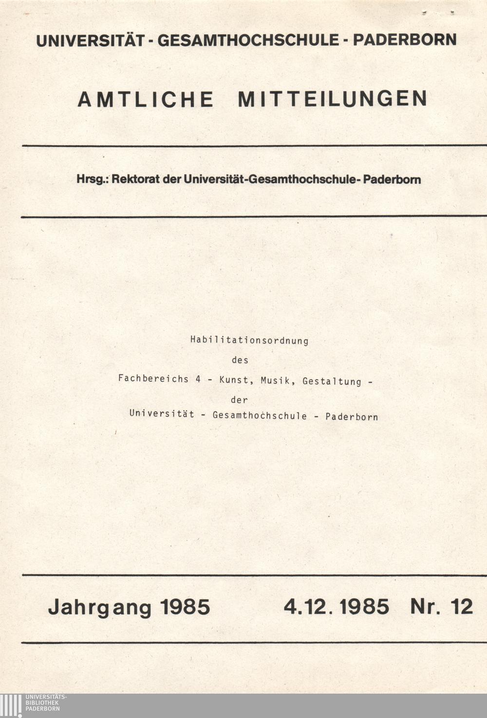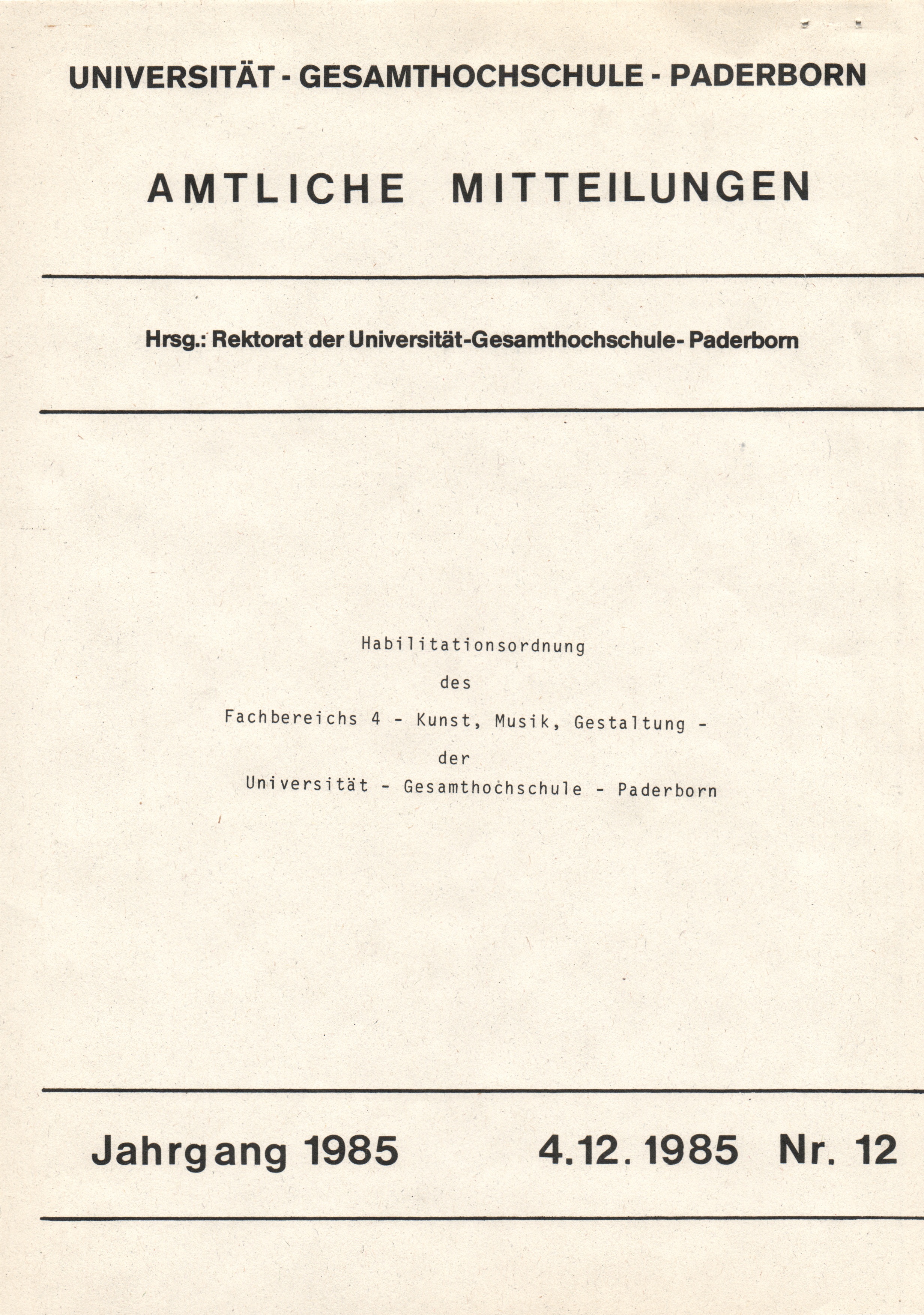 Habilitationsordnung des Fachbereichs 4 - Kunst, Musik, Gestaltung - der Universität - Gesamthochschule - Paderborn : 4.12.1985