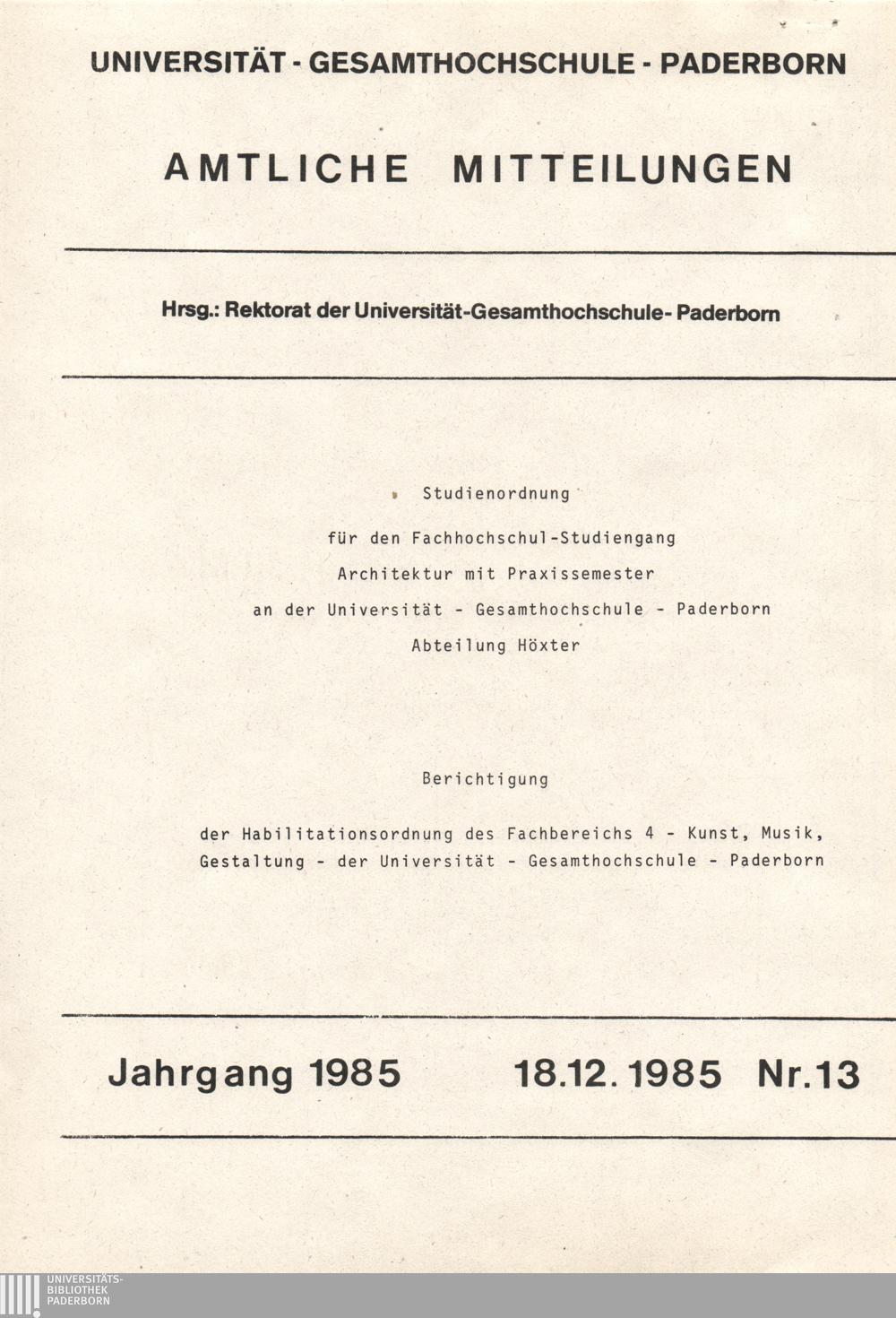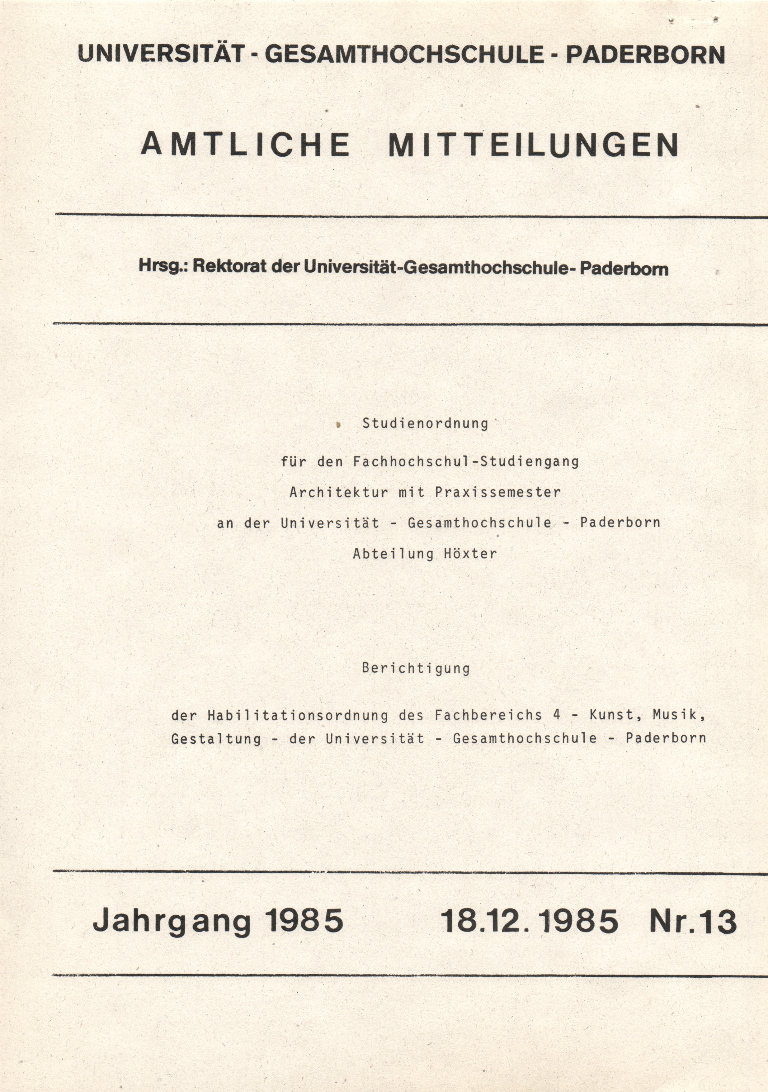 Studienordnung für den Fachhochschul-Studiengang Architektur mit Praxissemester and der Universität - Gesamthochschule - Paderborn, Abteilung Höxter : 18.12.1985