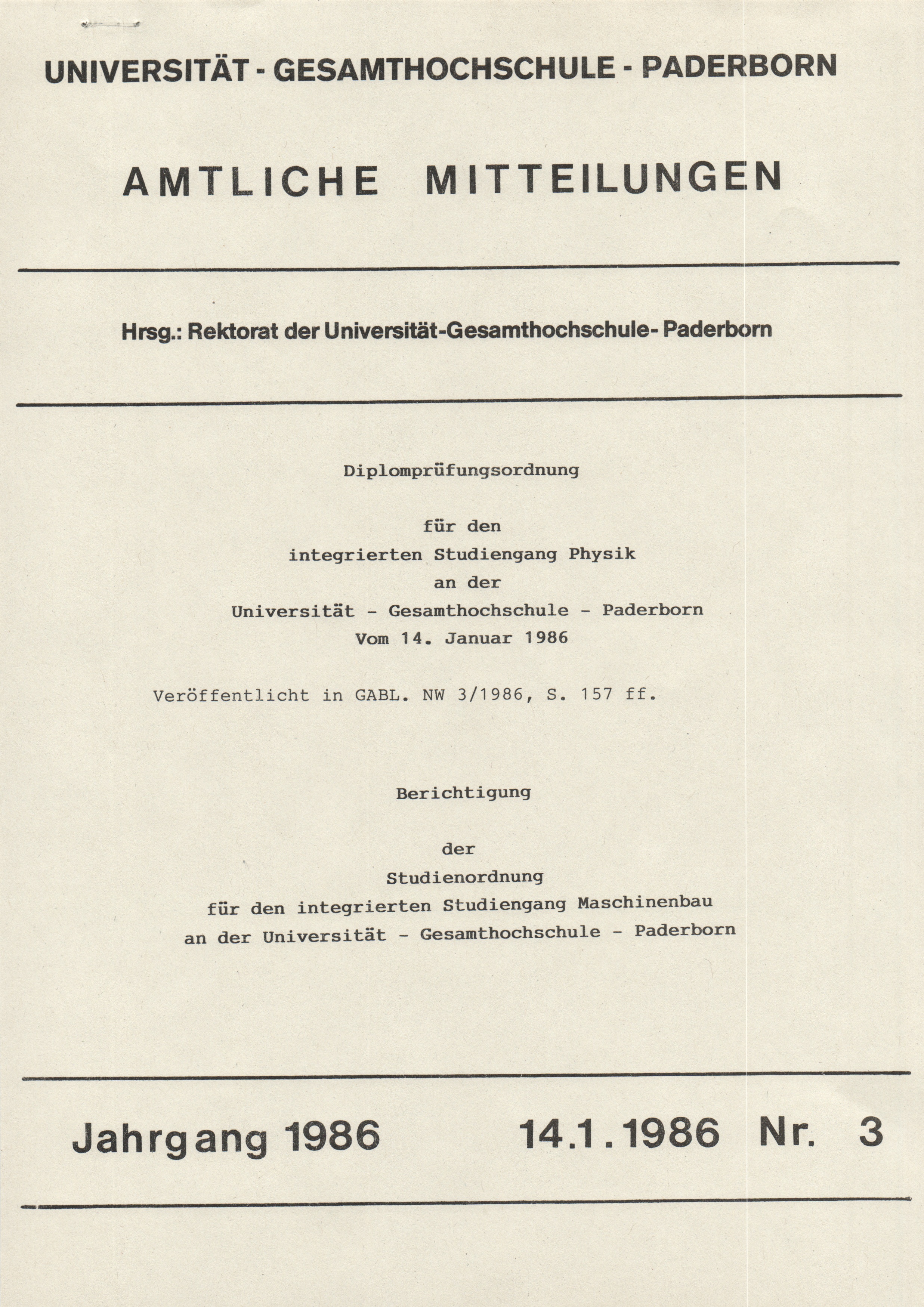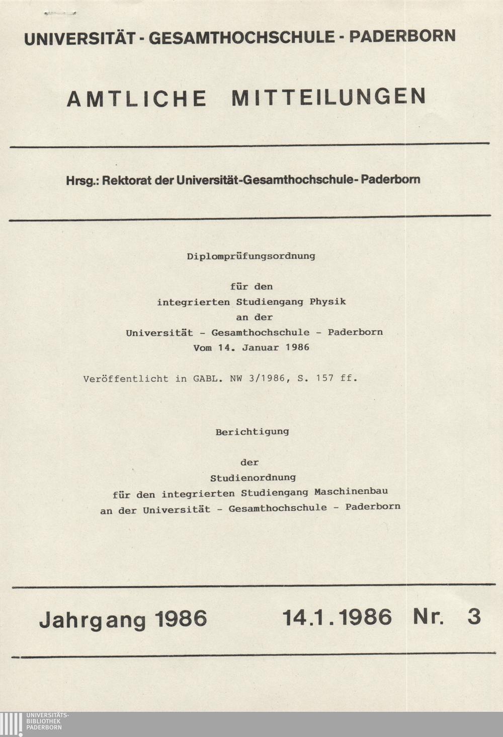 Diplomprüfungsordnung für den integrierten Studiengang Physik an der Universität - Gesamthochschule - Paderborn vom 14. Januar 1986, Veröffenlicht in GABL. NW 3/1986, S. 157 ff. : vom 14. Januar 1986 ; veröffenlicht in GABL. NW 3/1986, S. 157 ff.