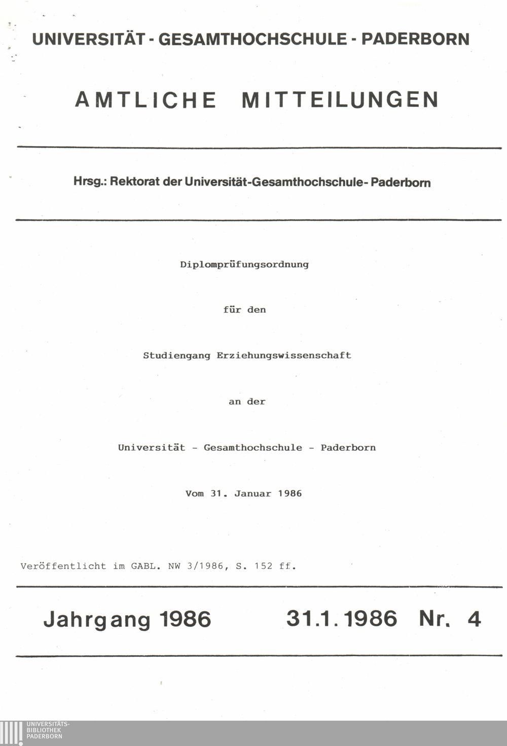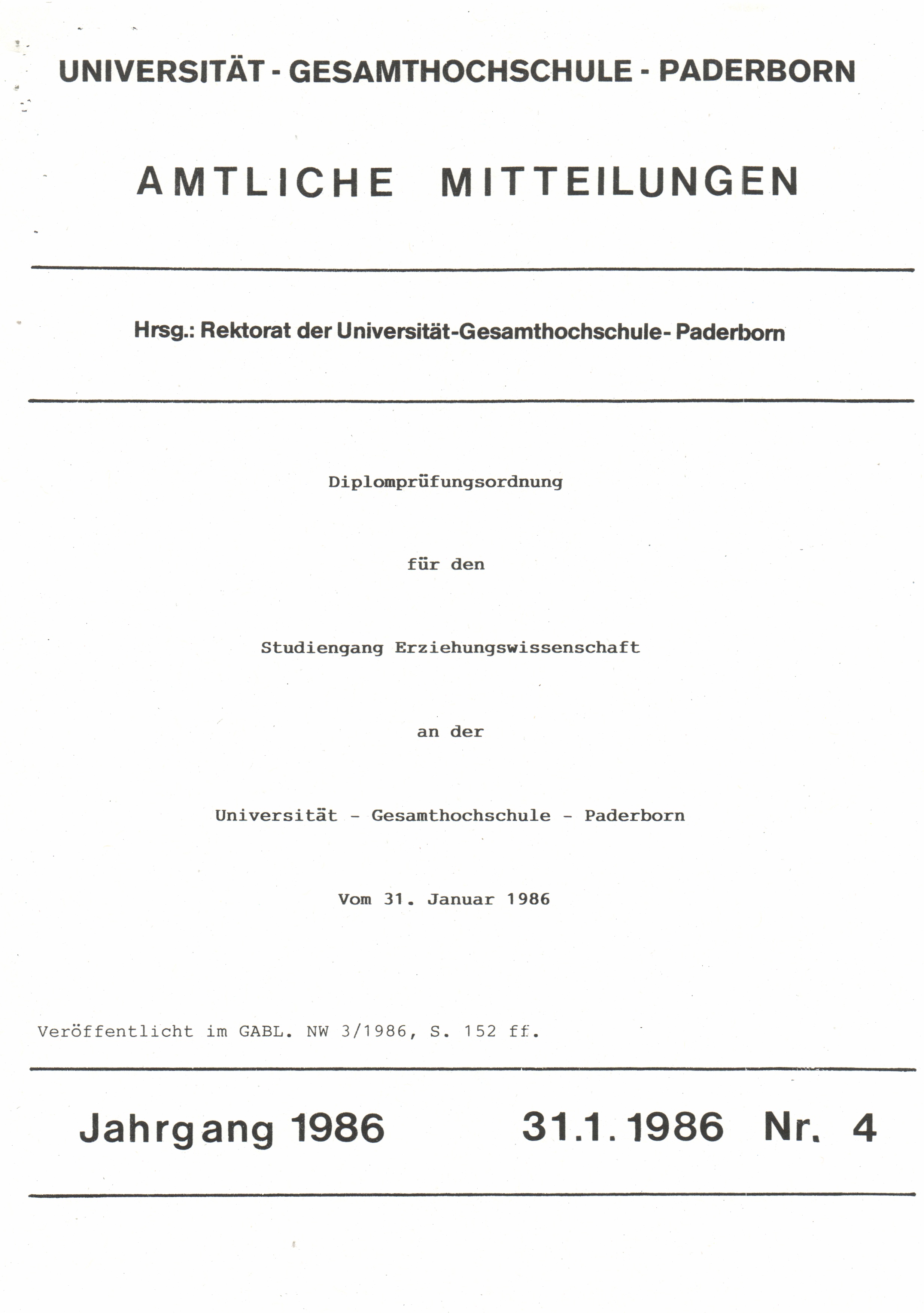 Diplomprüfungsordnung für den Studiengang Erziehungswissenschaft an der Universität - Gesamthochschule - Paderborn vom 31. Januar 1986, Veröffenlicht in GABL. NW 3/1986, S. 152 ff : 31.1.1986