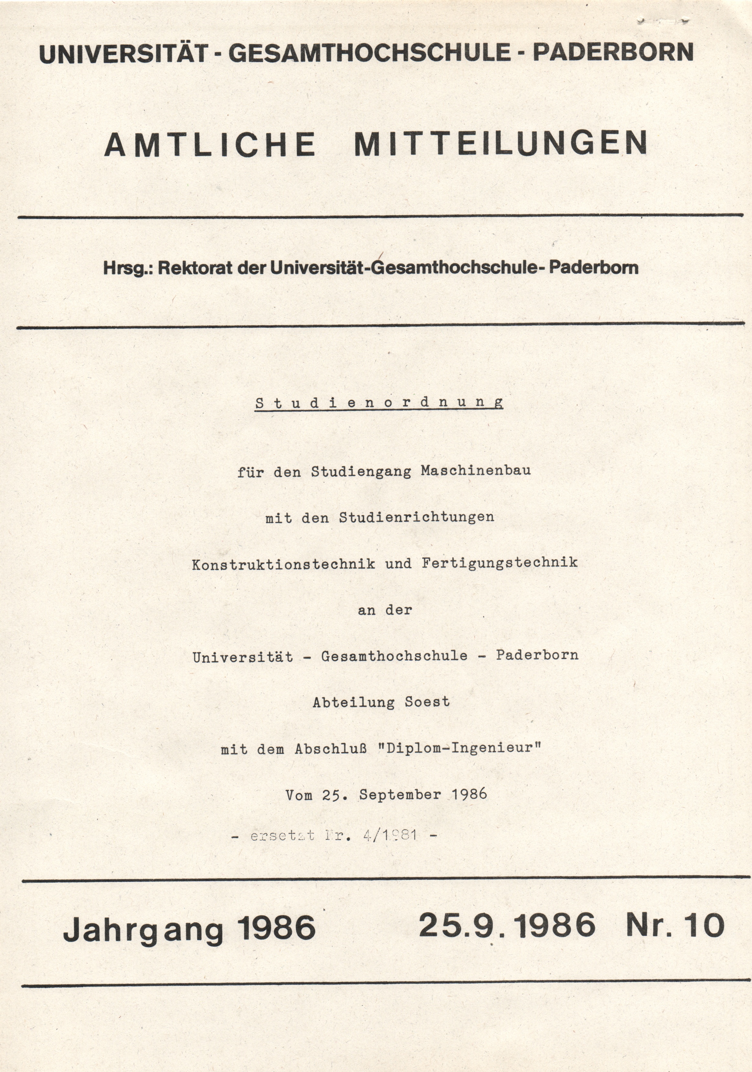 Studienordnung für den Studiengang Maschinenbau mit den Studienrichtungen Konstruktionstechnik und Fertigungstechnik an der Universität - Gesamthochschule - Paderborn, Abteilung Soest mit dem Abschluß "Diplom-Ingenieur" vom 25. September 1986 - ersetzt Nr. 4/1981 - : 25.9.1986