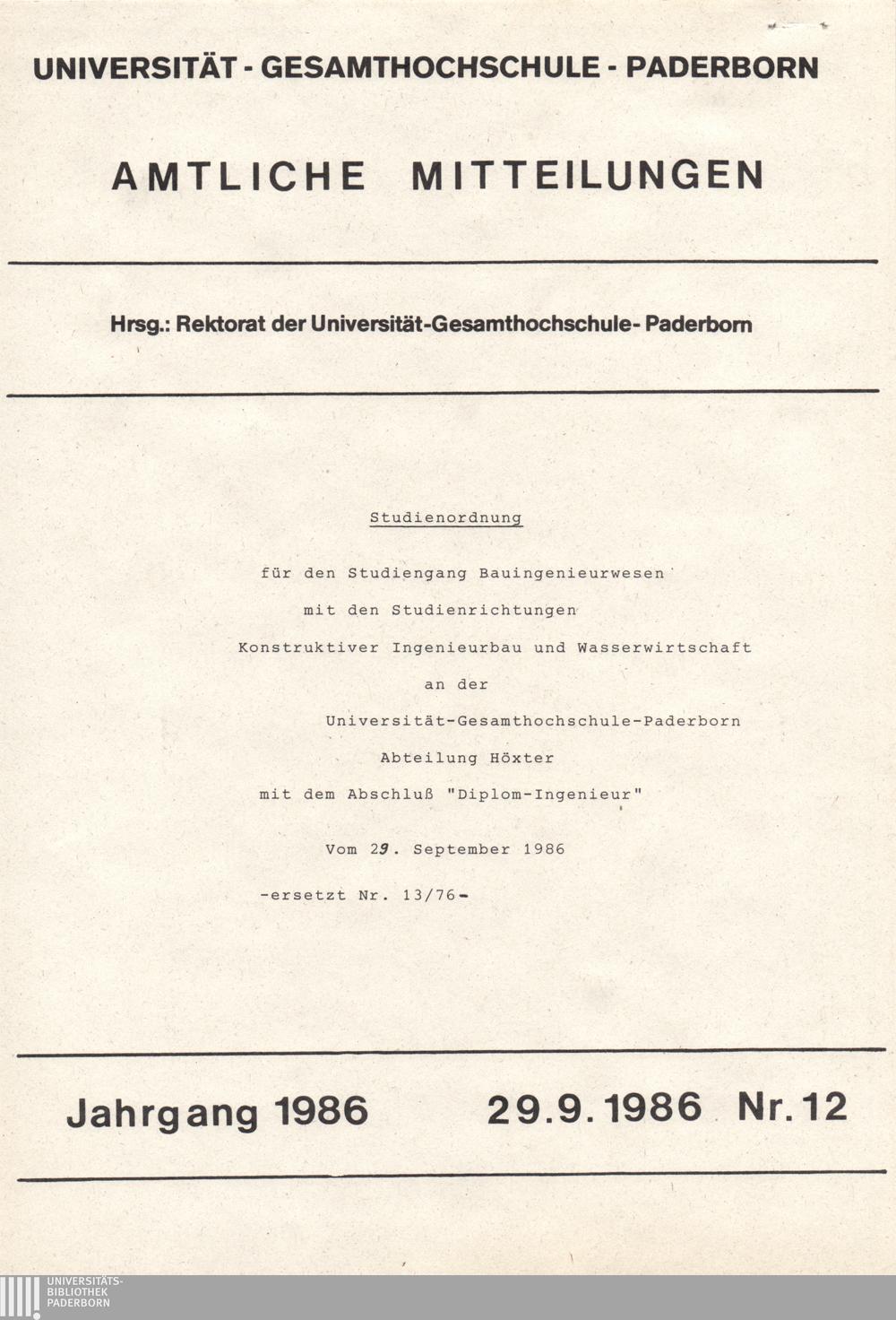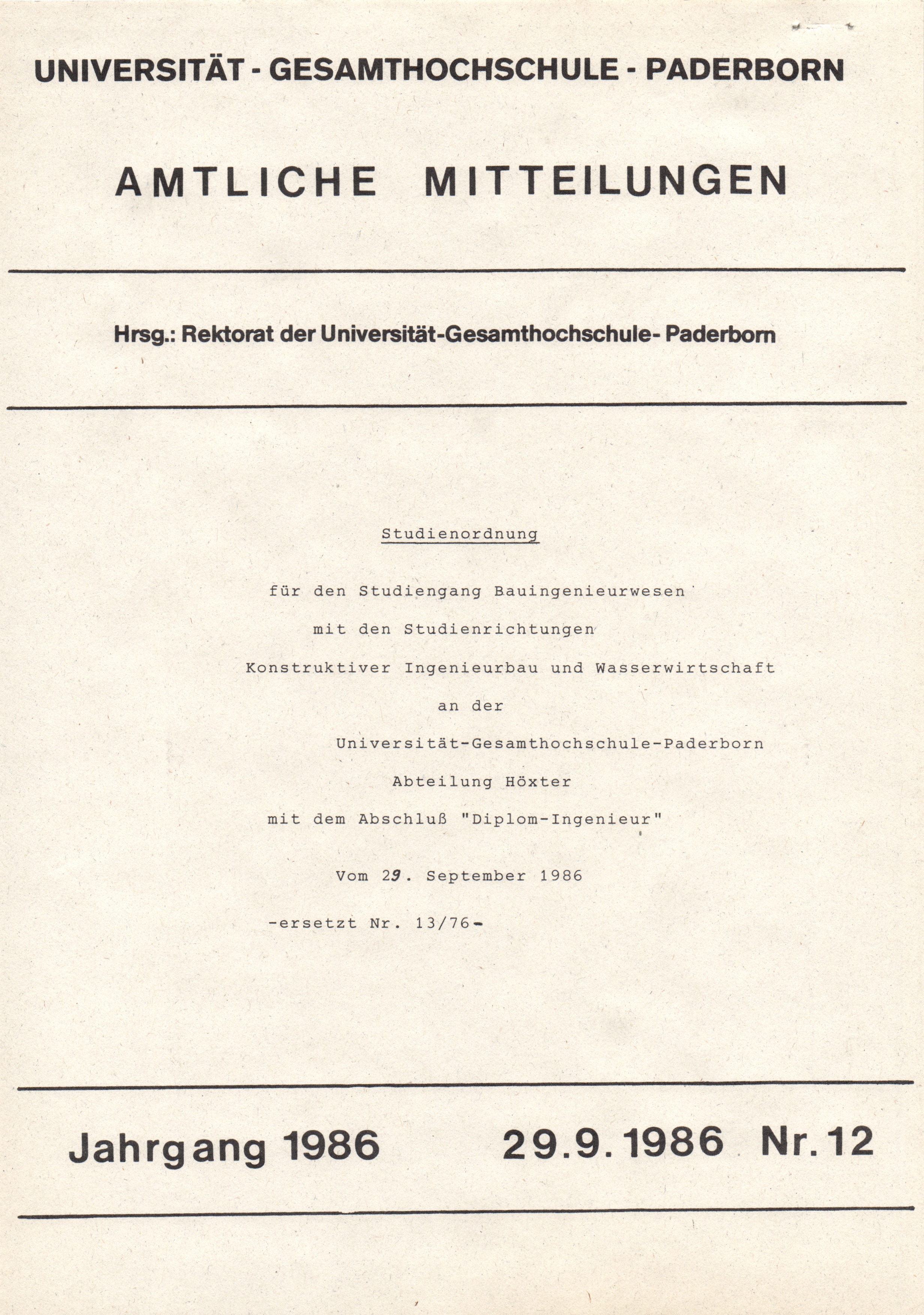 Studienordnung für den Studiengang Bauingenieurwesen mit den Studienrichtungen Konstruktiver Ingenieurbau und Wasserwirtschaft an der Universität - Gesamthochschule - Paderborn, Abteilung Höxter mit dem Abschluß "Diplom-Ingenieur" vom 25. September 1986 - ersetzt Nr. 13/1976 - : 25.9.1986