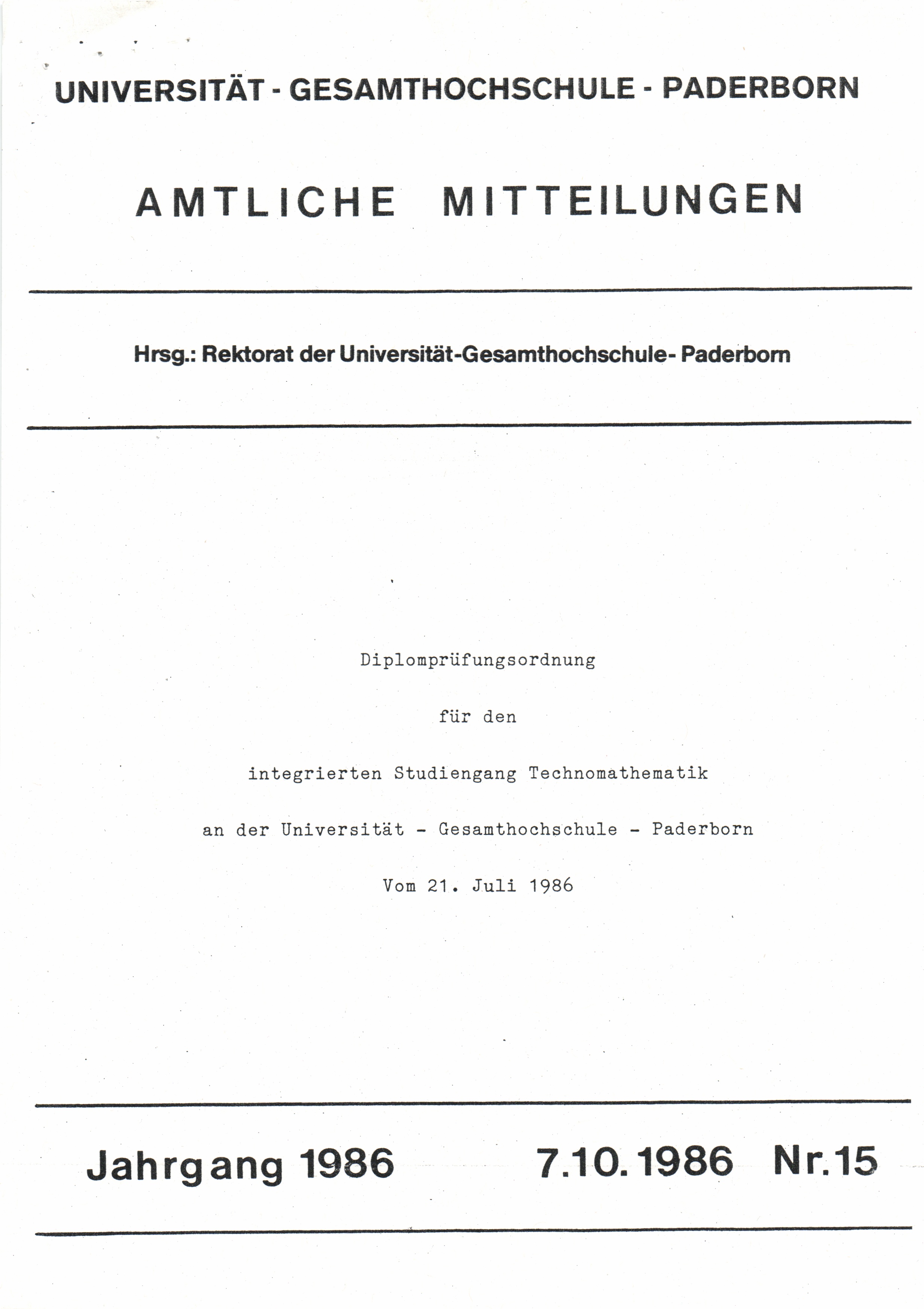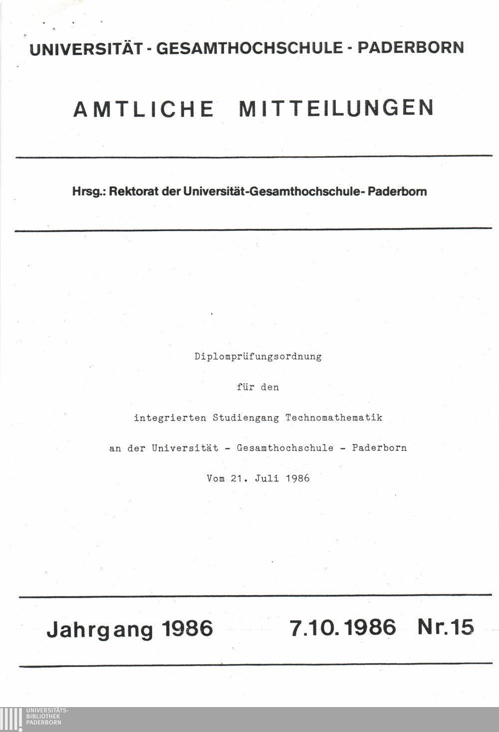 Diplomprüfungsordnung für den integrierten Studiengang Technomathematik an der Universität - Gesamthochschule - Paderborn vom 21. Juli. 1986 : 7.10.1986