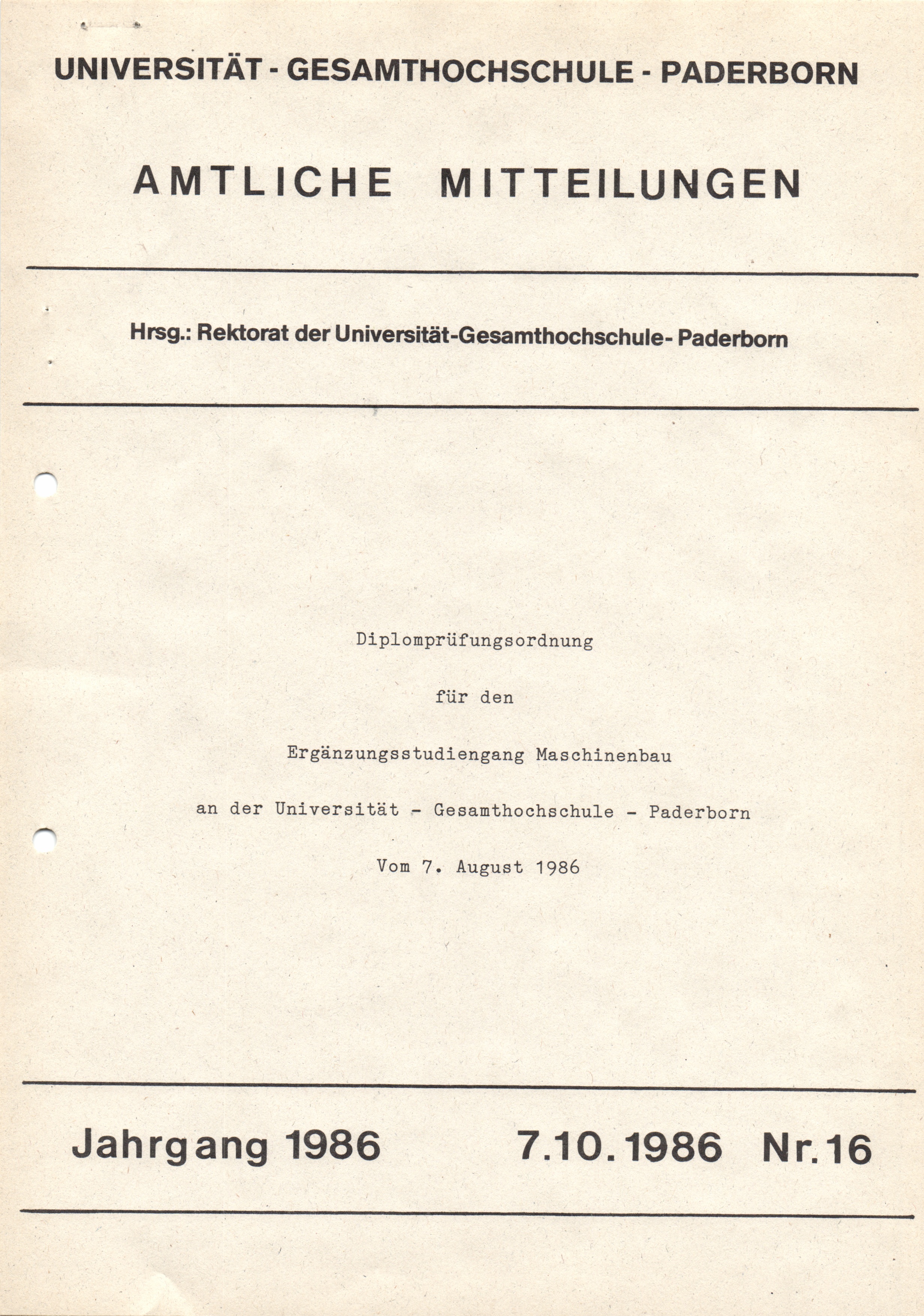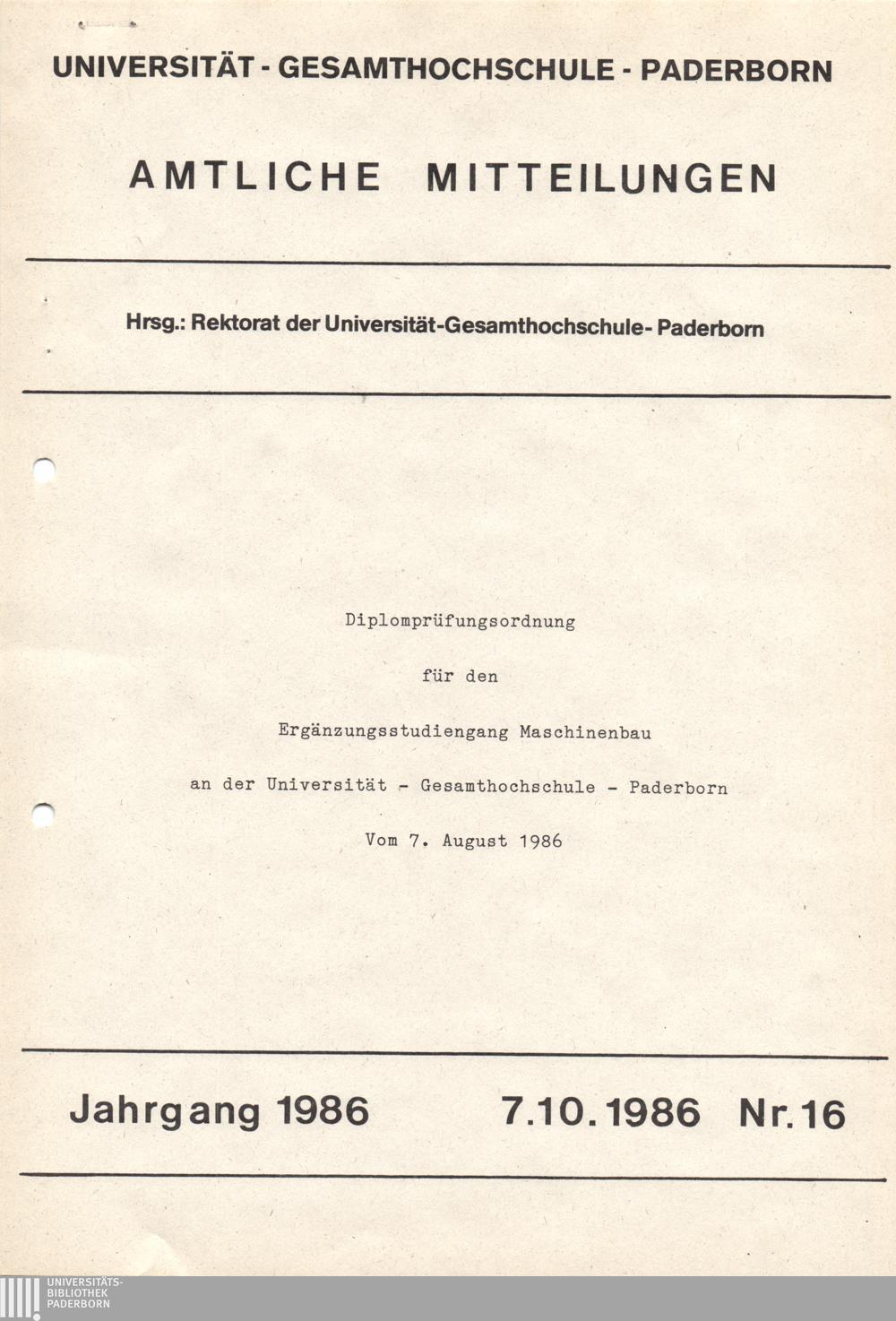 Diplomprüfungsordnung für den Ergänzungsstudiengang Maschinenbau an der Universität - Gesamthochschule - Paderborn vom 7. August 1986 : 7.10.1986