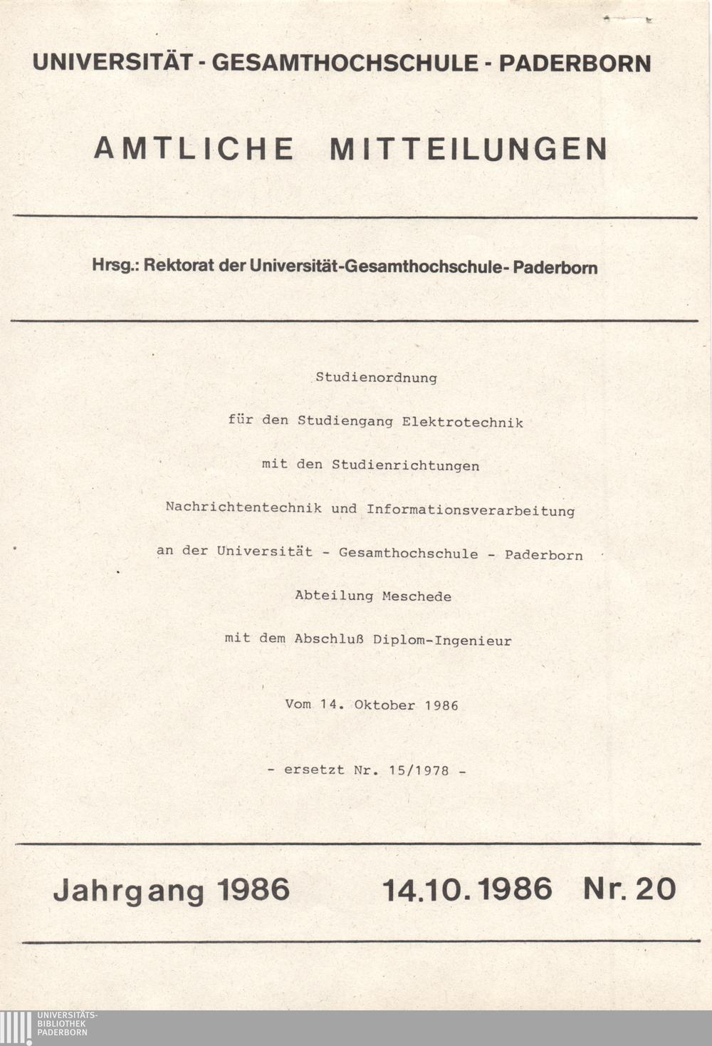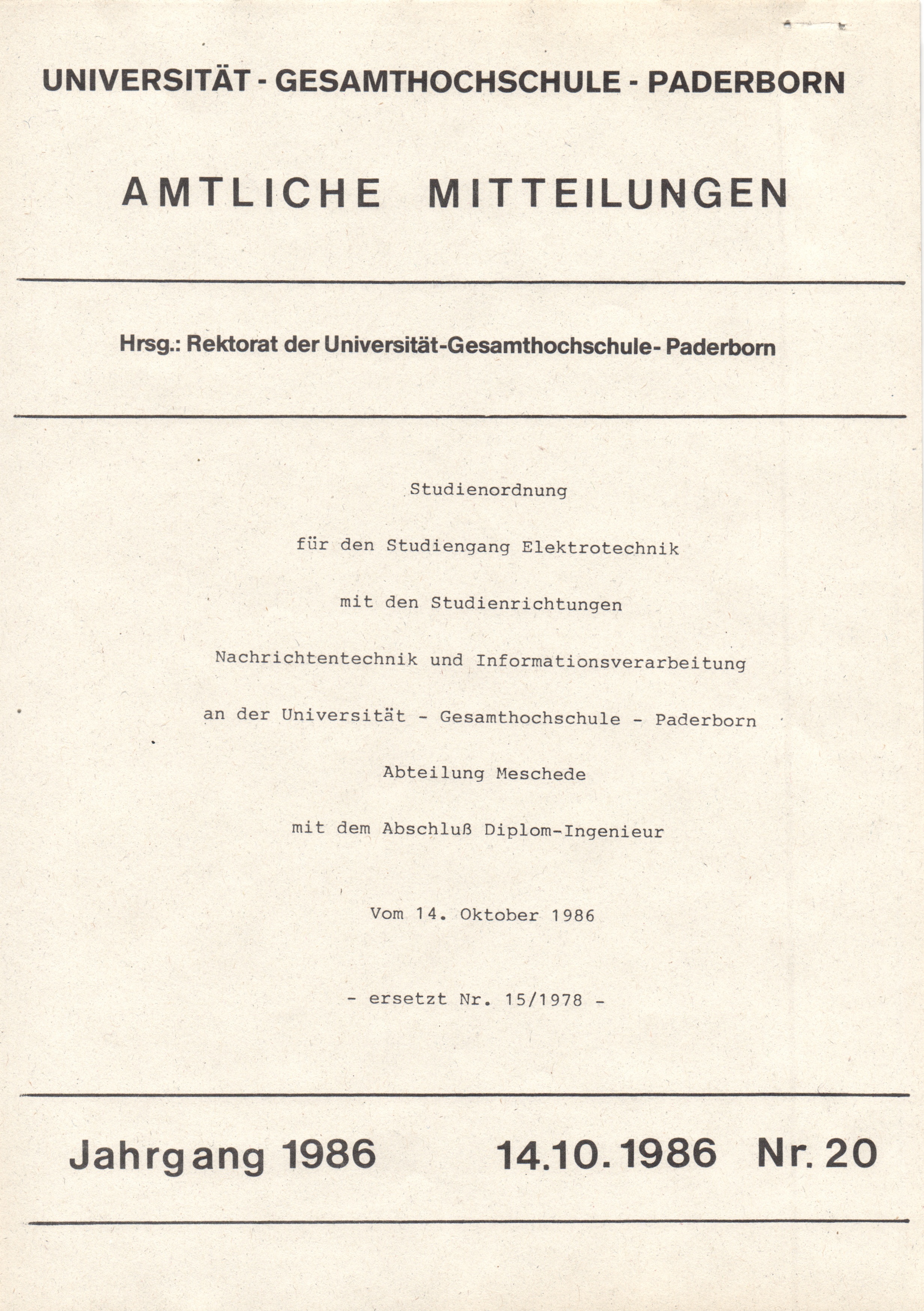 Studienordnung für den Studiengang Elektrotechnik mit den Studienrichtungen Nachrichtentechnik und Informationsverarbeitung an der Universität - Gesamthochschule - Paderborn, Abteilung Meschede mit dem Abschluß Diplom-Ingenieur vom 14. Oktober 1986 - ersetzt Nr. 15/1978 - : 14.10.1986