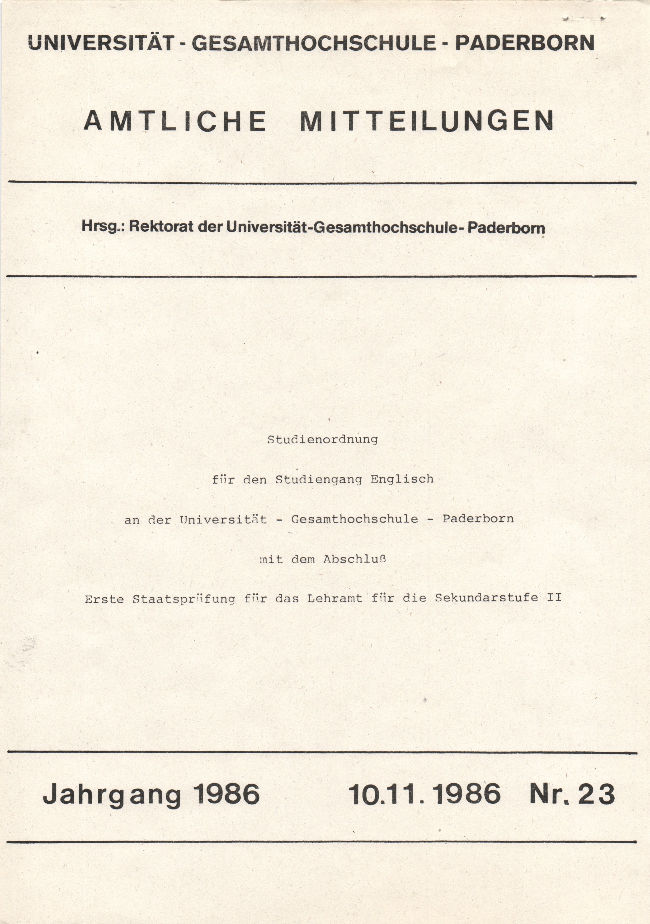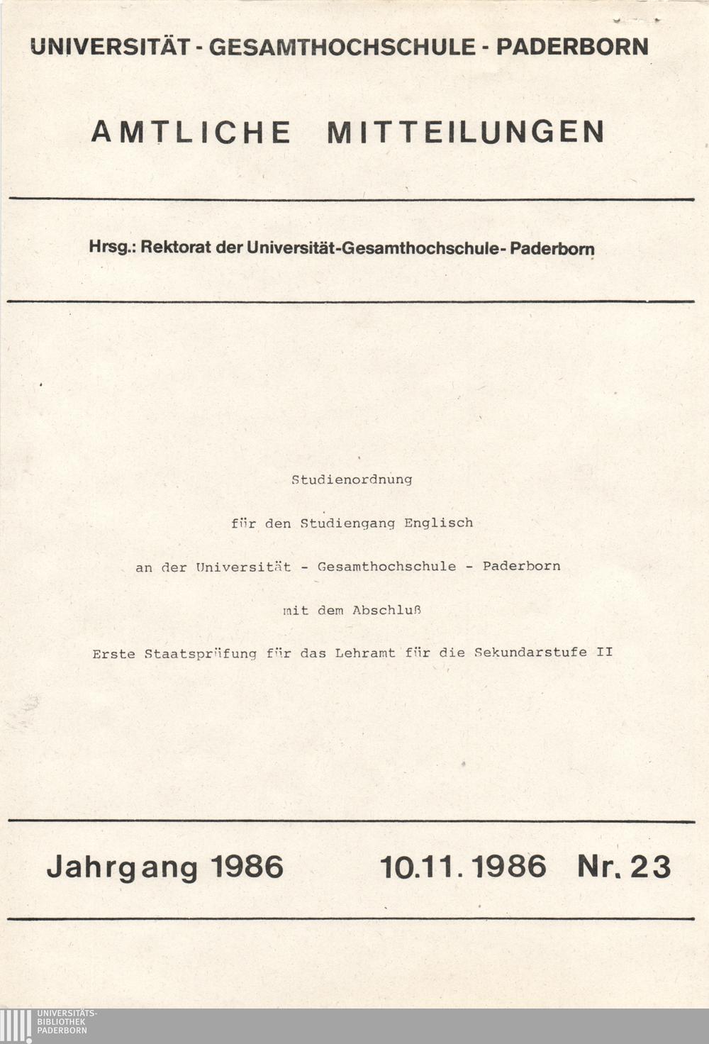 Studienordnung für den Studiengang Englisch an der Universität - Gesamthochschule - Paderborn mit dem Abschluß Erste Staatsprüfung für das Lehramt für die Sekundarstufe II : 10.11.1986
