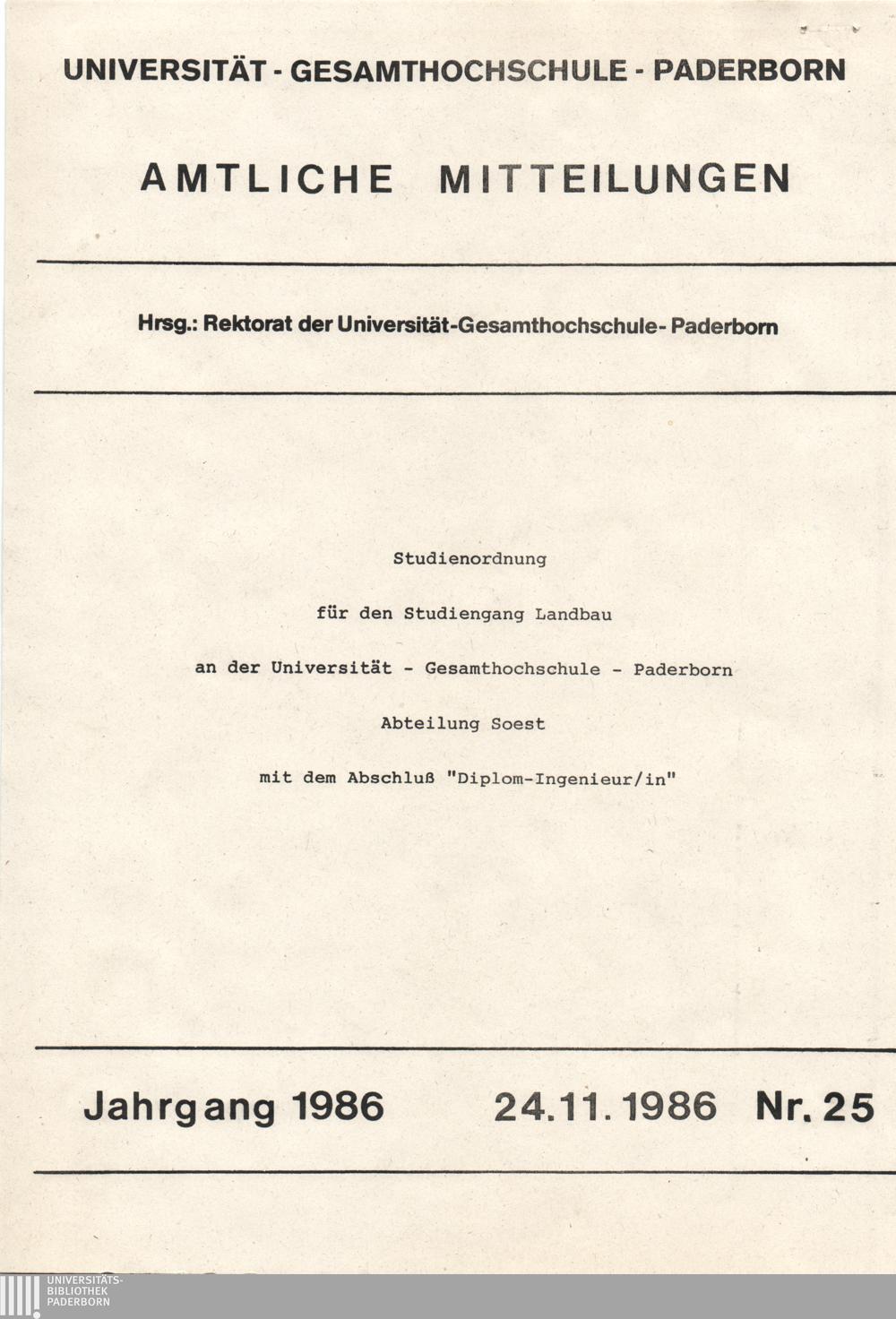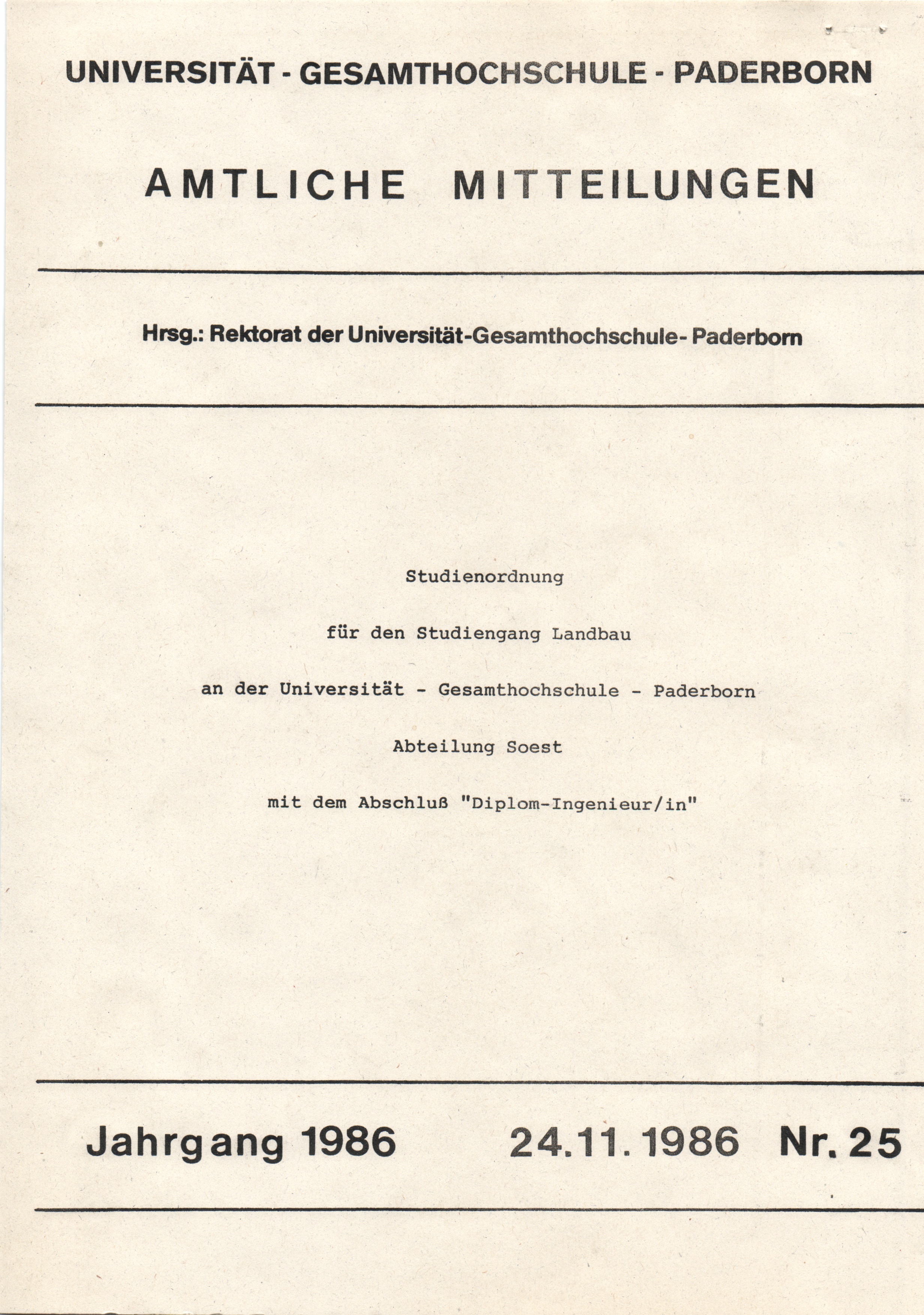 Studienordnung für den Studiengang Landbau an der Universität - Gesamthochschule - Paderborn, Abteilung Soest mit dem Abschluß "Diplom-Ingenieur/in" : 24.11.1986