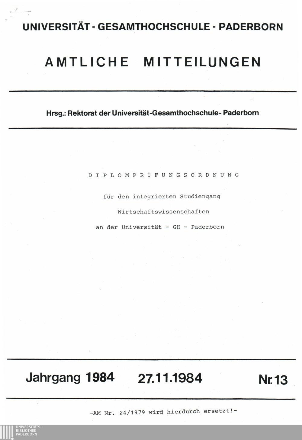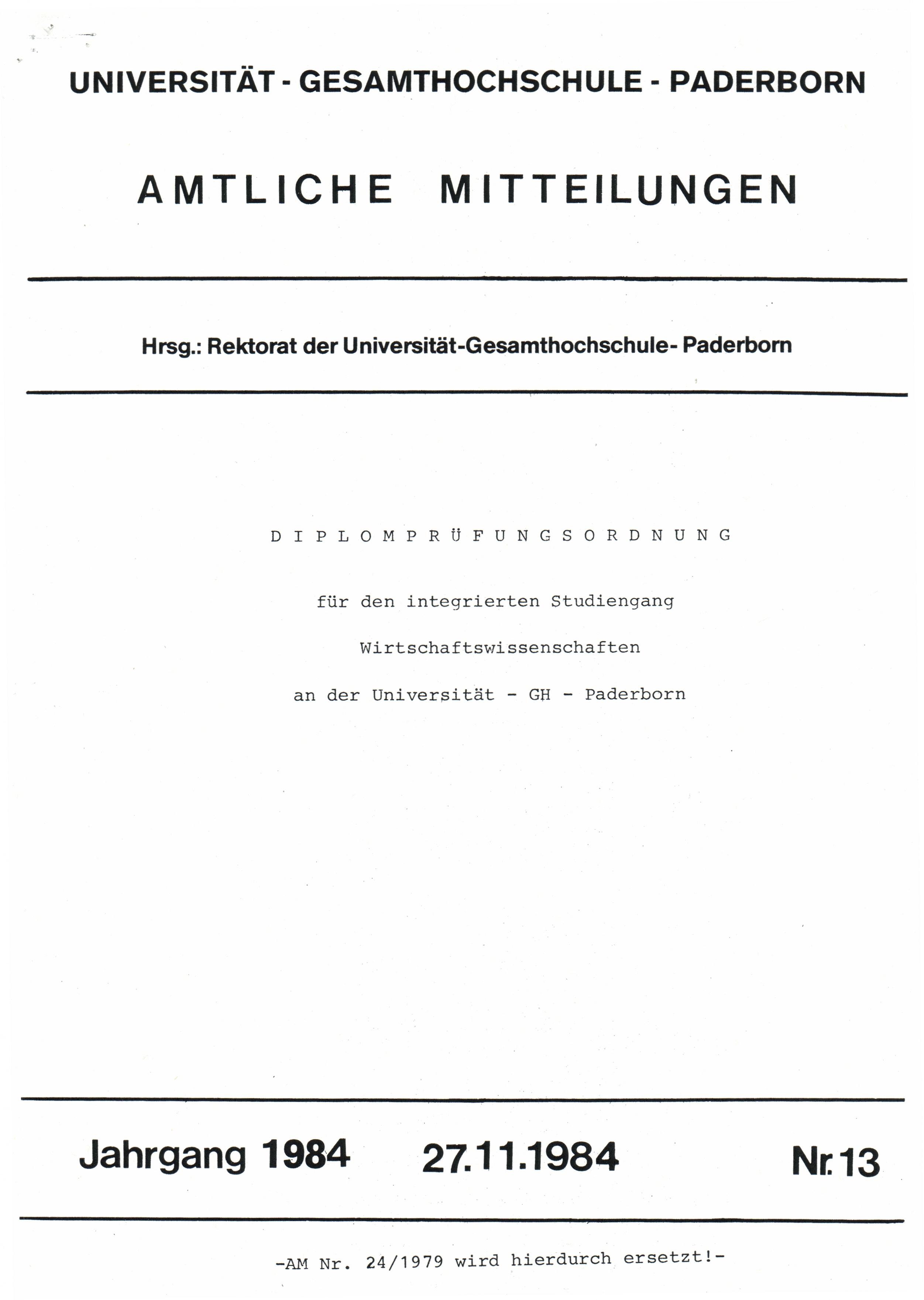 Diplomprüfungsordnung für den integrierten Studiengang Wirtschaftswissenschaften an der Universität-GH - Paderborn : 27.11.1984
